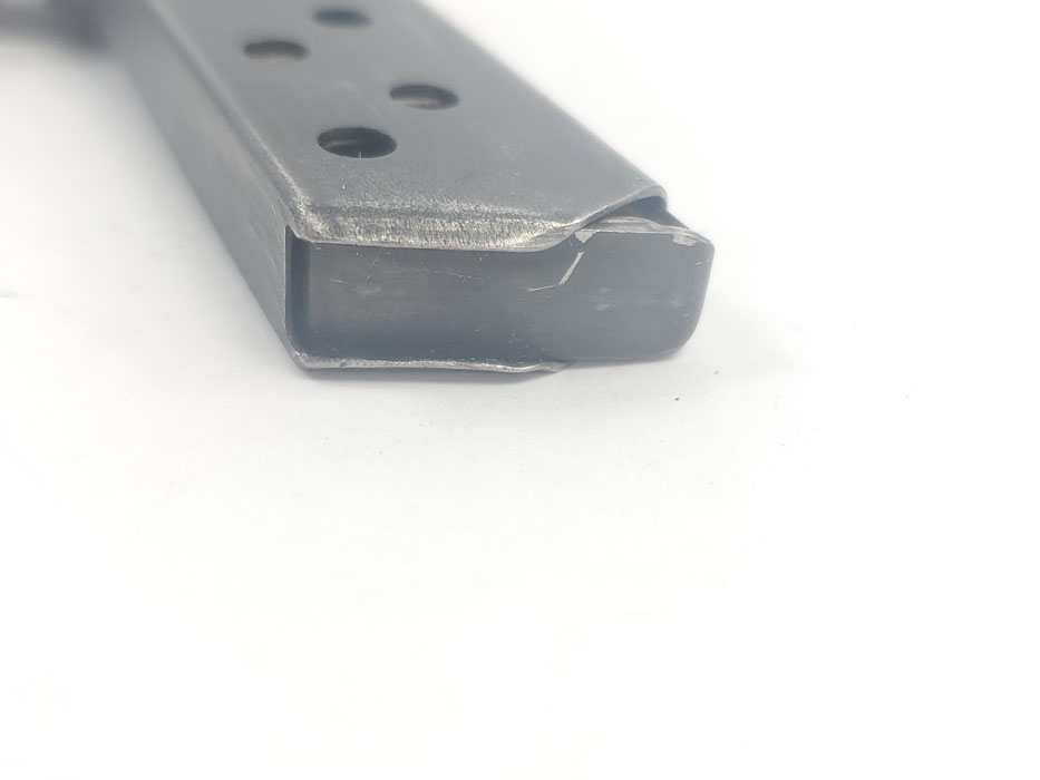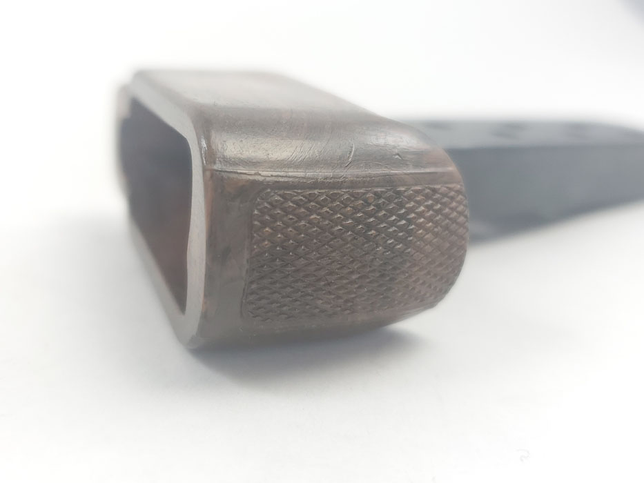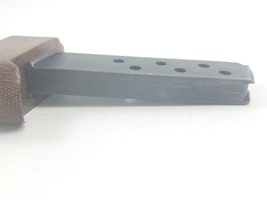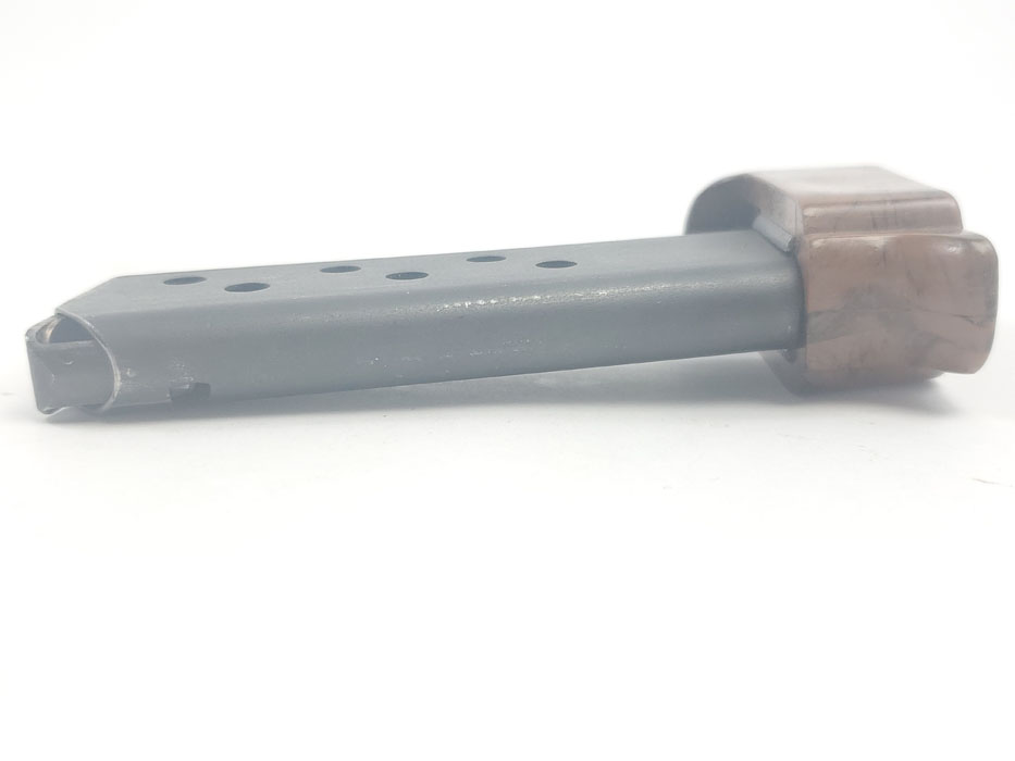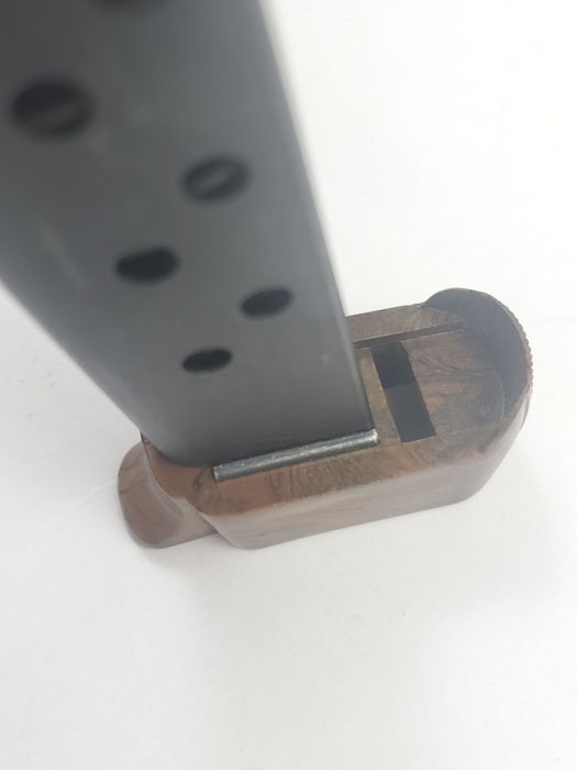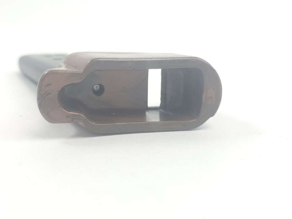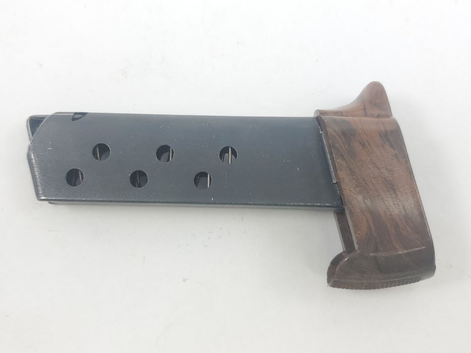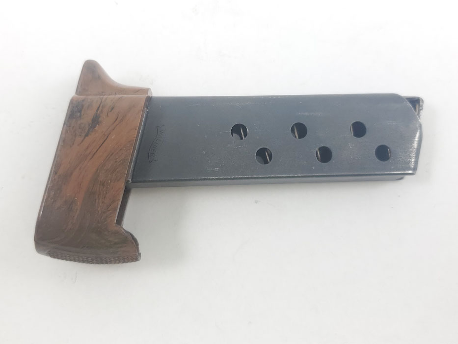 3/30/20 – This is an excellent, original, and rare Walther PPK magazine with a brown boxed finger extension. The magazine is a WW2 era transitional variation with a Walther banner stamp and a duller wartime finish. The magazine has minimal wear on the tube. Strong fully functional spring. The brown bakelite finger extension is extra large for grip comfort. No cracks or chips as shown in photos.