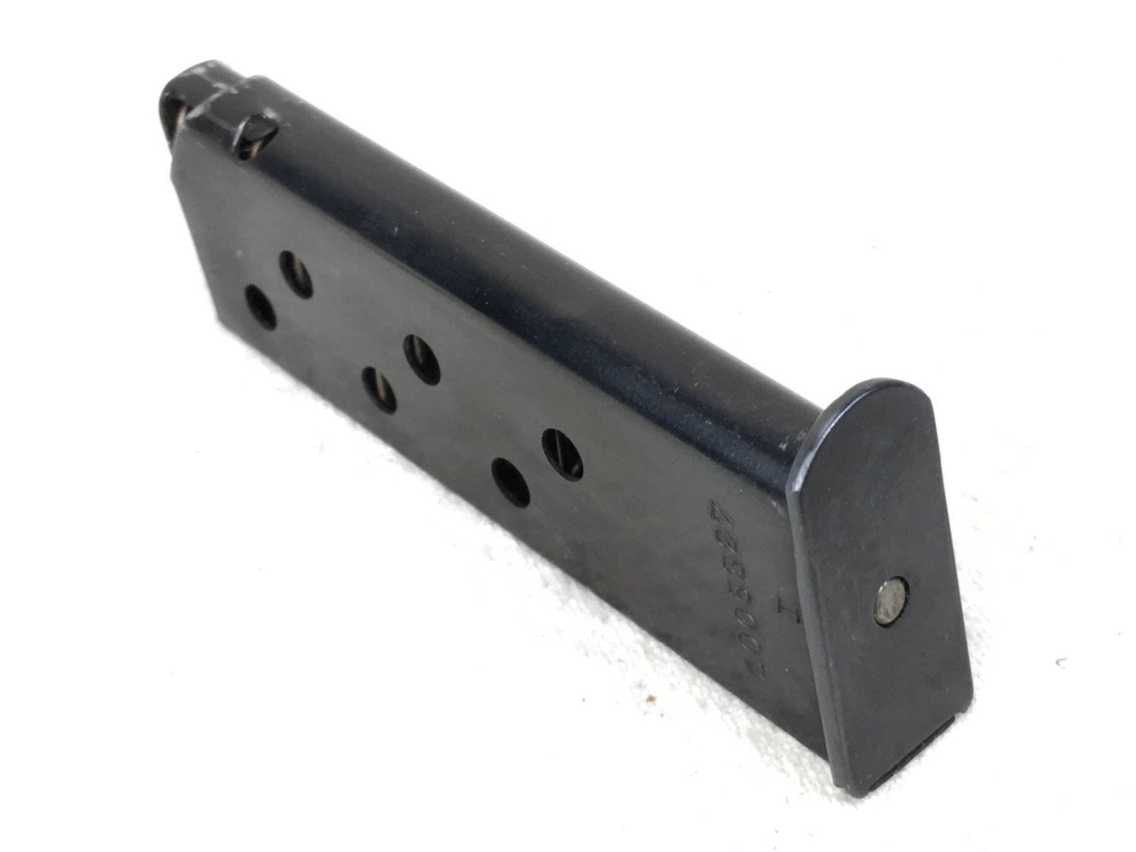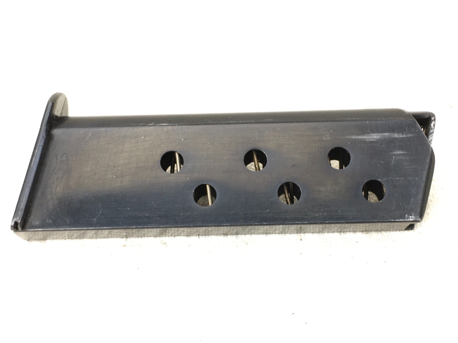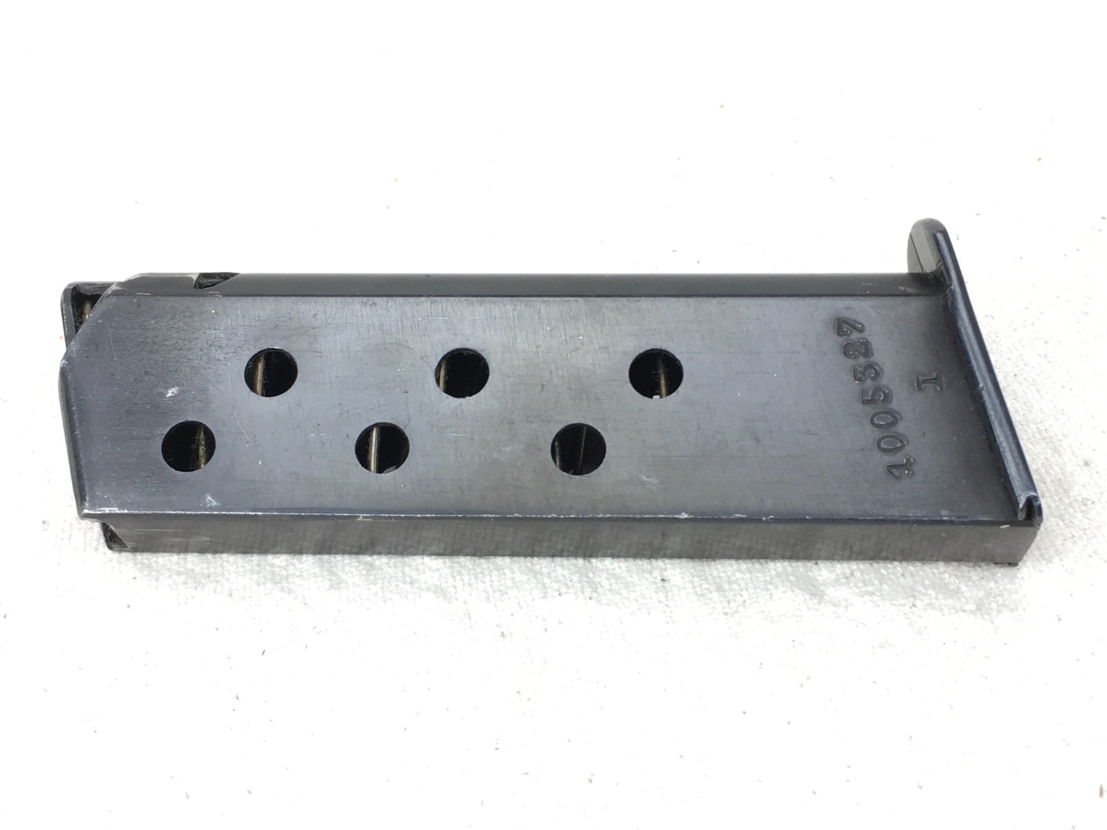 2/26/19 – This is an original, early banner only Walther PPK magazine. Stamped on the right side with Ser# 1005327. Excellent, high polish blued finish with no corrosion minor wear near the top. Strong functional spring.