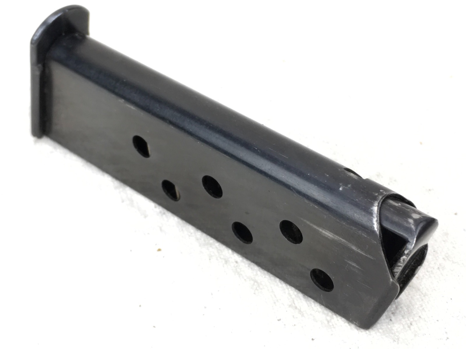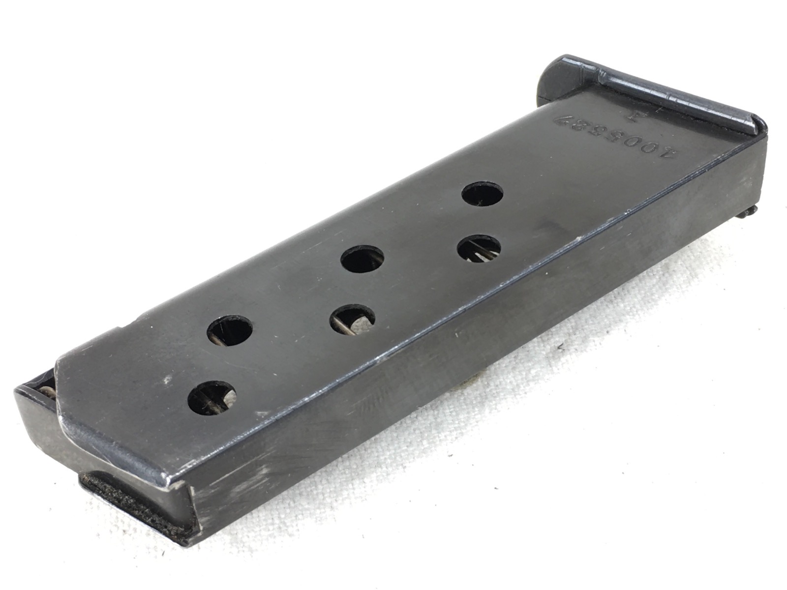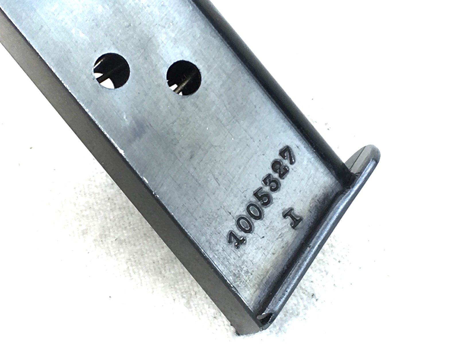 2/26/19 – This is an original, early banner only Walther PPK magazine. Stamped on the right side with Ser# 1005327. Excellent, high polish blued finish with no corrosion minor wear near the top. Strong functional spring.