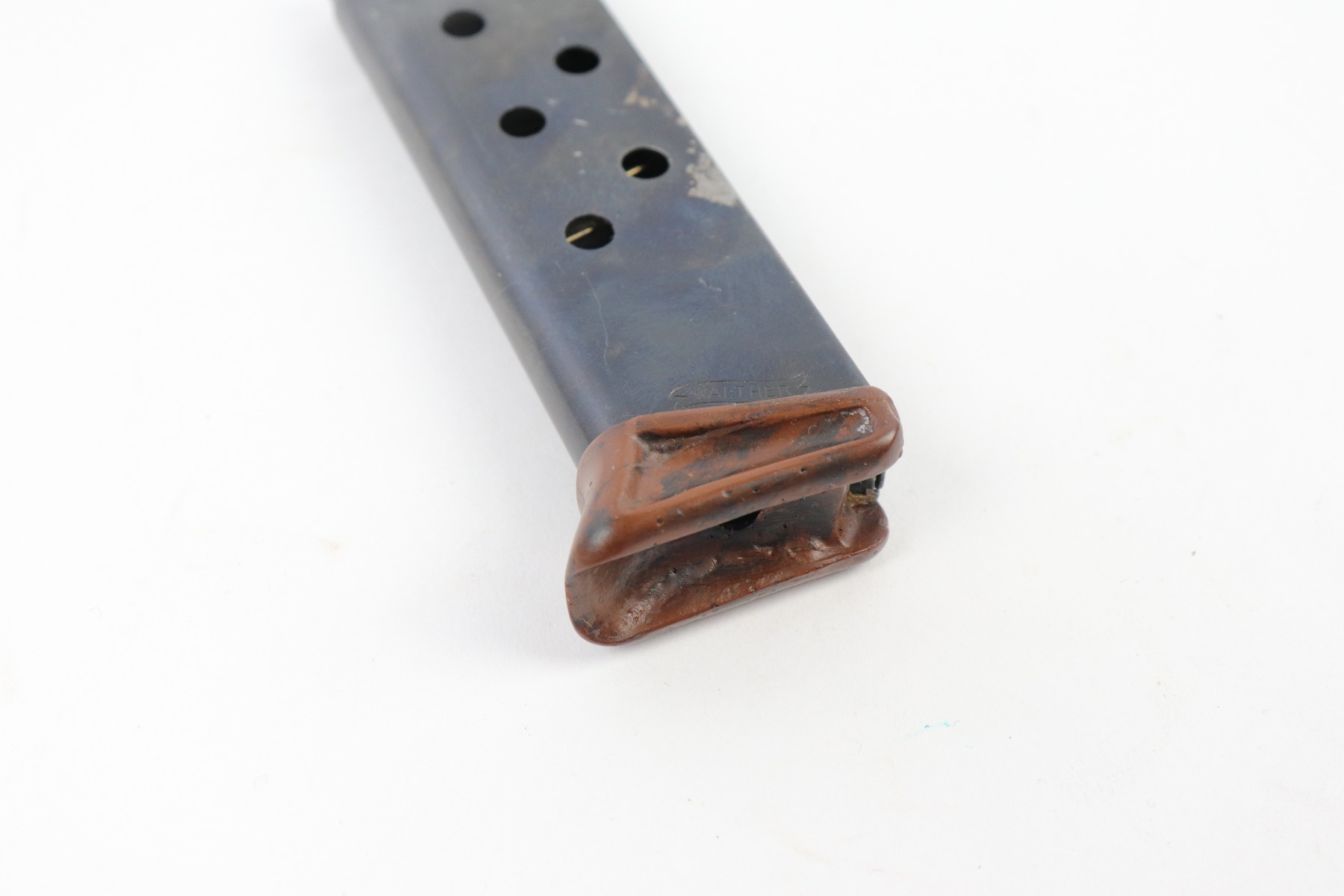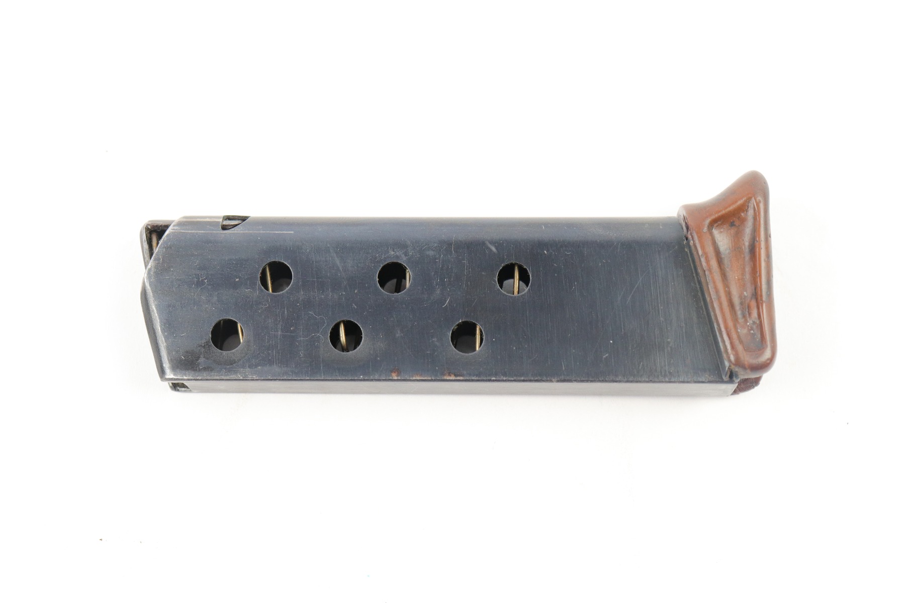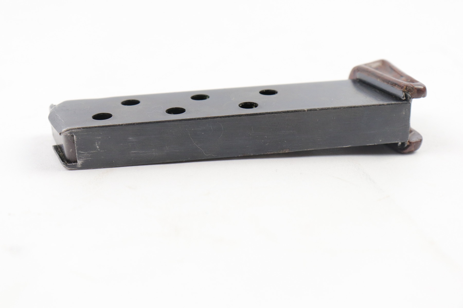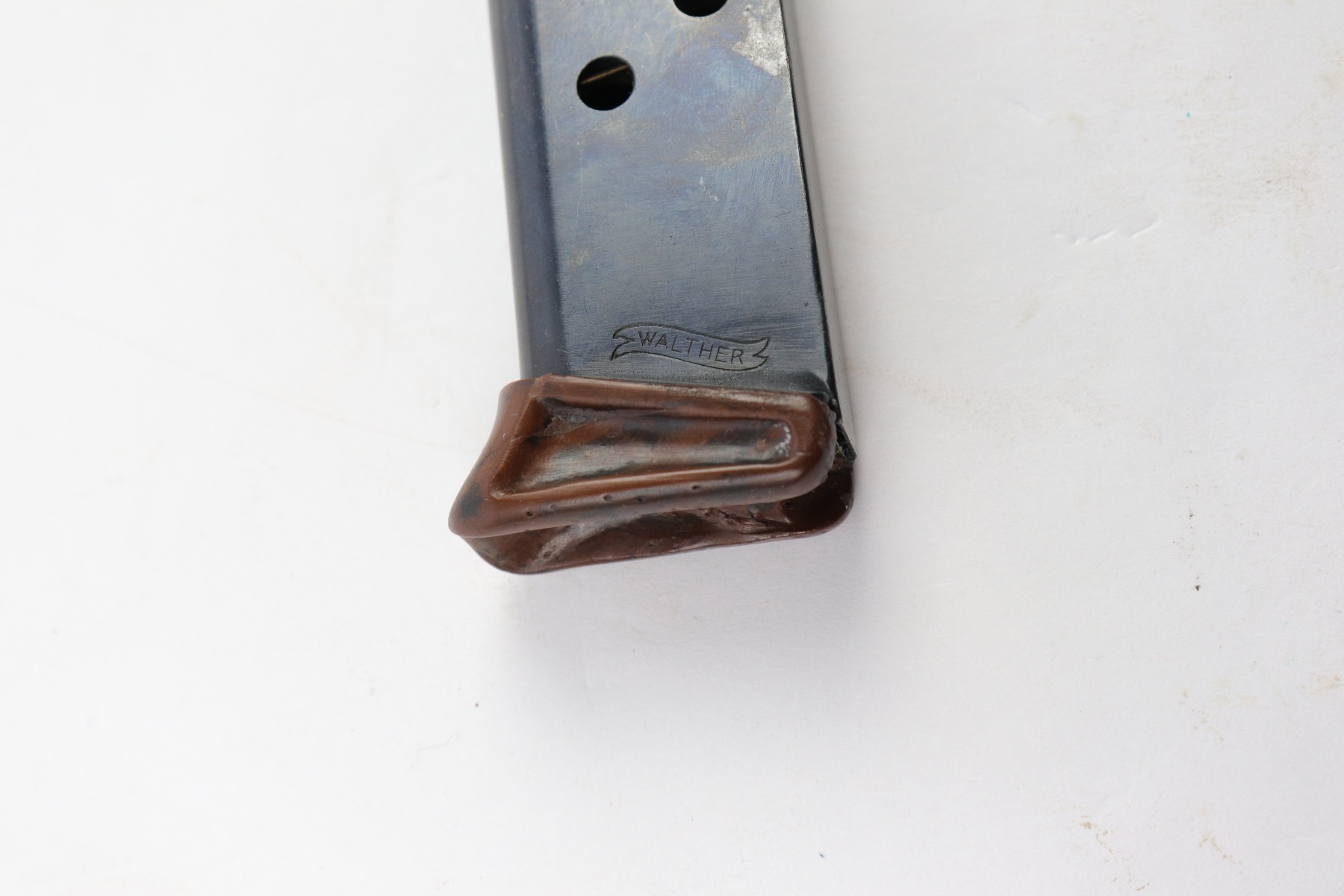 4/4/18 – This is an original Walther PPK magazine from early / pre WW2 with a reproduction finger extension. The magazine frame is original though with a high polish finish and Walther banner stamp. The spring is strong and fully functional. There is some minor bluing loss on the left side of the magazine but overall excellent condition. The base is plastic and not bakelite, but looks just like the real thing.