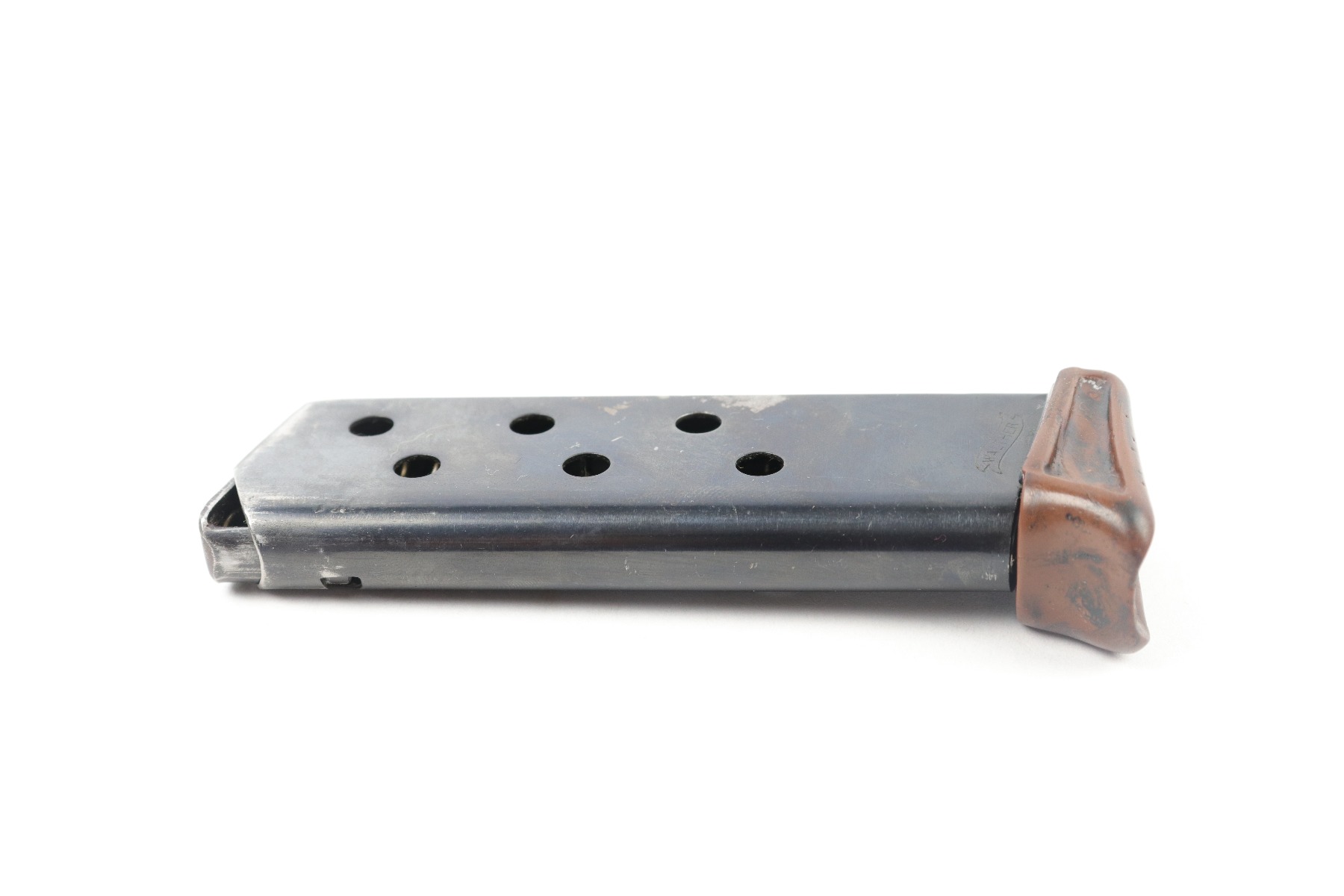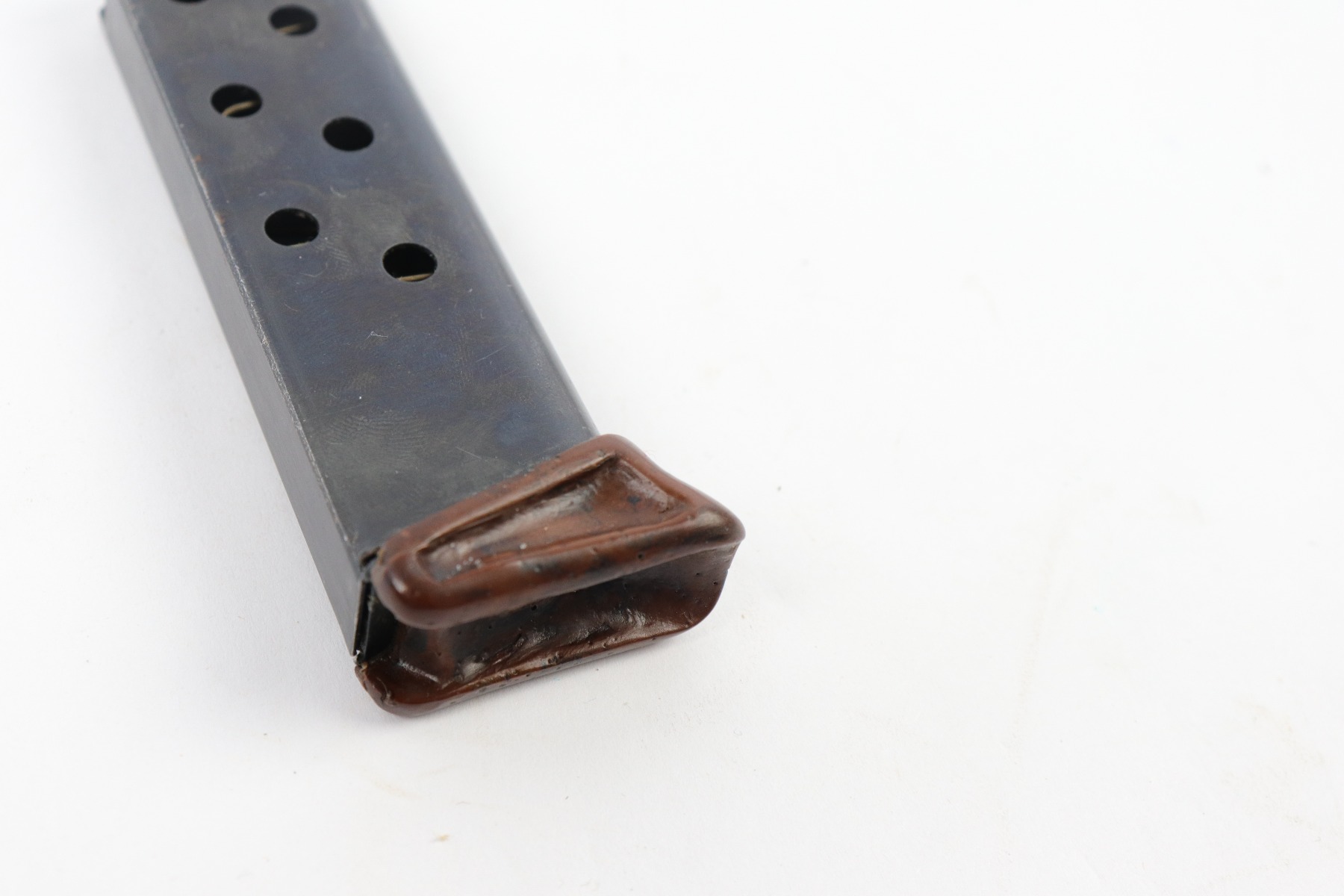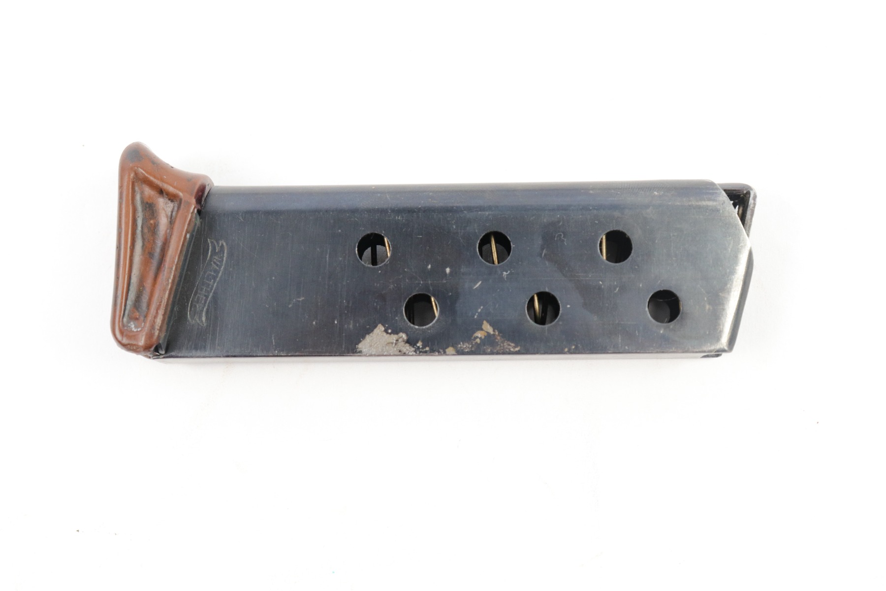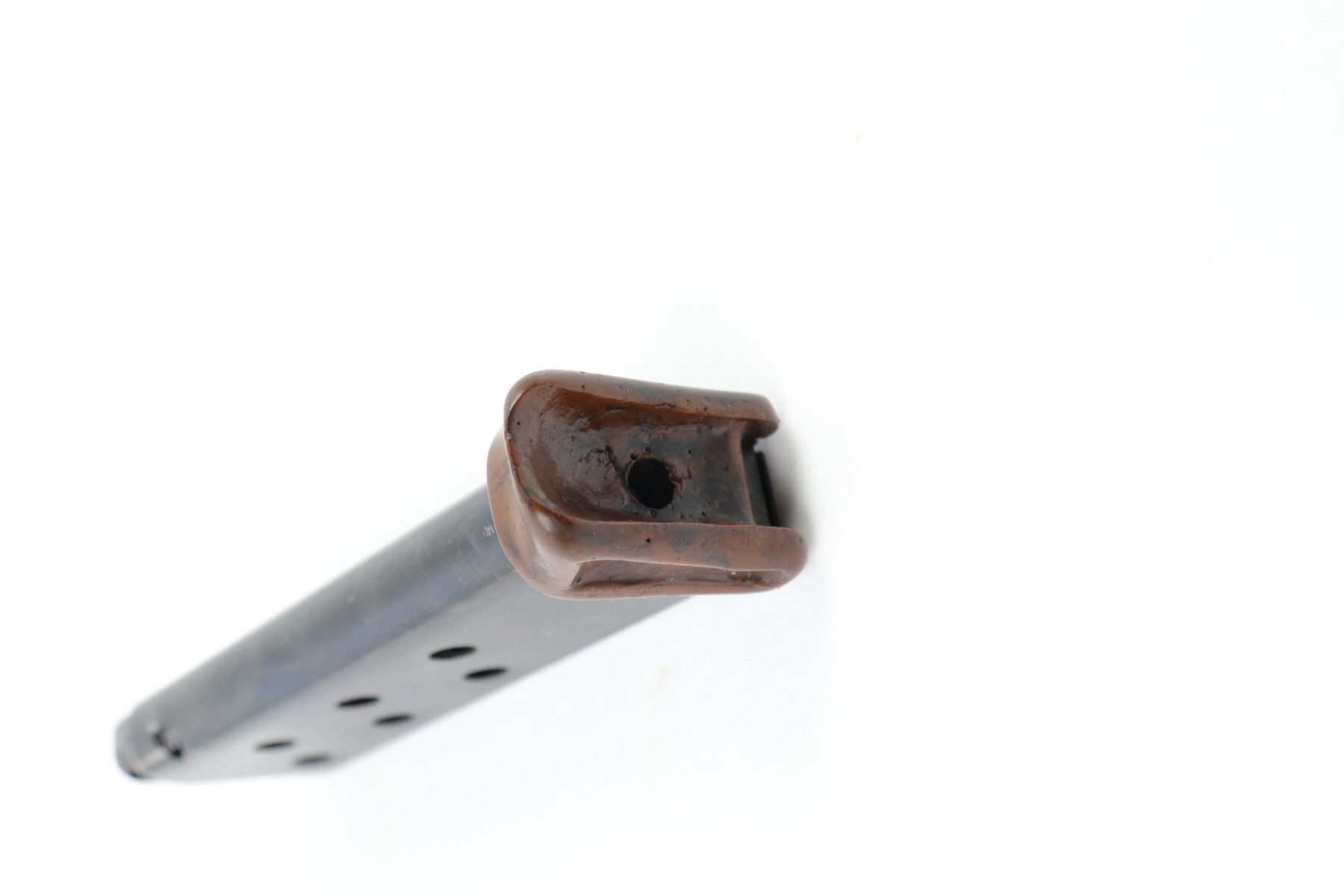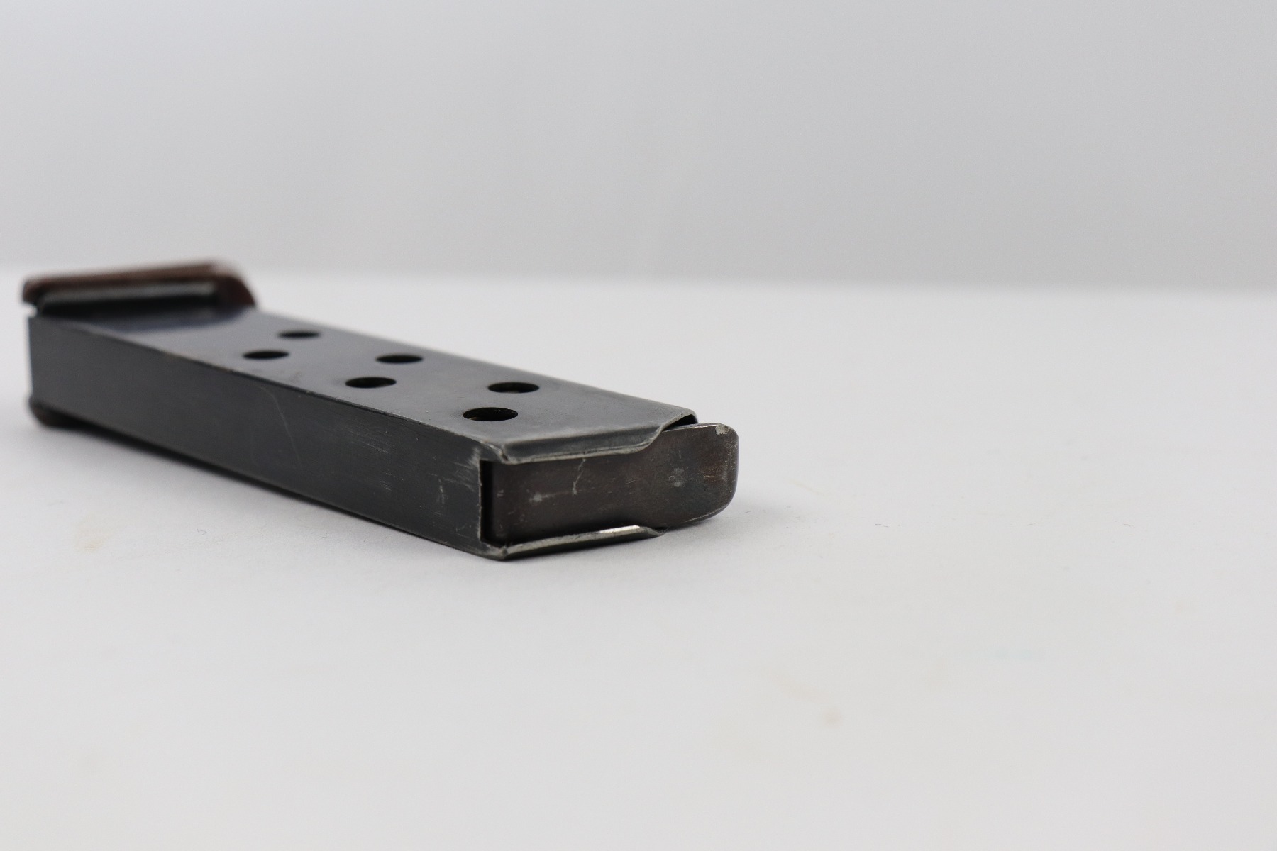 4/4/18 – This is an original Walther PPK magazine from early / pre WW2 with a reproduction finger extension. The magazine frame is original though with a high polish finish and Walther banner stamp. The spring is strong and fully functional. There is some minor bluing loss on the left side of the magazine but overall excellent condition. The base is plastic and not bakelite, but looks just like the real thing.