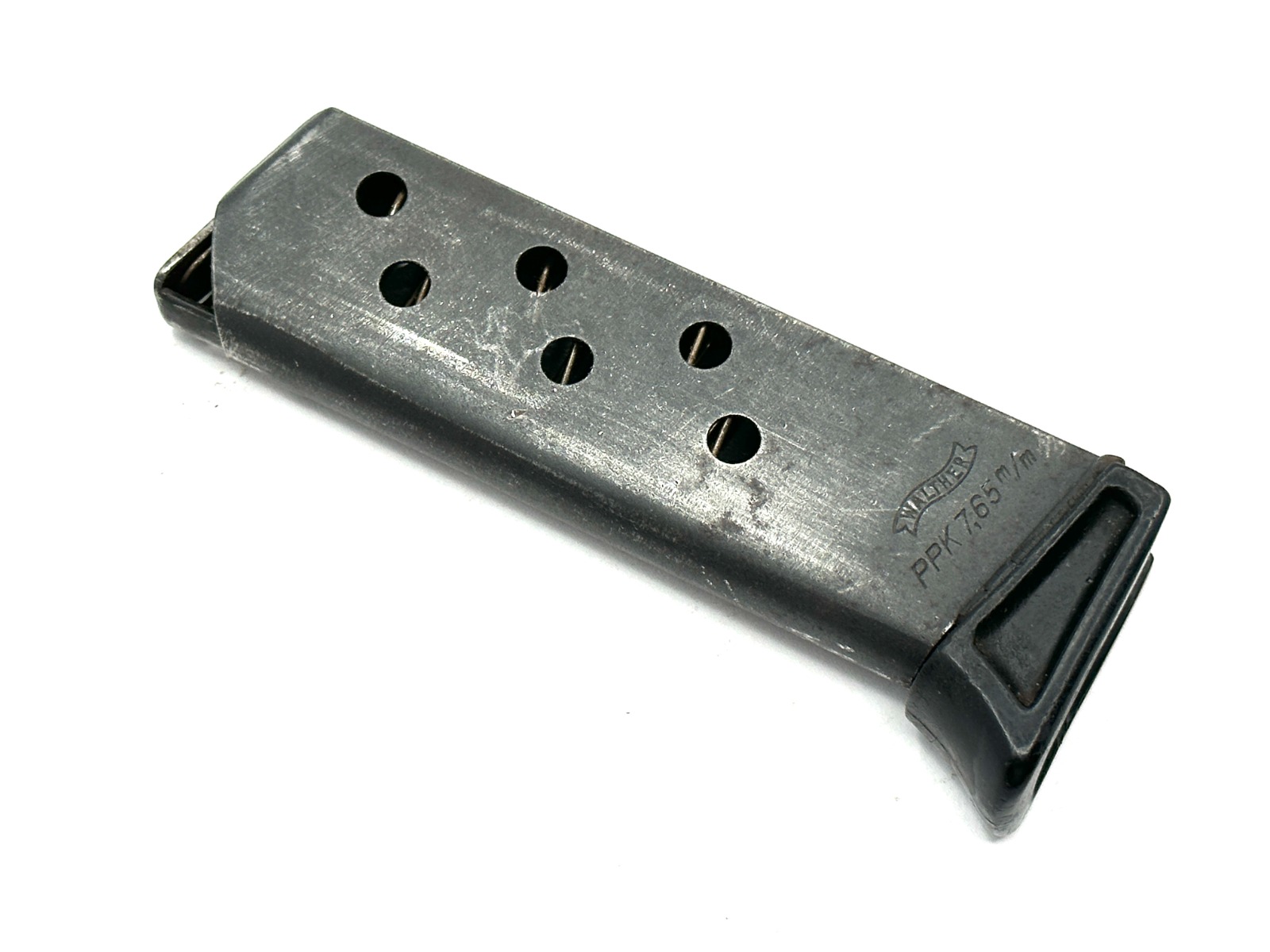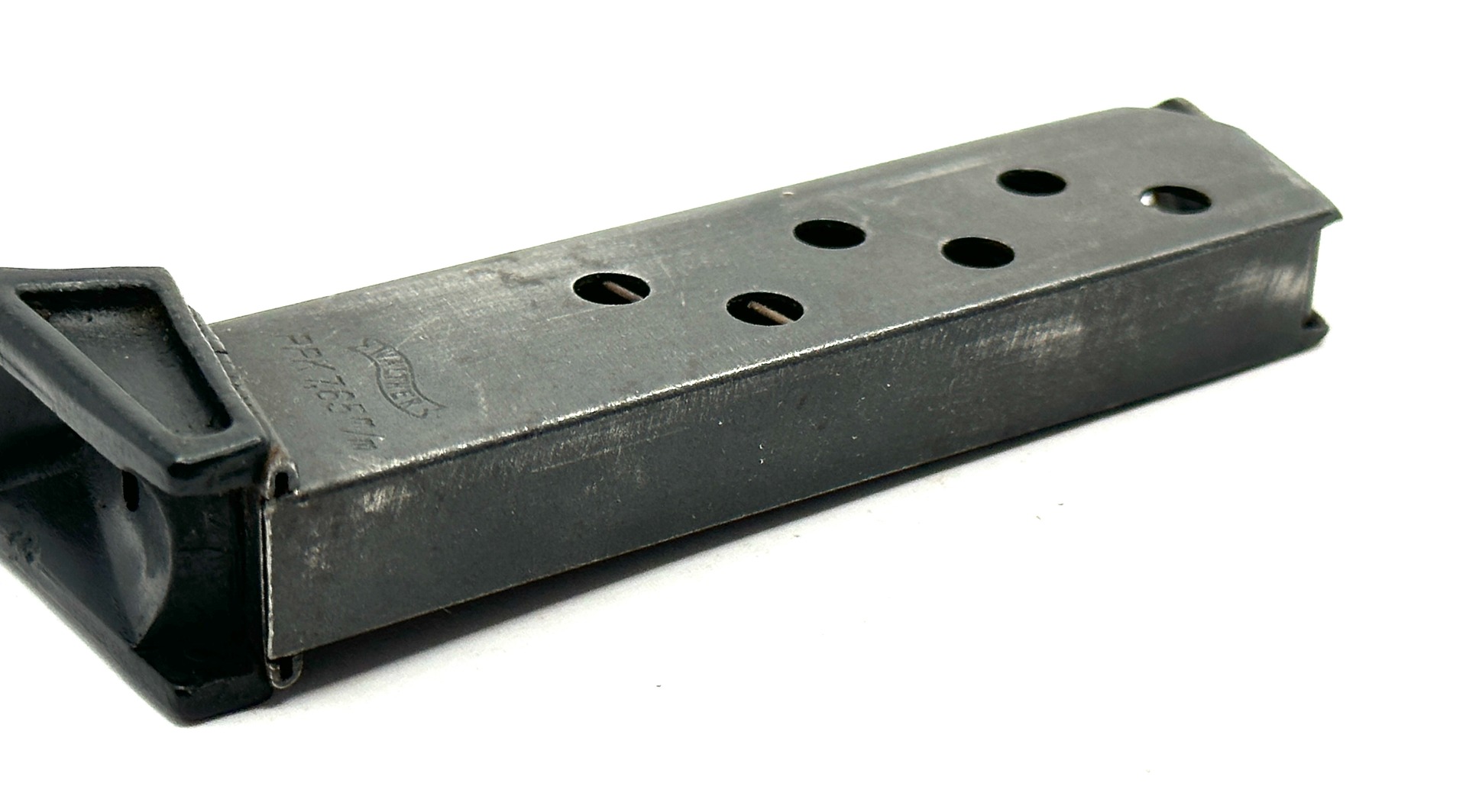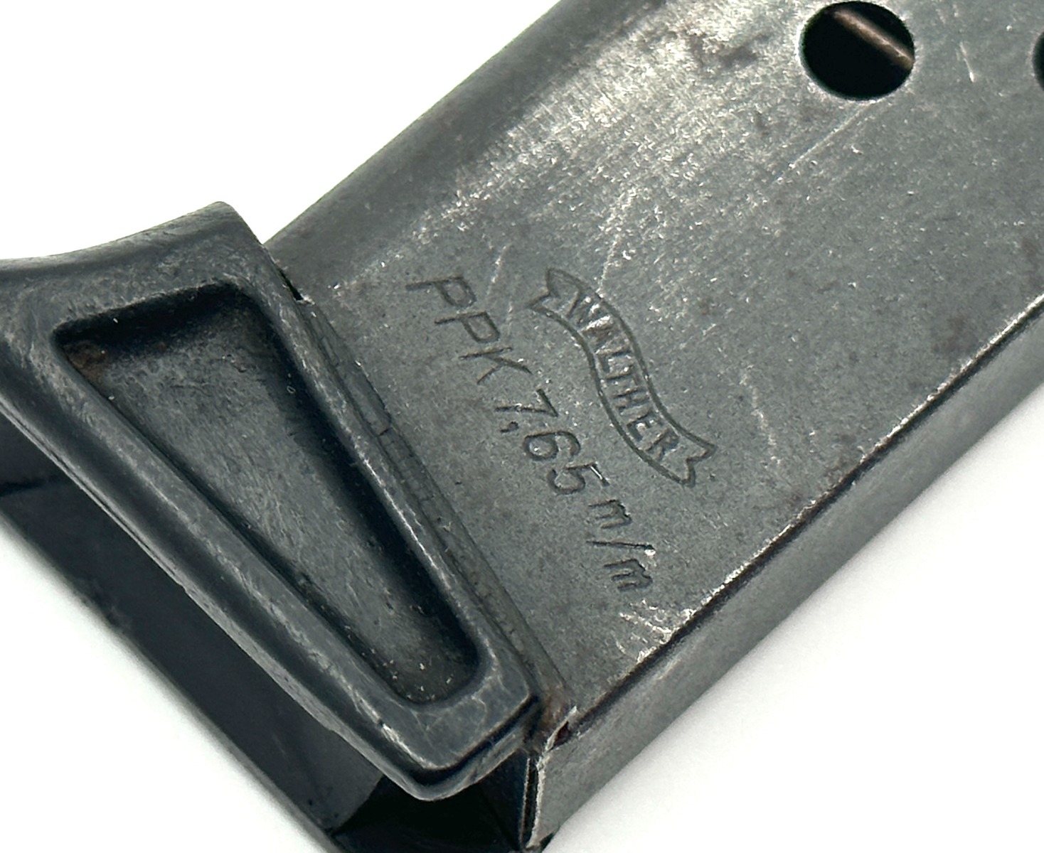 7/14/23 – This is a later WW2 production Walther PPK magazine with a black bakelite finger extension. The finger extension has one minor chip on the inside lip but has no cracks. The tube of the magazine shows a few spots of finish loss. However, it retains 80% of its original bluing finish. The Walther banner is stamped on the left side with no other markings. The spring is solid and functional.