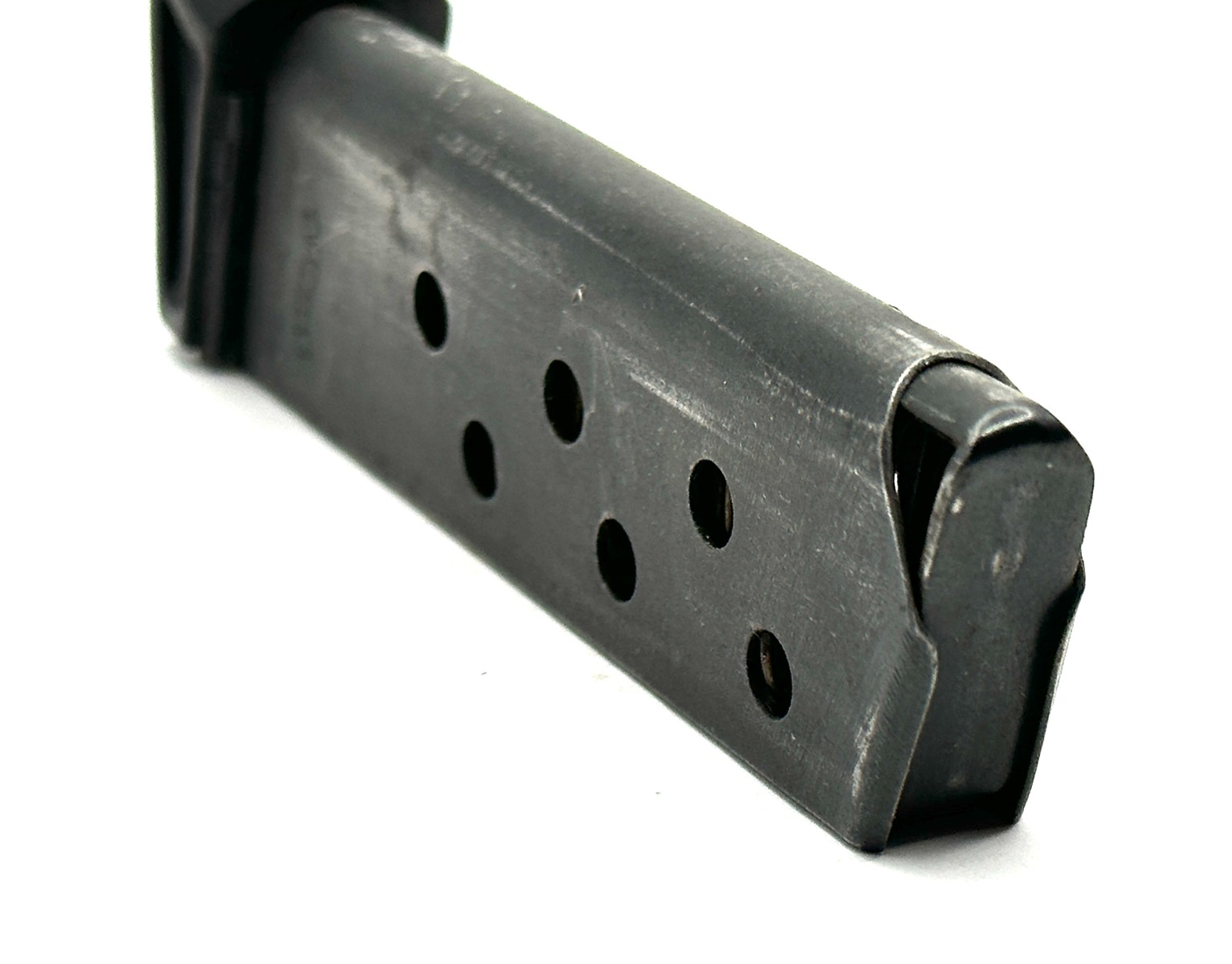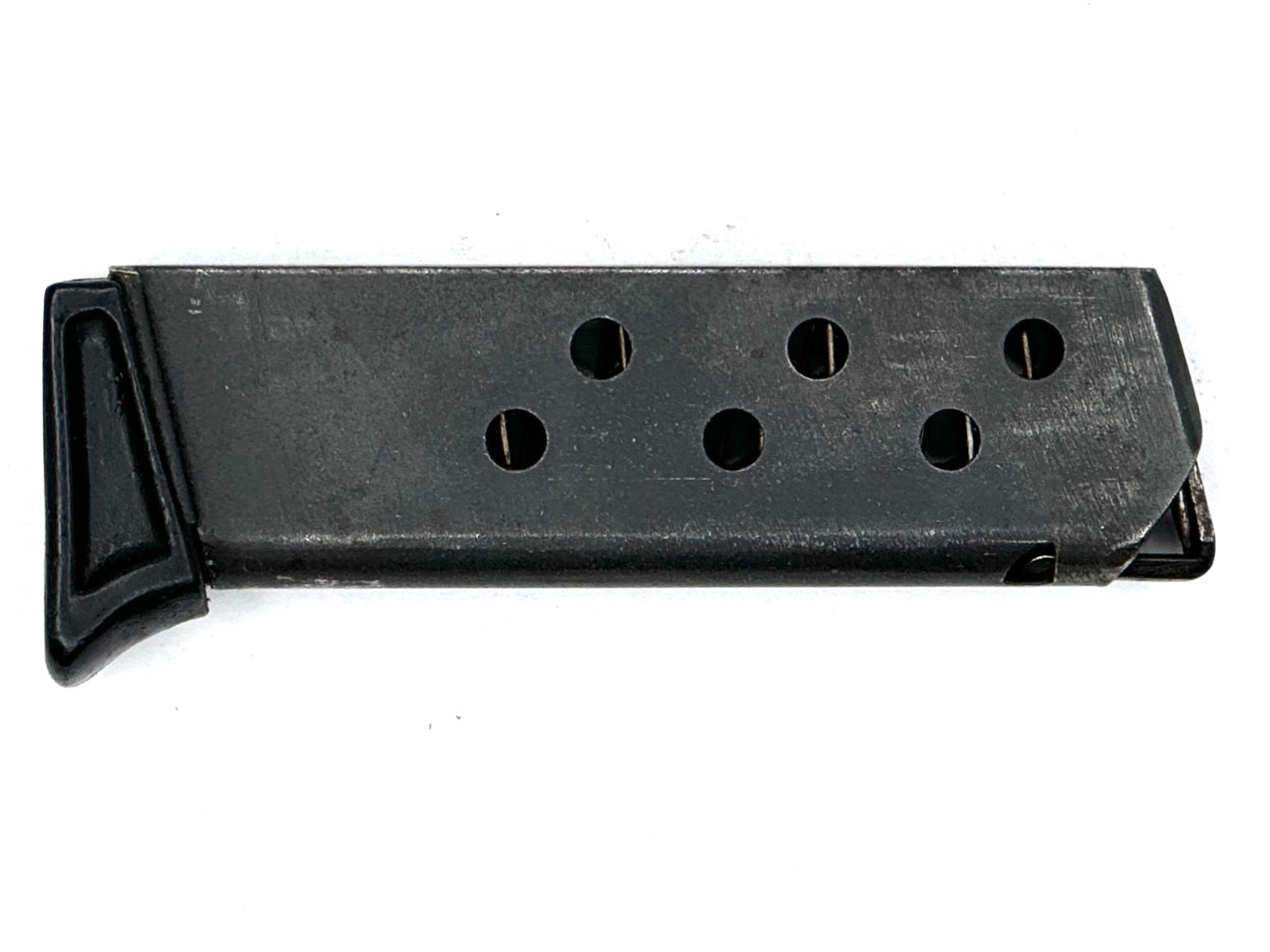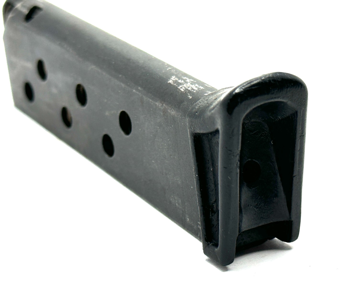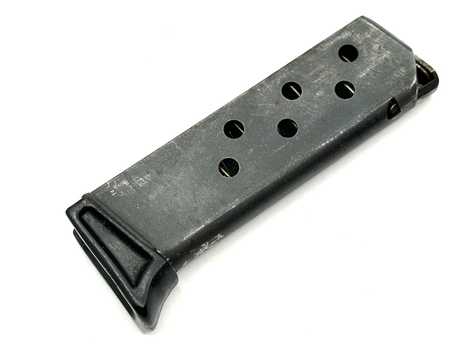 7/14/23 – This is a later WW2 production Walther PPK magazine with a black bakelite finger extension. The finger extension has one minor chip on the inside lip but has no cracks. The tube of the magazine shows a few spots of finish loss. However, it retains 80% of its original bluing finish. The Walther banner is stamped on the left side with no other markings. The spring is solid and functional.