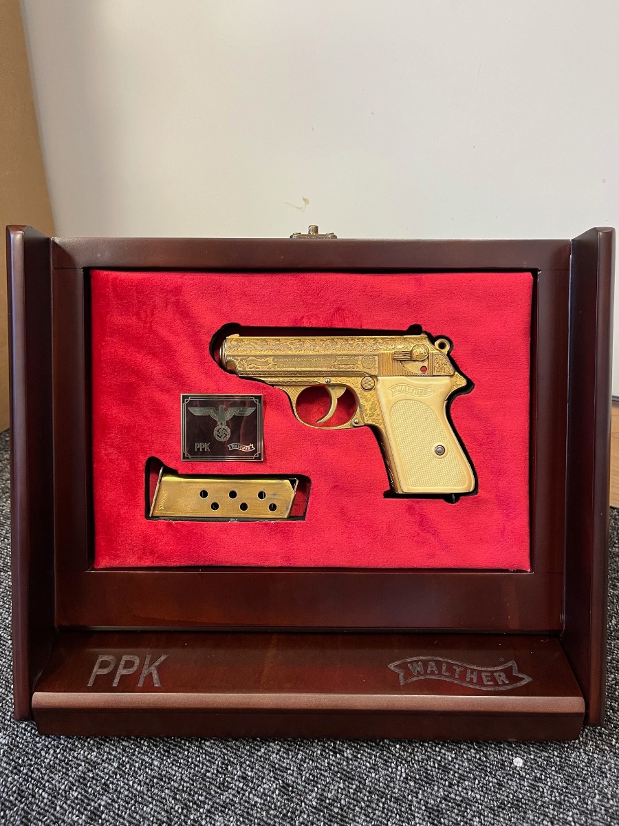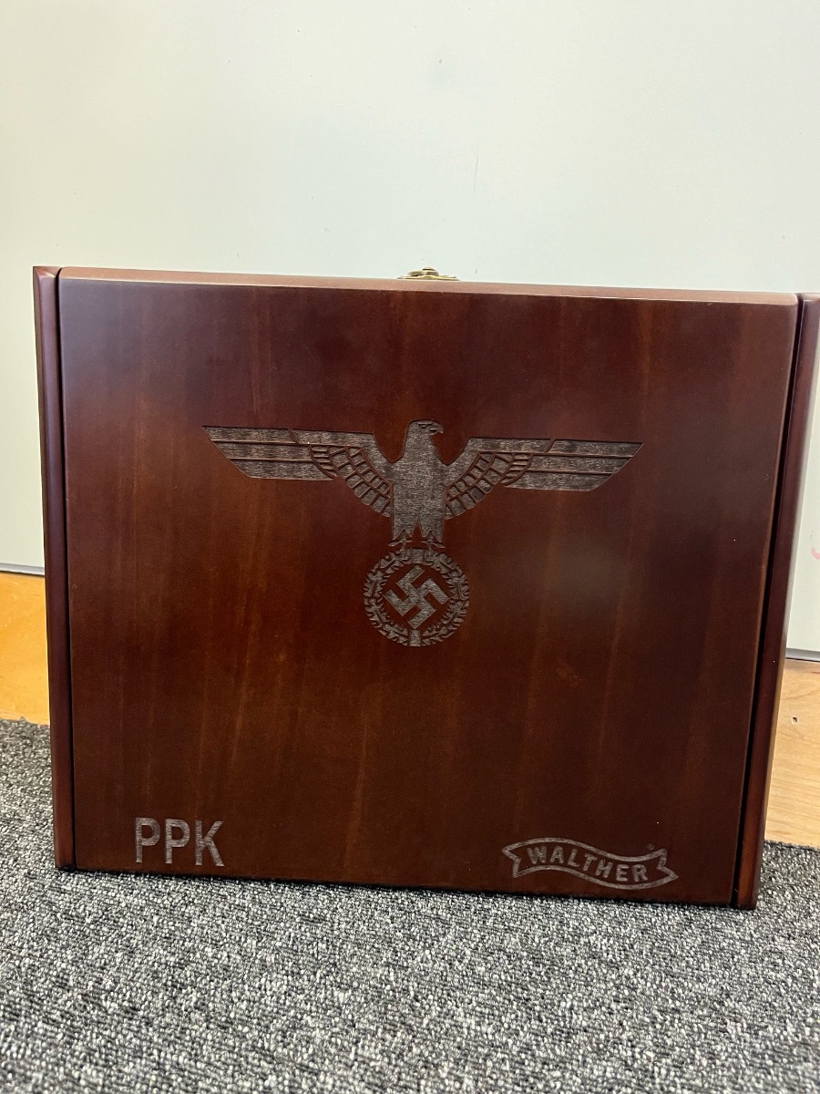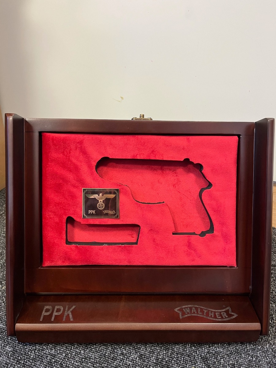 9/22/23 – This is a Walther PPK wood display case with red-lined foam soft interior. The lid opens and acts as an open display stand, with the lower half of the case acting as the base. Now with magnets behind the lining to hold the gun in place! PPK sold separately.