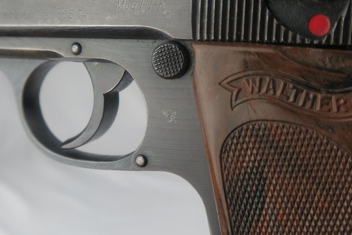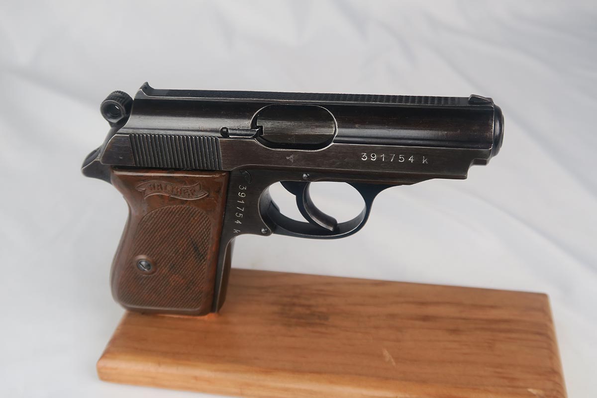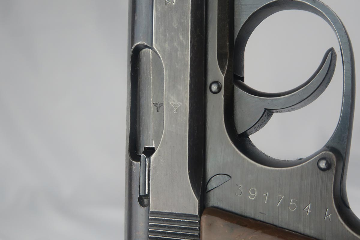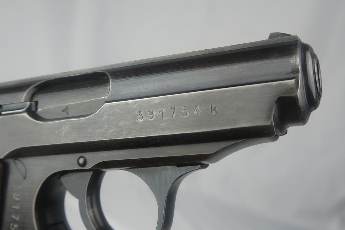 7/9/18 – This is a police issued Walther PPK from late ’42 or early ’43.  This is a later variation Eagle/C marked pistol, with dull military finish that rates at about 90%.  There is thinning to the finish throughout the pistol but no major eyesores.  The brown plastic grip is original and shows some age but no chips or cracks.  Nice wartime magazine and the pistol has Eagle/N proofs on slide and frame.  Very nice bore with no issues.