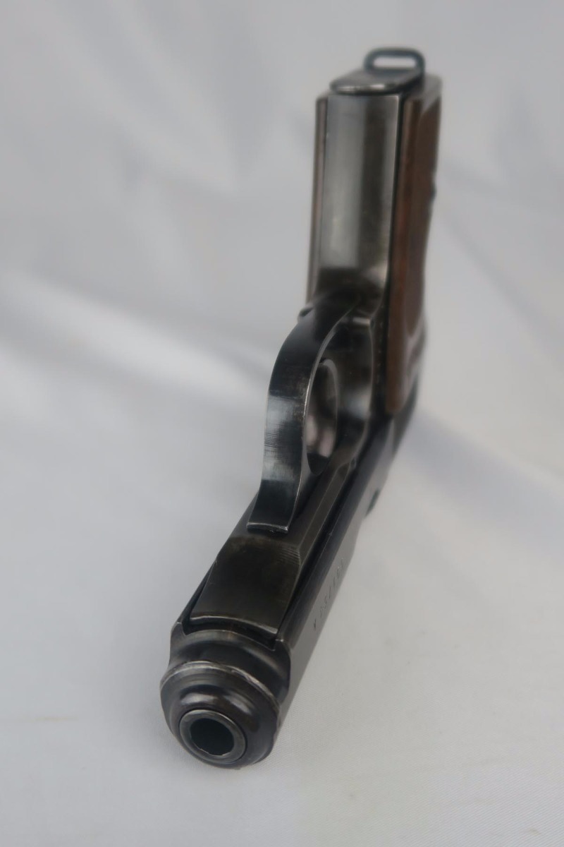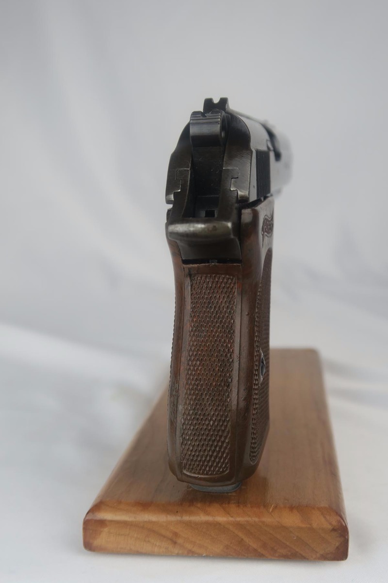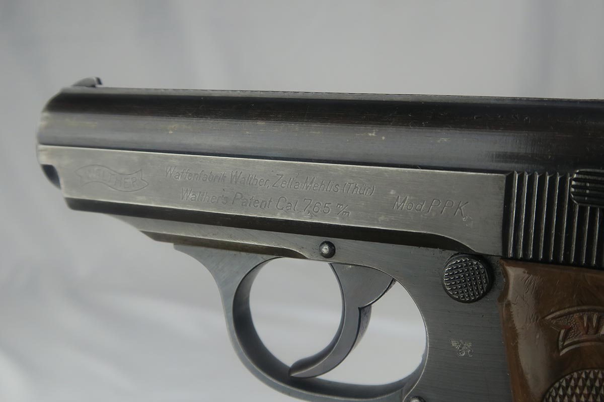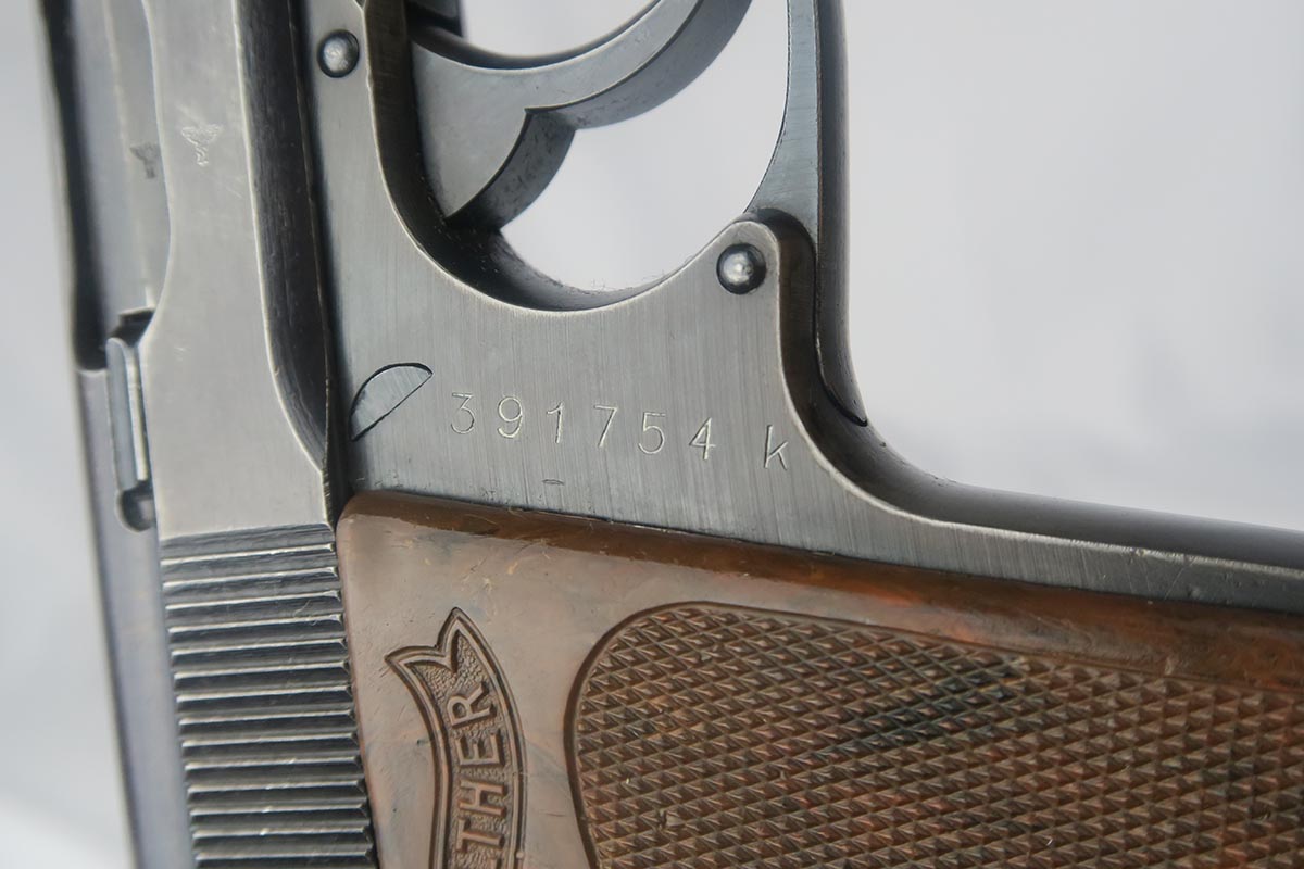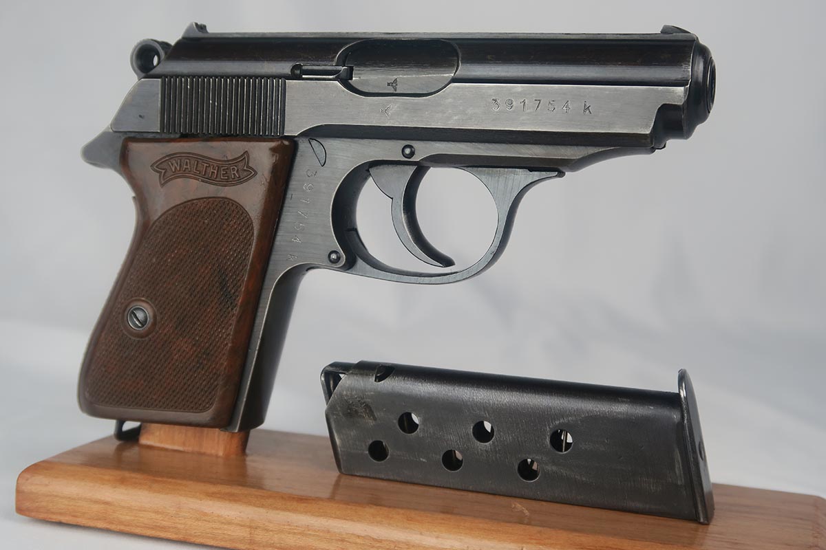7/9/18 – This is a police issued Walther PPK from late ’42 or early ’43.  This is a later variation Eagle/C marked pistol, with dull military finish that rates at about 90%.  There is thinning to the finish throughout the pistol but no major eyesores.  The brown plastic grip is original and shows some age but no chips or cracks.  Nice wartime magazine and the pistol has Eagle/N proofs on slide and frame.  Very nice bore with no issues.