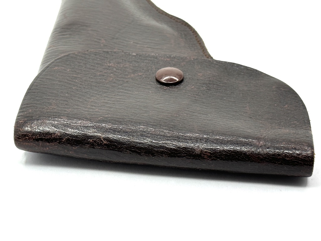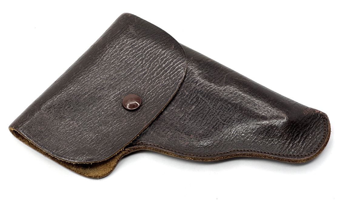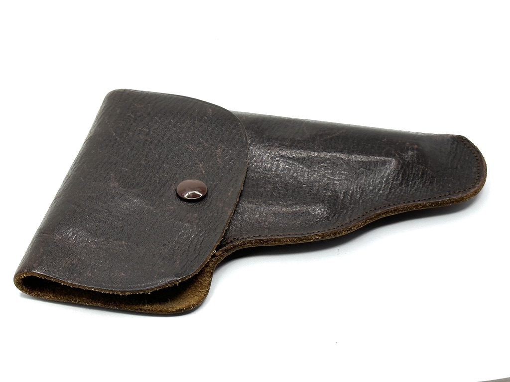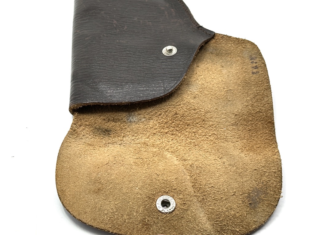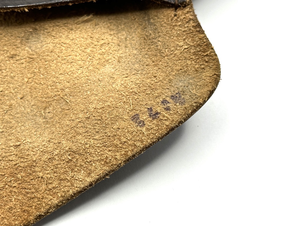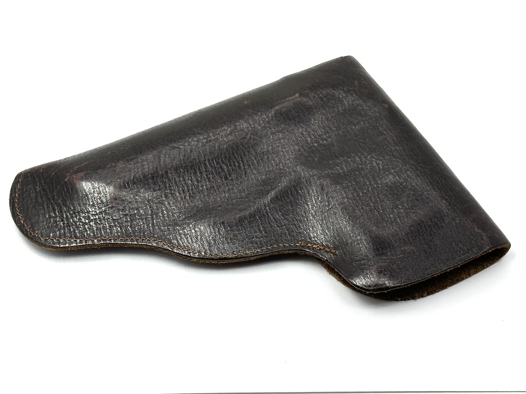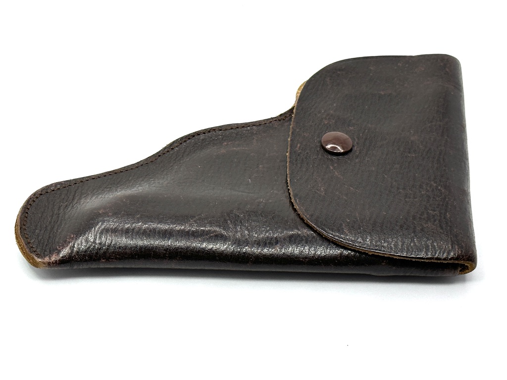 8/3/23 – This is a great and original condition soft leather holster for a Walther PPK or similar-sized pocket pistol. The leather shows minimal scuffing with complete and original stitching and a clean interior. The front closure snap locks into place tightly and securely holds the pistol. There’s some minor embellishment on the holster’s interior, but it has mostly faded and is difficult to make out.