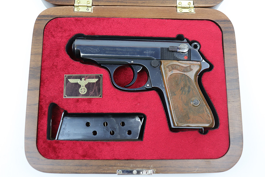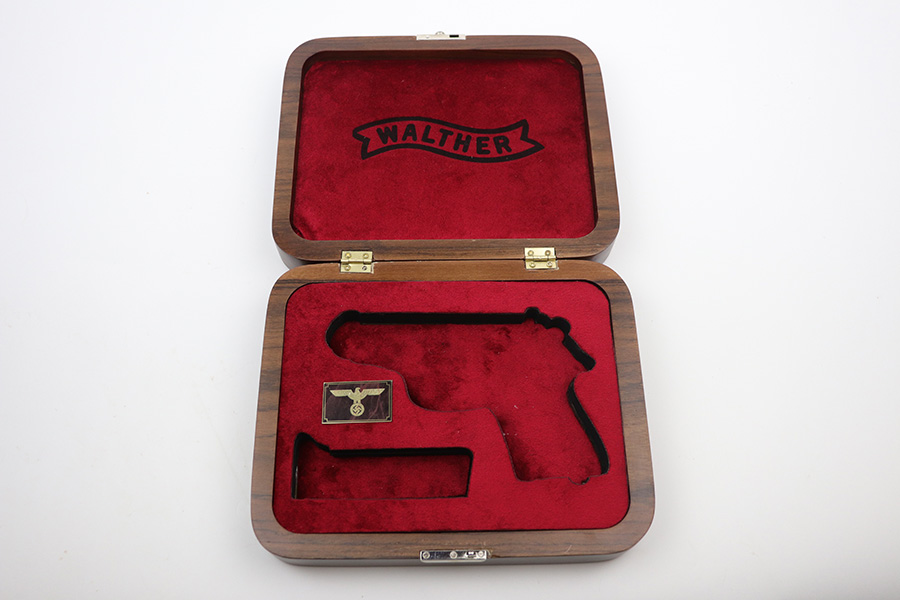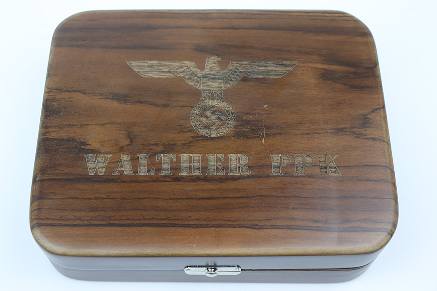 9/18/21 – This display case is a handmade wooden box with an identifying etched top and cushioned slotted interior perfect for storing and displaying a Walther PPK pistol. There is space inside for the pistol and an extra magazine or a space to store the magazine separate from the pistol. Does not include any firearm that may appear in photos, shown only for fit of items.