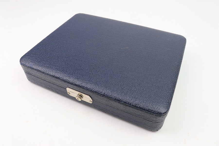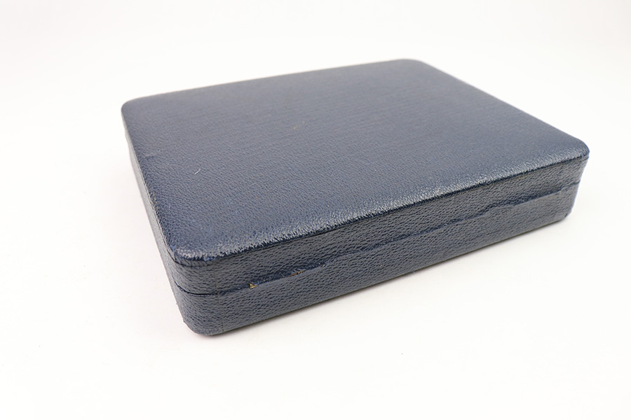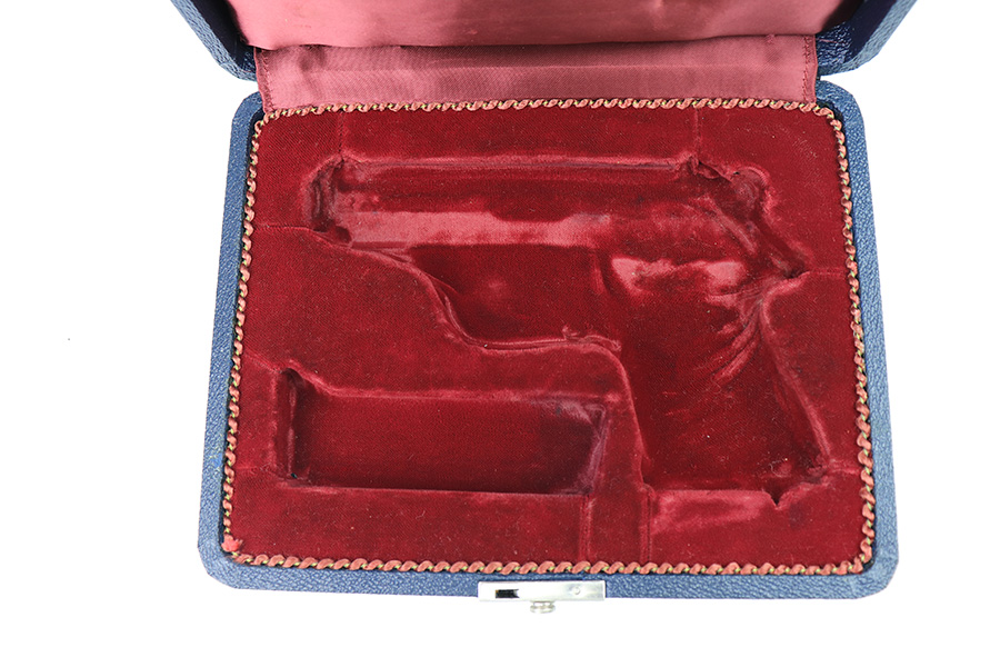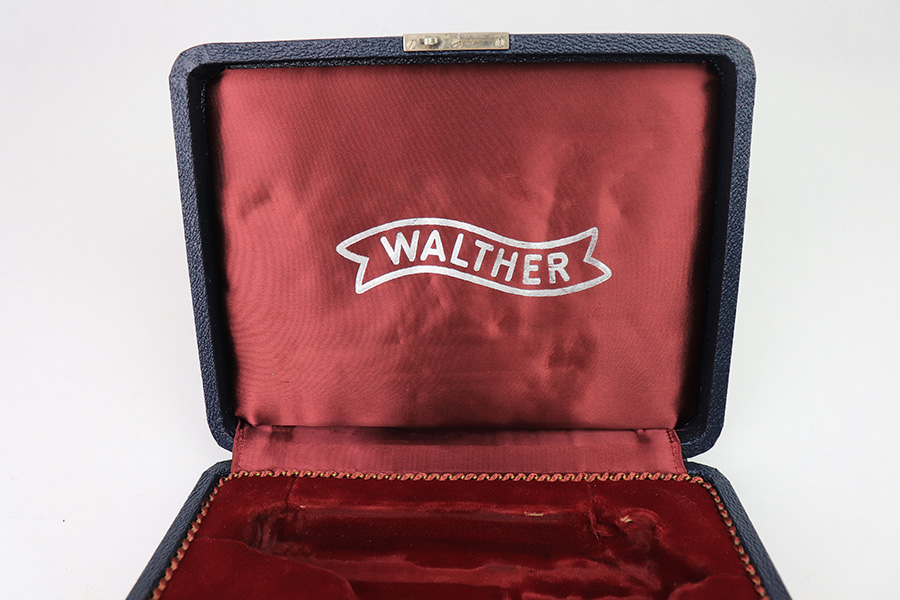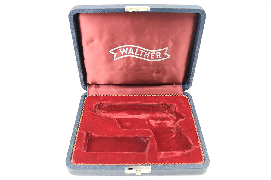 1/4/23 – This is a 1960s production Walther presentation case. The case is in excellent condition with a clean, stretched blue leather exterior and red interior. The interior of the lid has some minor stuffing loss, but this is typical and there is still some stuffing / padding intact. The Walther banner is still crisp and easily visible. The interior felt has some mild edge wear but no major issues. There’s a “shadow” of a PPK inside from previous use.
