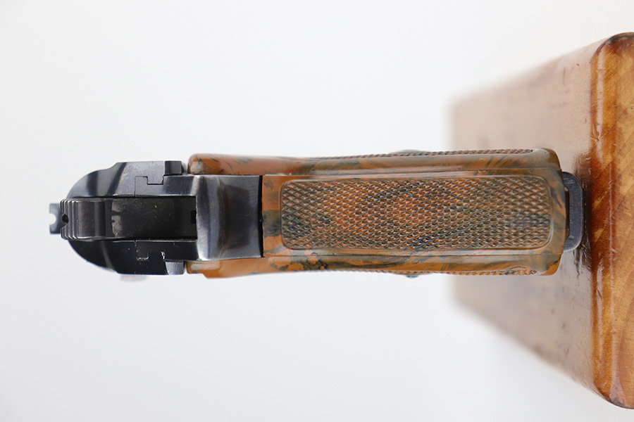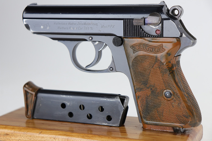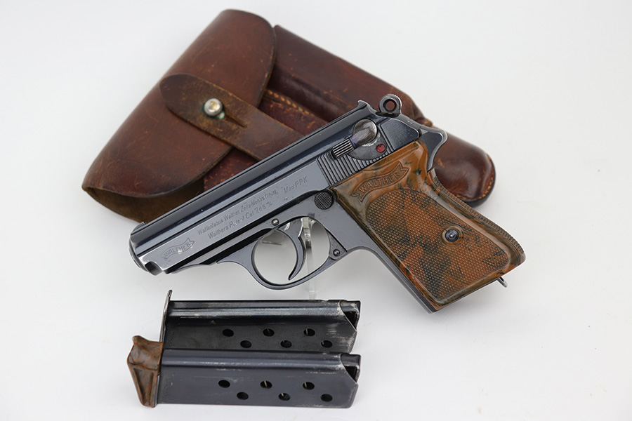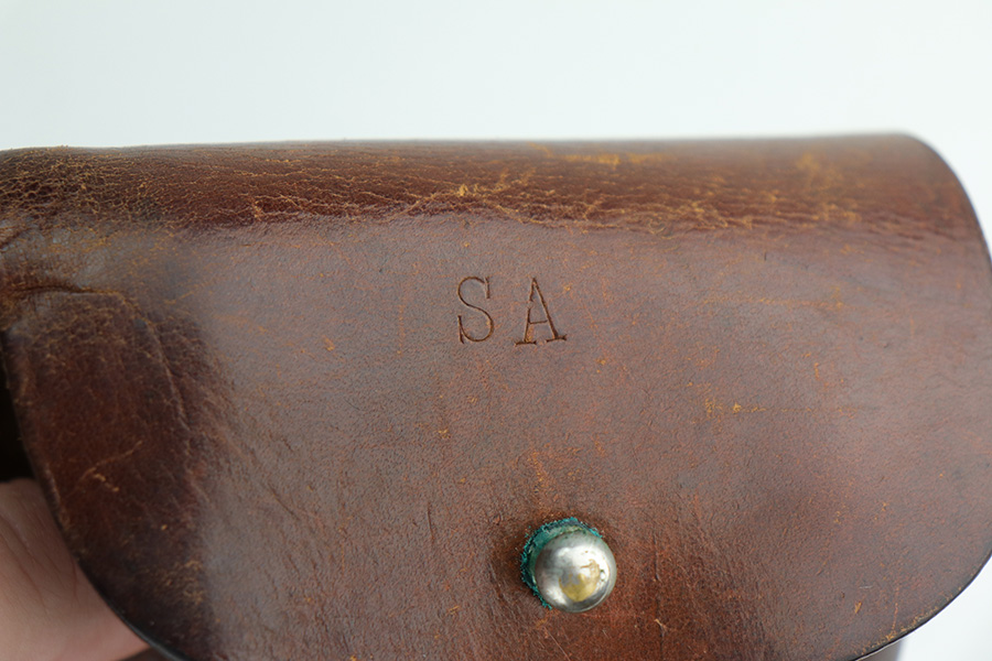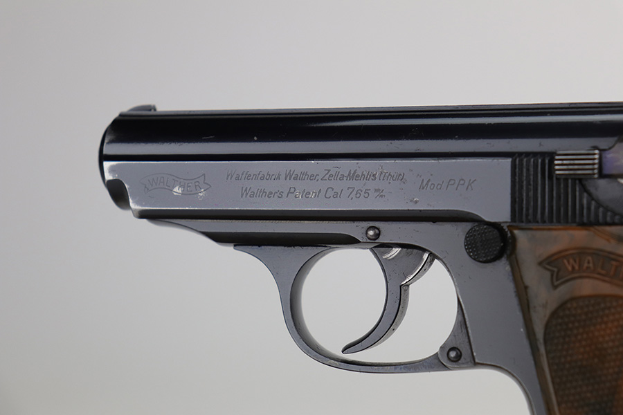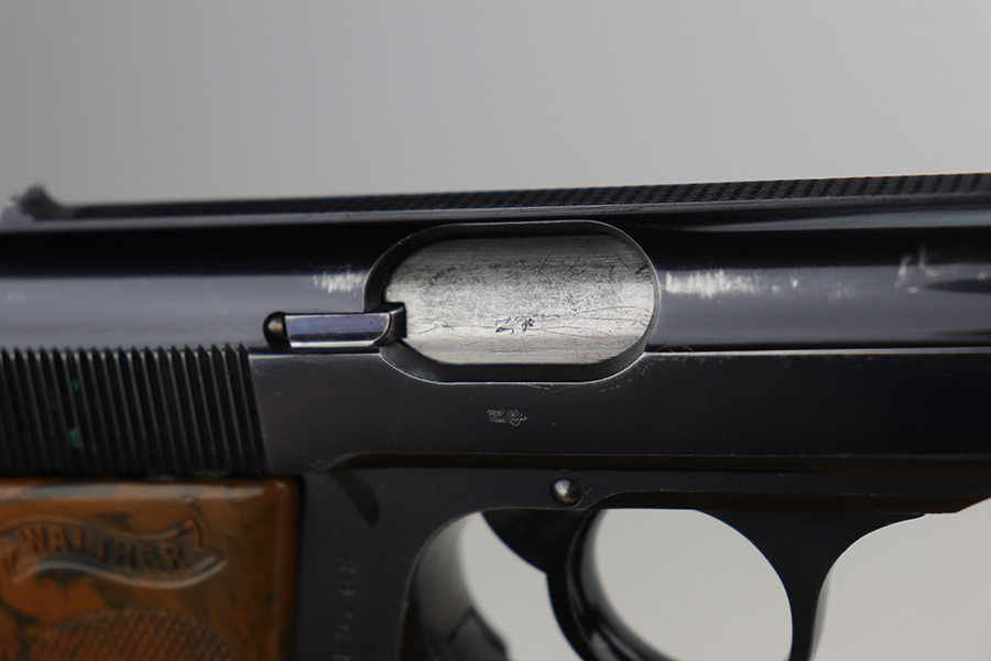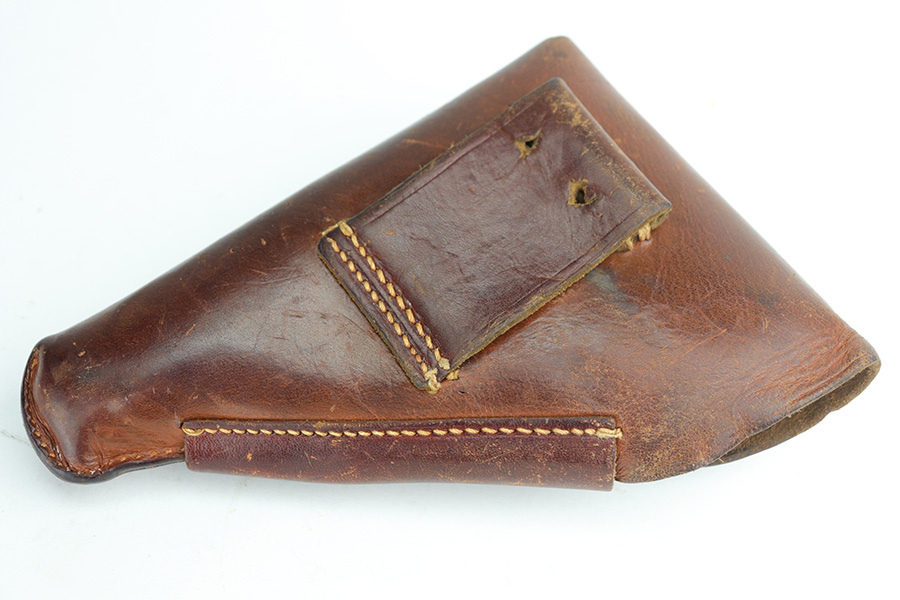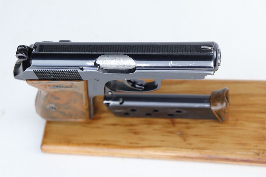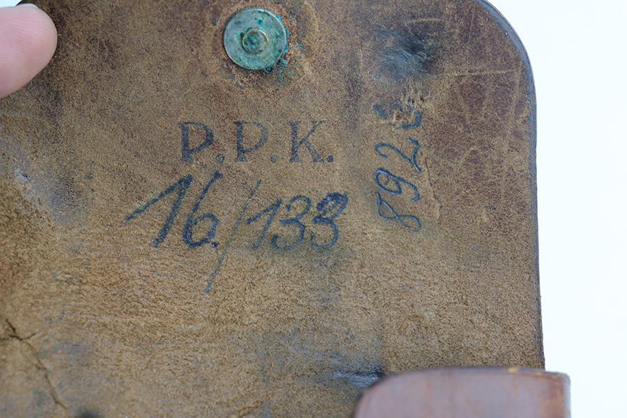 8/20/21 – This is a complete Walther PPK rig from 1935 with holster and spare magazine. The gun is all original with ~90% of the blue remaining. Some finish loss on either side of the muzzle, a little more on the right side of the slide in the rounded portion, and some thinning of the front strap. Minty bore. Excellent grip and finger extension magazine, no cracks or chips in either. Rig is completed by an interesting Akah marked holster. It’s marked ‘SA’ on the outer flap, though we do not believe it’s a factory marking. Also has an internal insktamp and some writing inside.