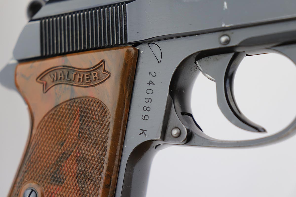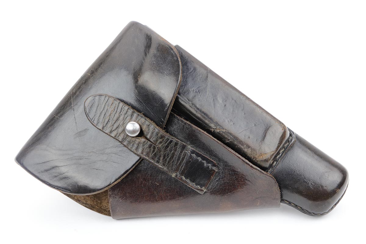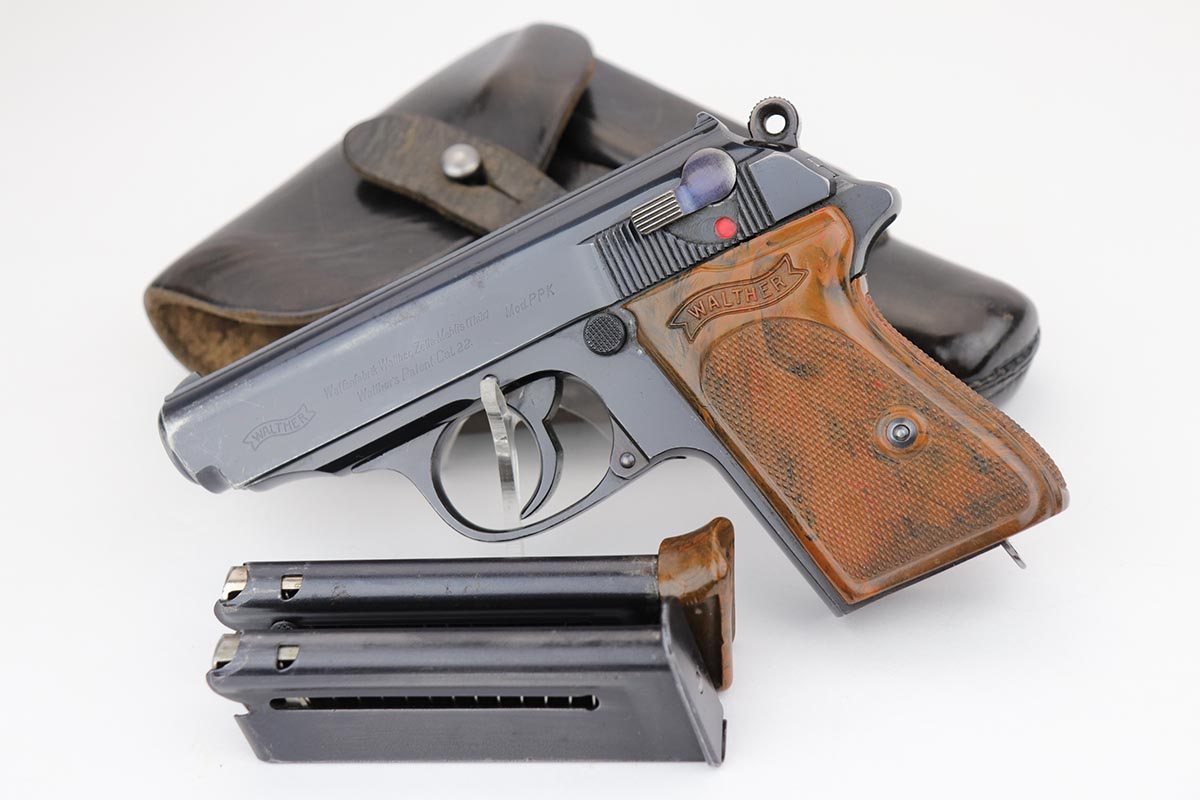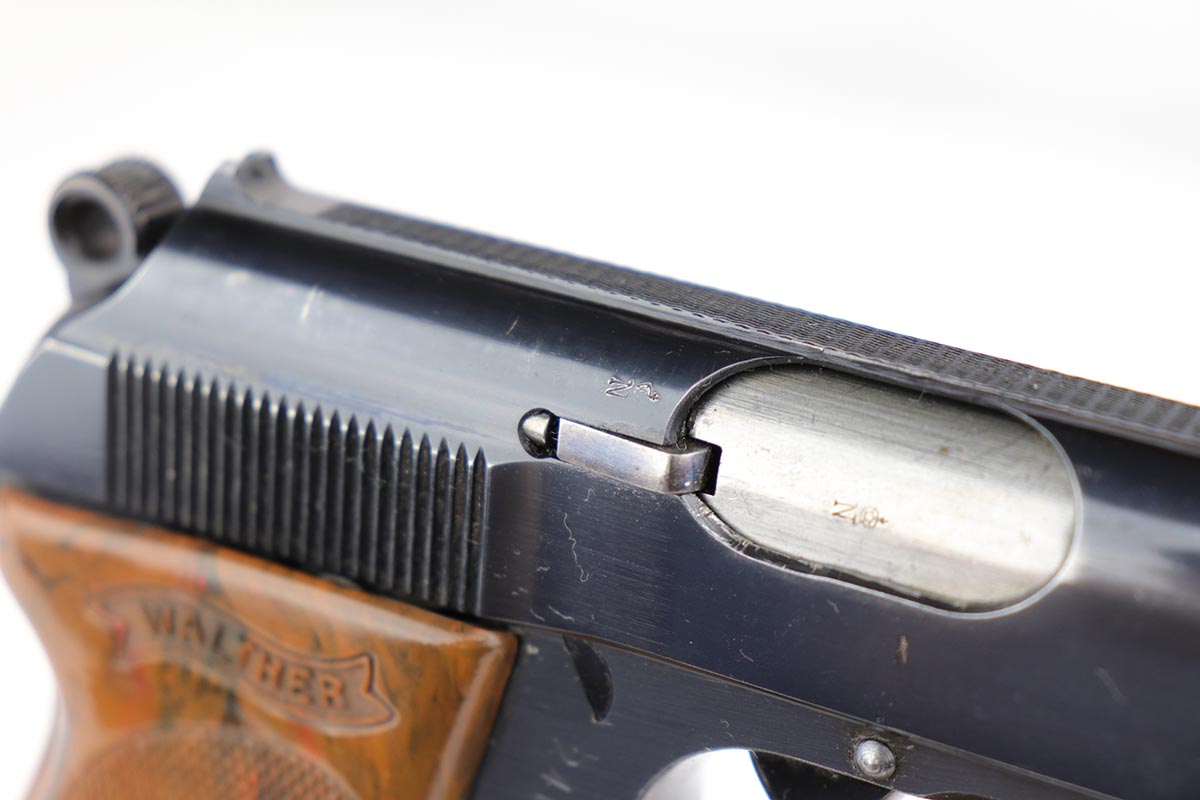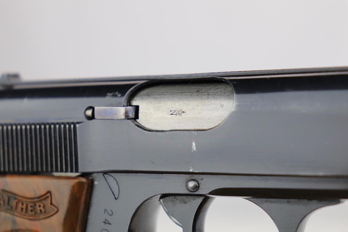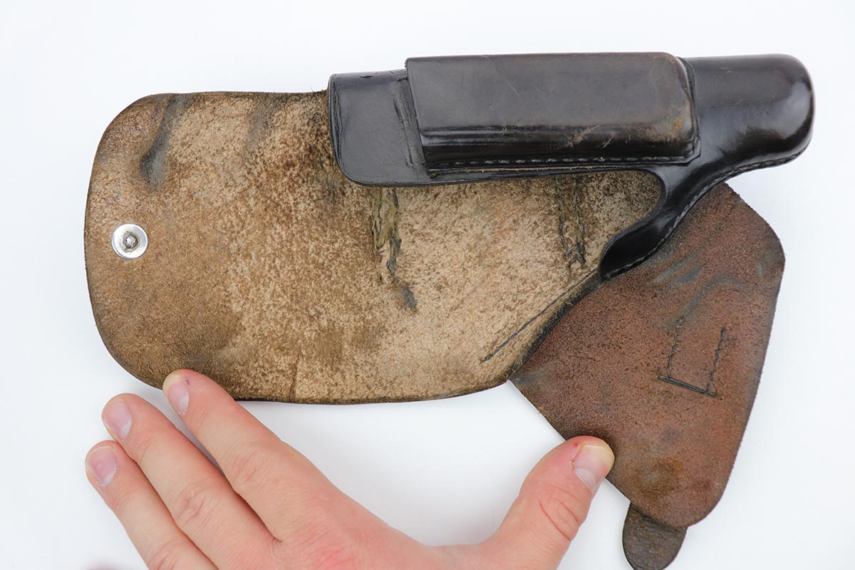 11/27/19 – This is a nice, complete Walther PPK rig from 1939. The gun is chambered for the less common .22LR, and the rig includes a total of two correct magazines. The gun has 95-96% of the original, high-polish blue. Majority of finish loss is on the left side of the slide, near the muzzle. There’s also a little more on the trigger guard. Excellent grip with no cracks. Mint bore. Finger extension on the main magazine is in great shape with only minor dings and nicks. Rig is a completed by a very nice, original holster that is Akah and DRGM marked on the inner flap.