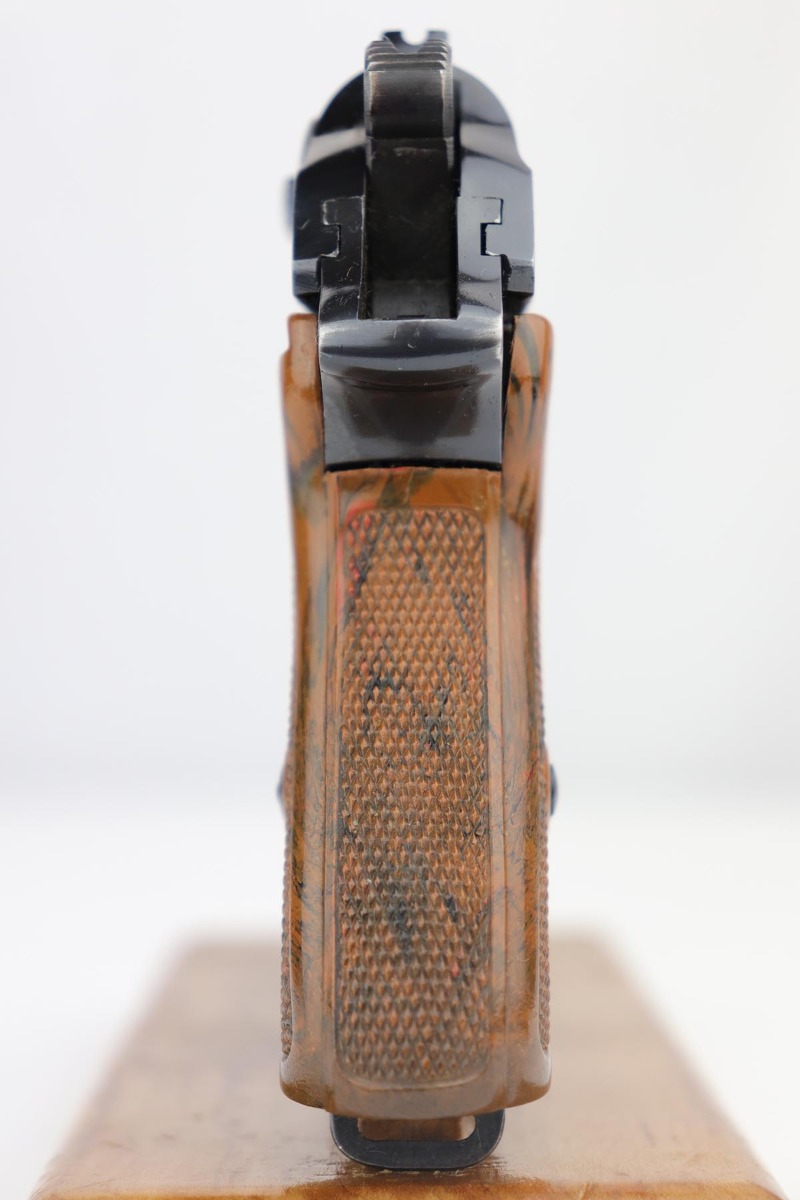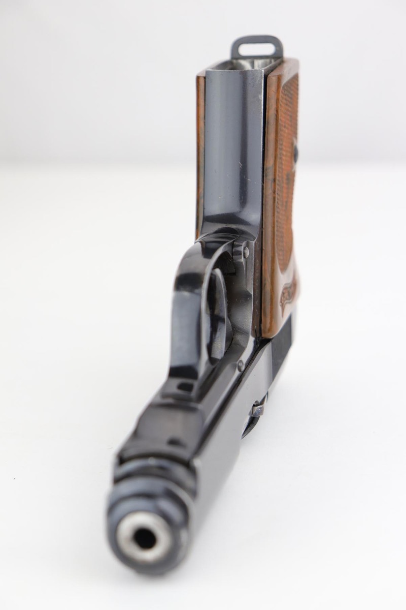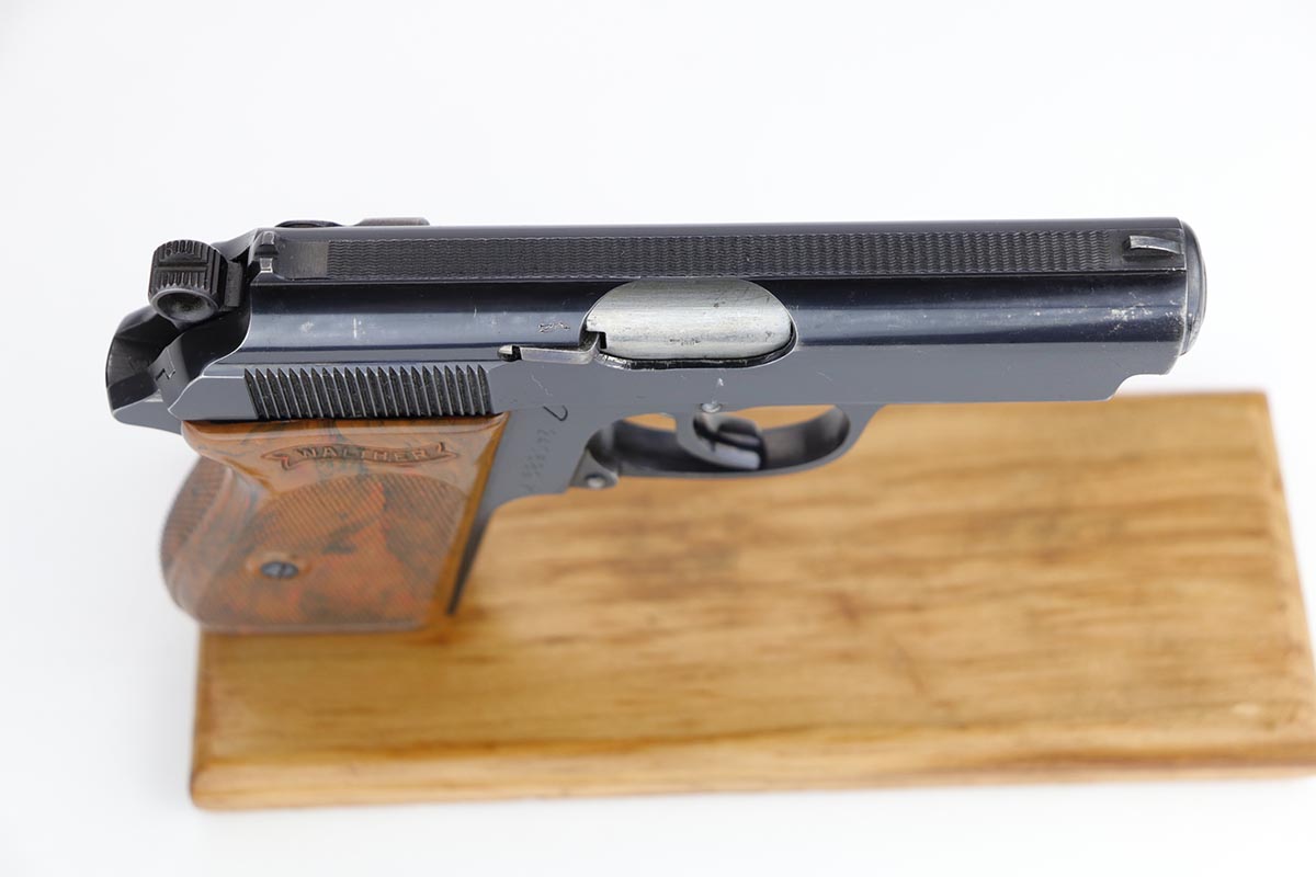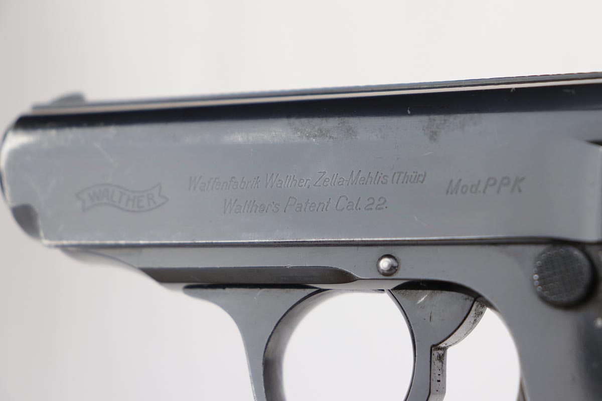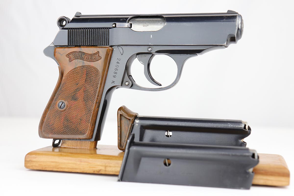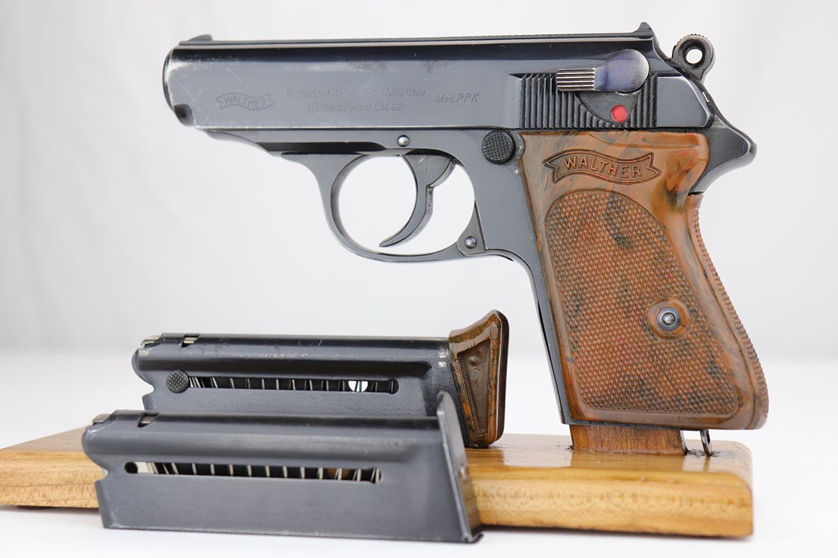 11/27/19 – This is a nice, complete Walther PPK rig from 1939. The gun is chambered for the less common .22LR, and the rig includes a total of two correct magazines. The gun has 95-96% of the original, high-polish blue. Majority of finish loss is on the left side of the slide, near the muzzle. There’s also a little more on the trigger guard. Excellent grip with no cracks. Mint bore. Finger extension on the main magazine is in great shape with only minor dings and nicks. Rig is a completed by a very nice, original holster that is Akah and DRGM marked on the inner flap.