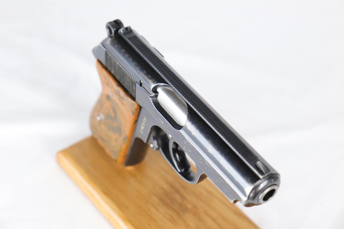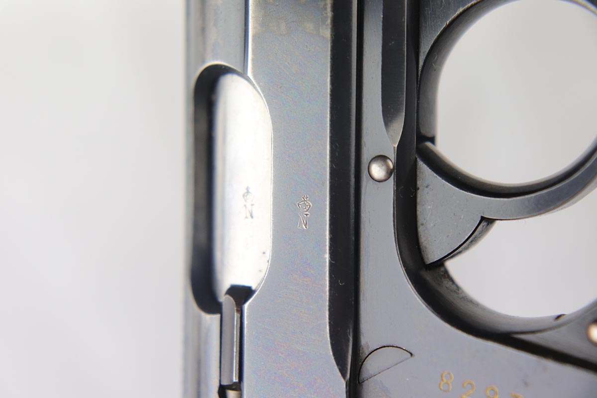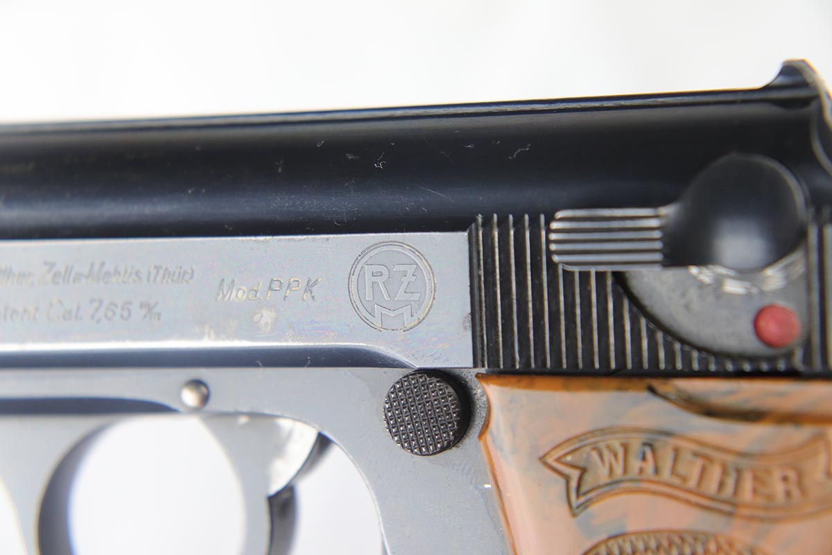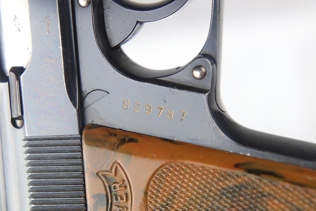 7/12/18 – This is an original and correct RZM marked Walther PPK from 1935. The RZM (Reichs Zeug Meisterei) was the equipment office of the NSDAP and was established to contract for equipment. These pistols were commonly thought to be issued to the German political leaders of the time. The bluing on this pistol rates at around 98%, with finish loss along the edges of the slide and the upper rounded portions of the slide. There is also an area of finish loss on the trigger guard. Early 90 degree safety has a little fire blue remaining. Excellent grip and finger extension magazine with no major cracks or chips. Nice, shiny bore.