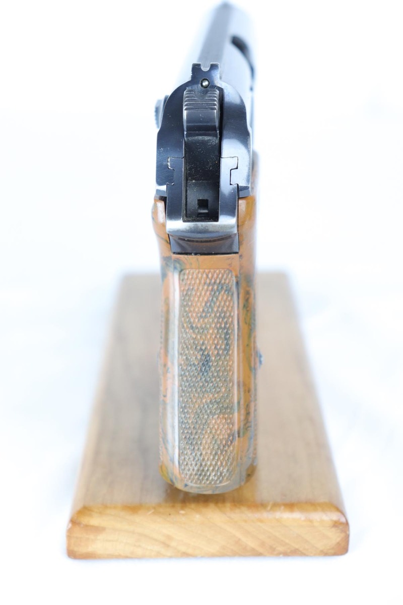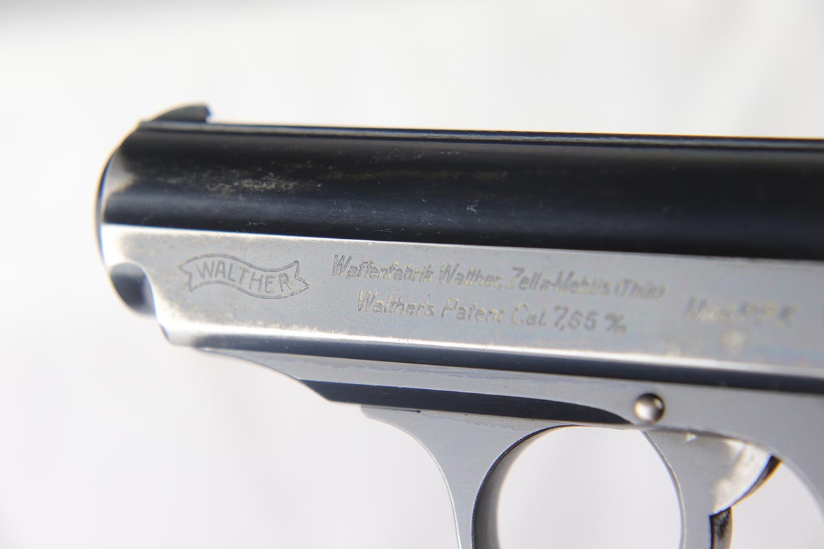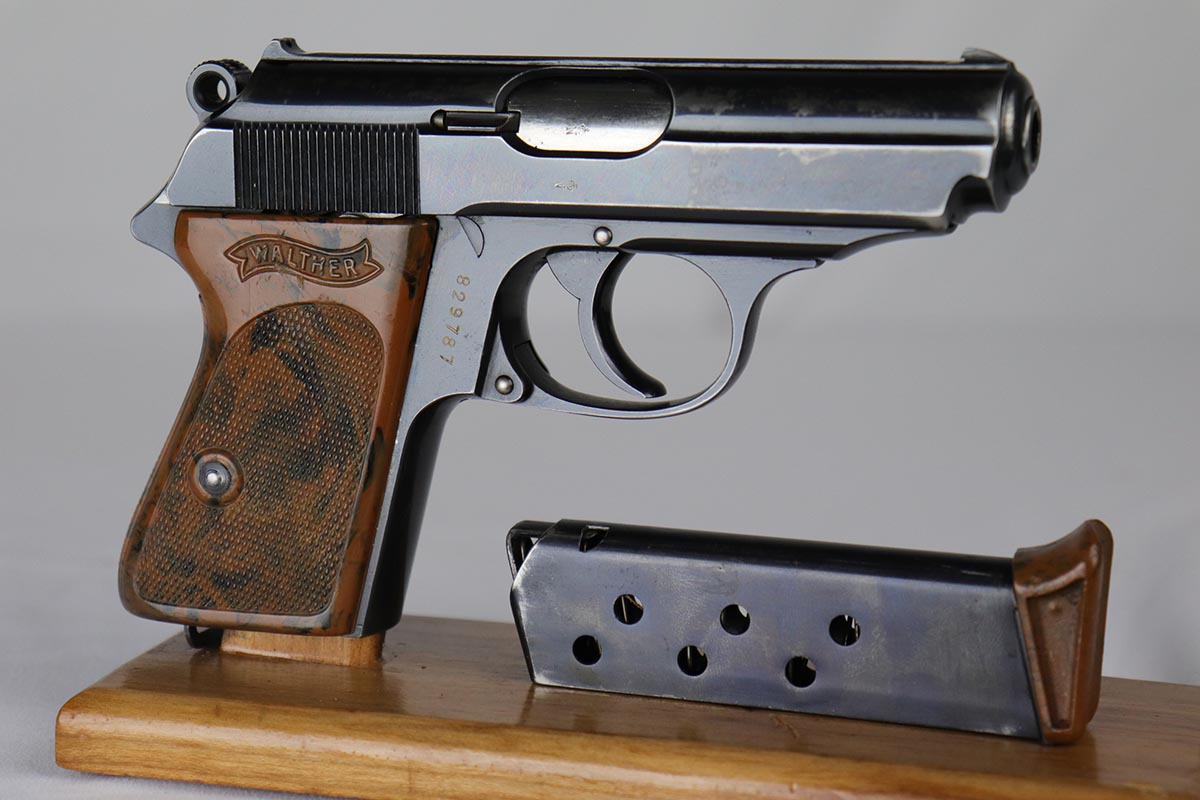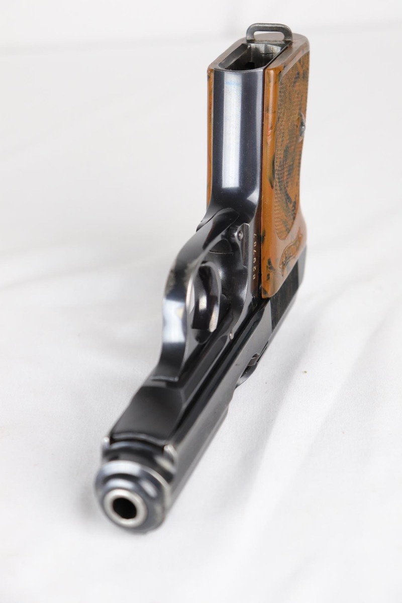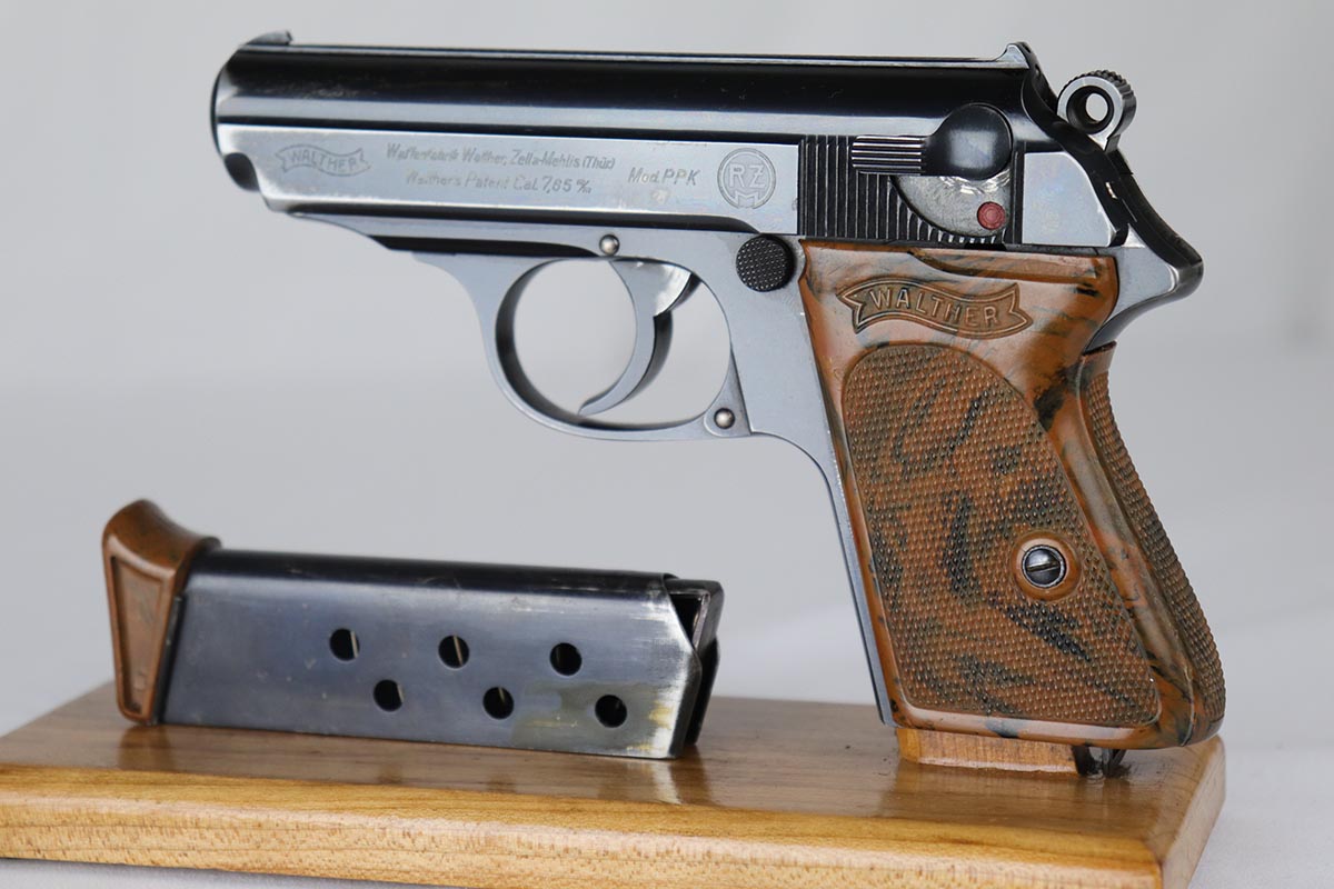7/12/18 – This is an original and correct RZM marked Walther PPK from 1935. The RZM (Reichs Zeug Meisterei) was the equipment office of the NSDAP and was established to contract for equipment. These pistols were commonly thought to be issued to the German political leaders of the time. The bluing on this pistol rates at around 98%, with finish loss along the edges of the slide and the upper rounded portions of the slide. There is also an area of finish loss on the trigger guard. Early 90 degree safety has a little fire blue remaining. Excellent grip and finger extension magazine with no major cracks or chips. Nice, shiny bore.
