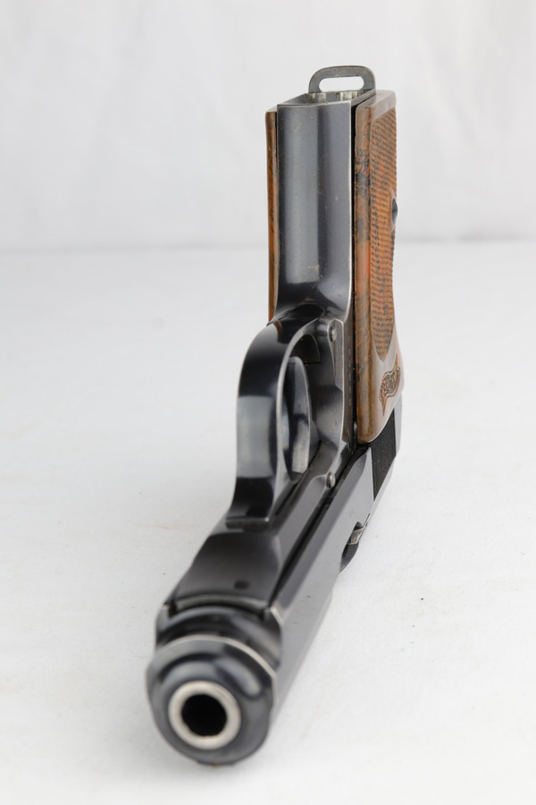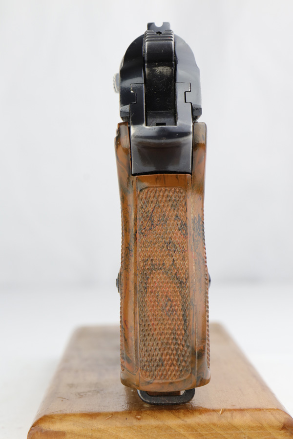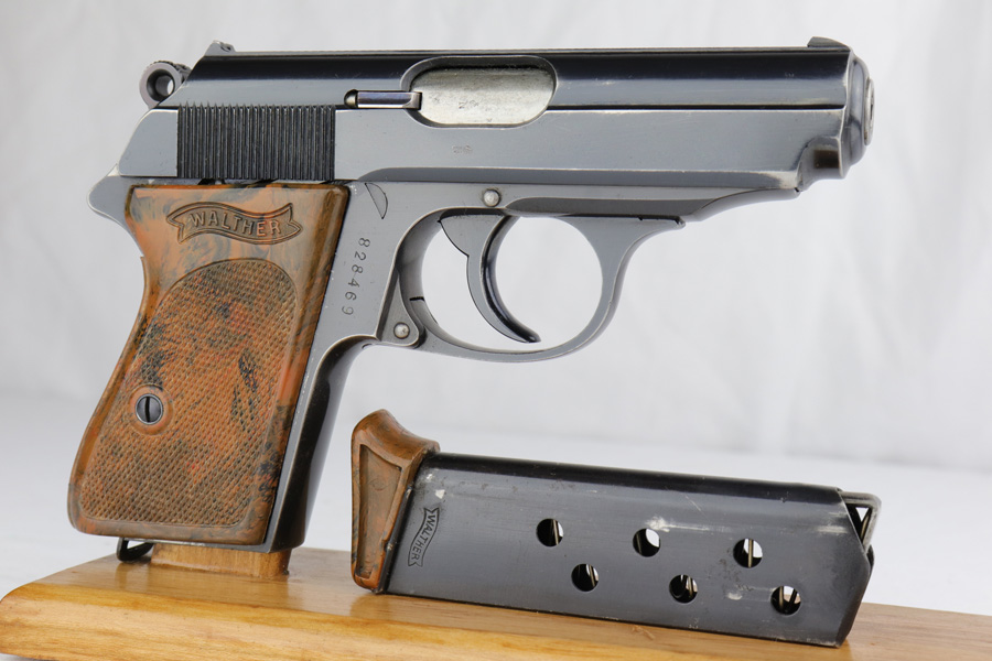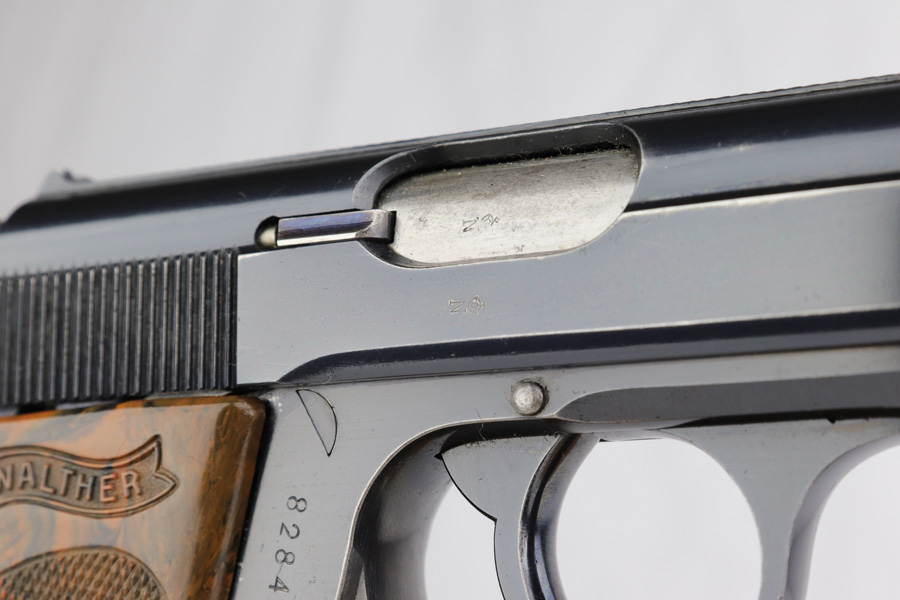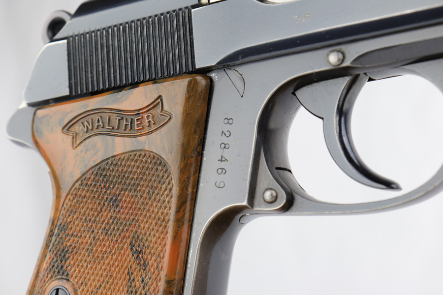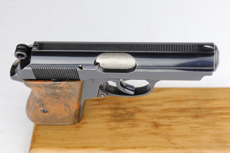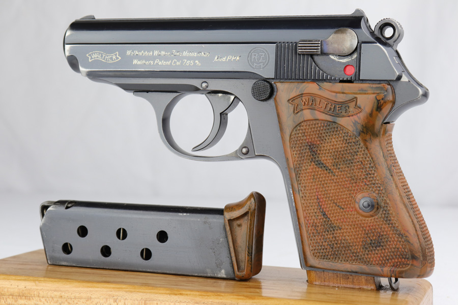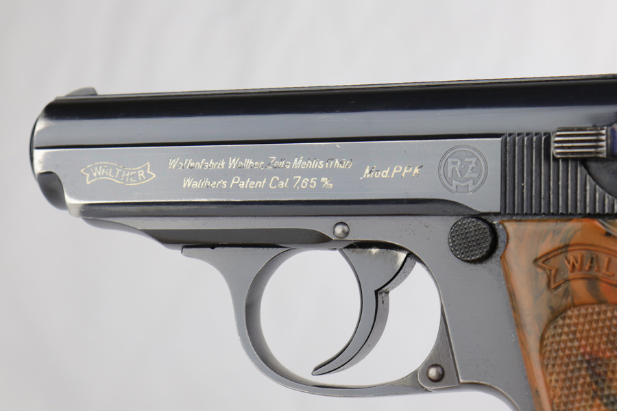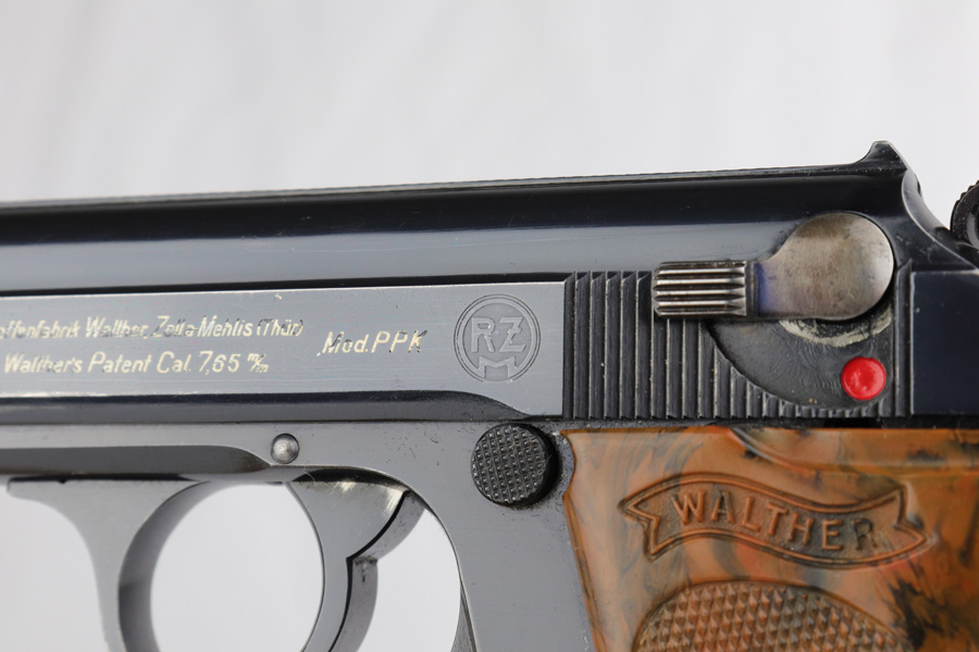 3/19/19 – This is an original and correct RZM marked Walther PPK from 1935. The RZM (Reichs Zeug Meisterei) was the equipment office of the NSDAP and was established to contract for equipment. These pistols were commonly thought to be issued to the German political leaders of the time. The bluing on this pistol rates at around 95-96%, with muzzle wear on each side of the slide, and some thinning on the front strap. Early 90 degree safety has a little fire blue remaining. Excellent grip and finger extension magazine with no major cracks or chips. Terrific bore.