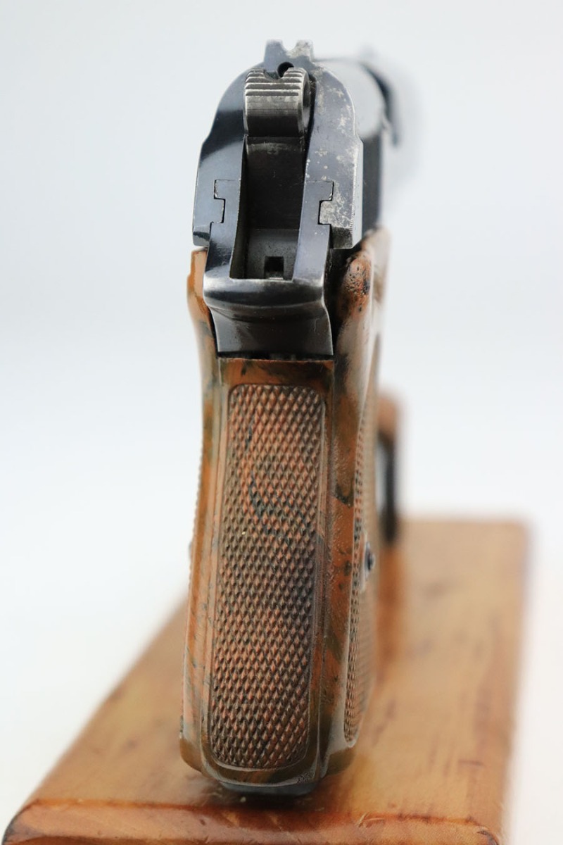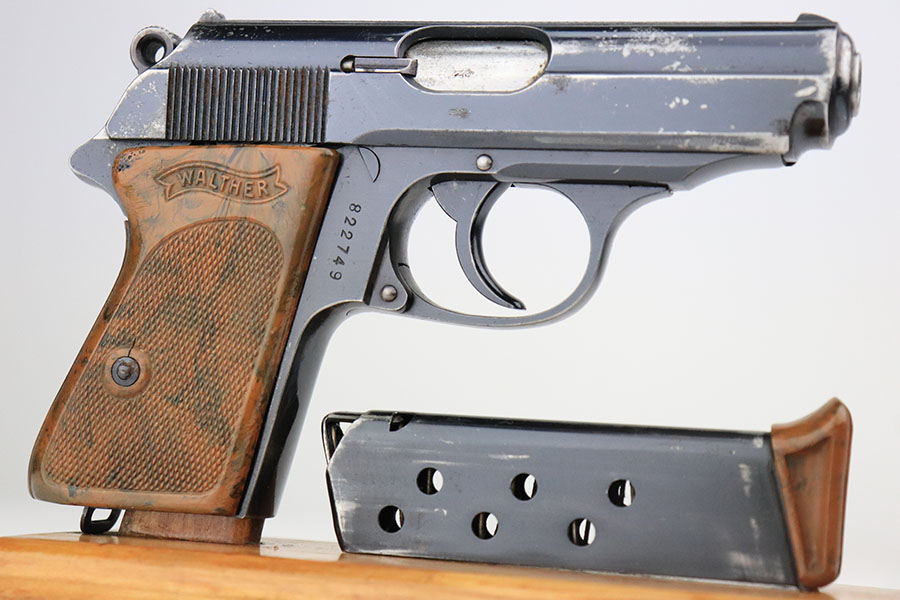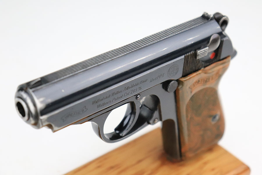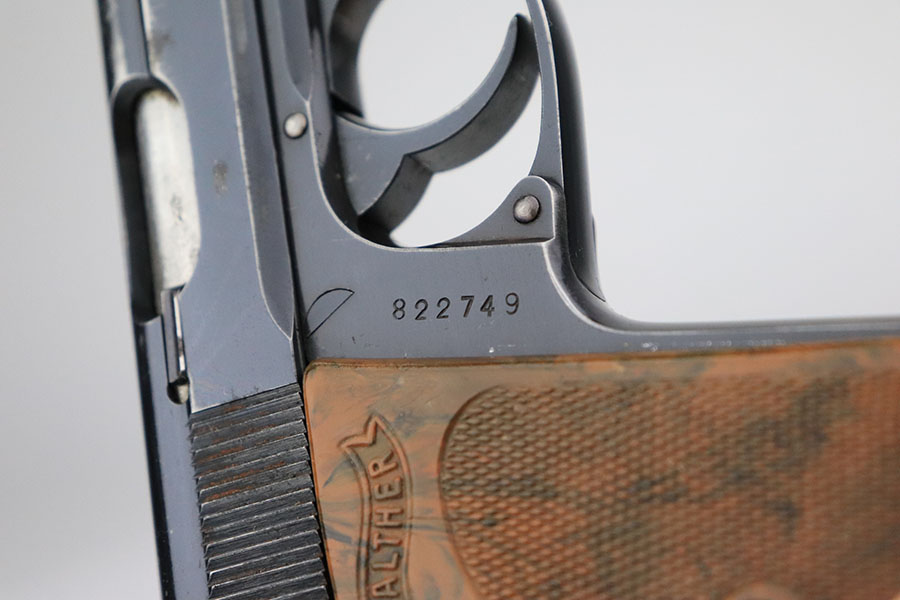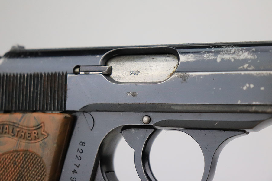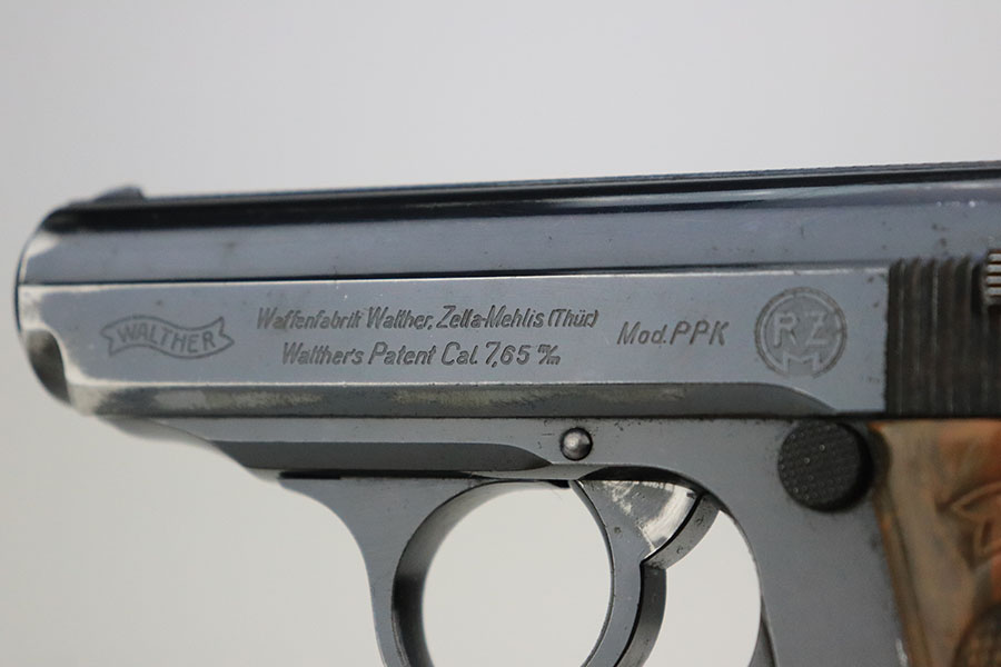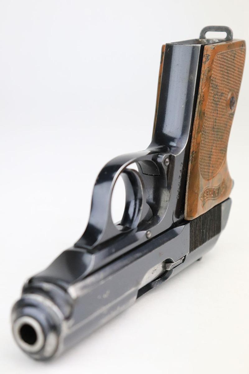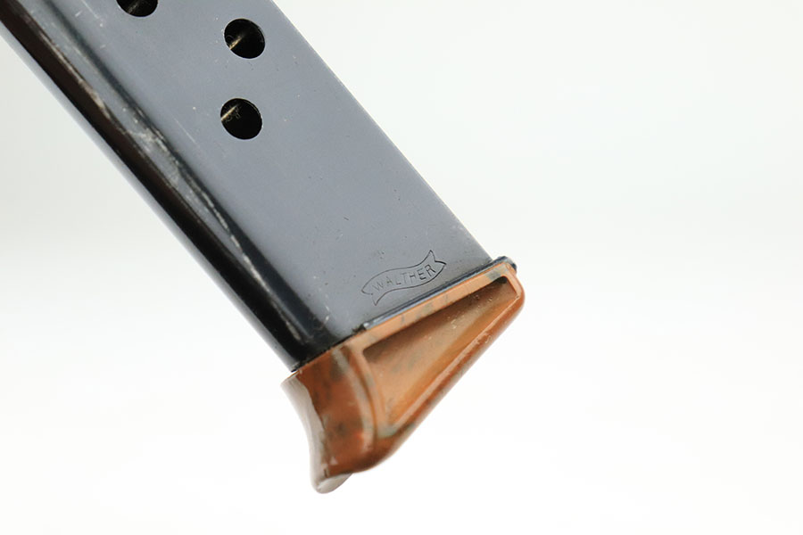 6/20/24 – This is an original and correct RZM marked Walther PPK from 1934-35. The RZM (Reichs Zeug Meisterei) was the equipment office of the NSDAP and was established to contract for equipment. These pistols were commonly thought to be issued to the German political leaders of the time. This one is all matching and has retained about 80% of its original finish. There is muzzle wear on both sides of the slide, and then more notable wear along the right side of the slide. Comes with a period-correct grip and Walther banner-only finger extension magazine. The grip has a stress crack from the screw being tightened too far, and there’s also a series of small dots/holes in the upper corner on the right side (not sure what caused this). Terrific bore. The magazine is also in great condition with no cracks in the base.