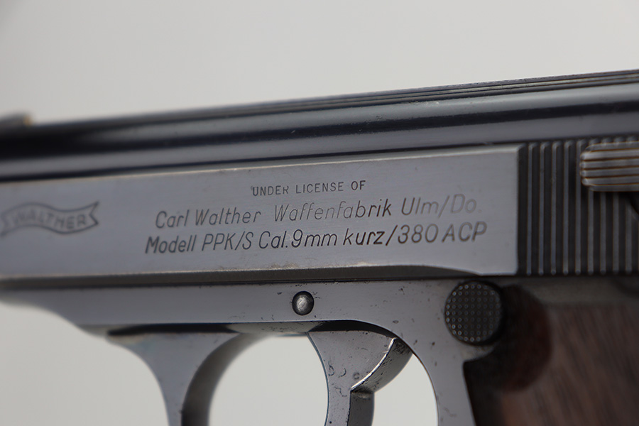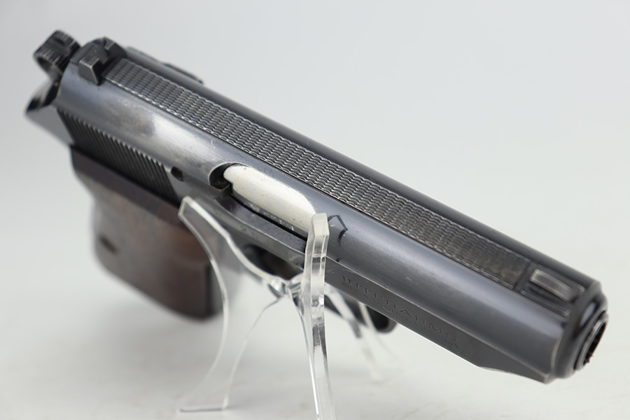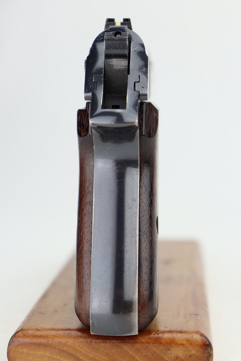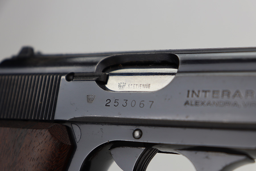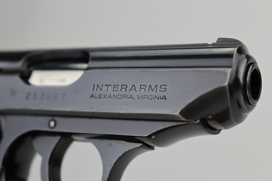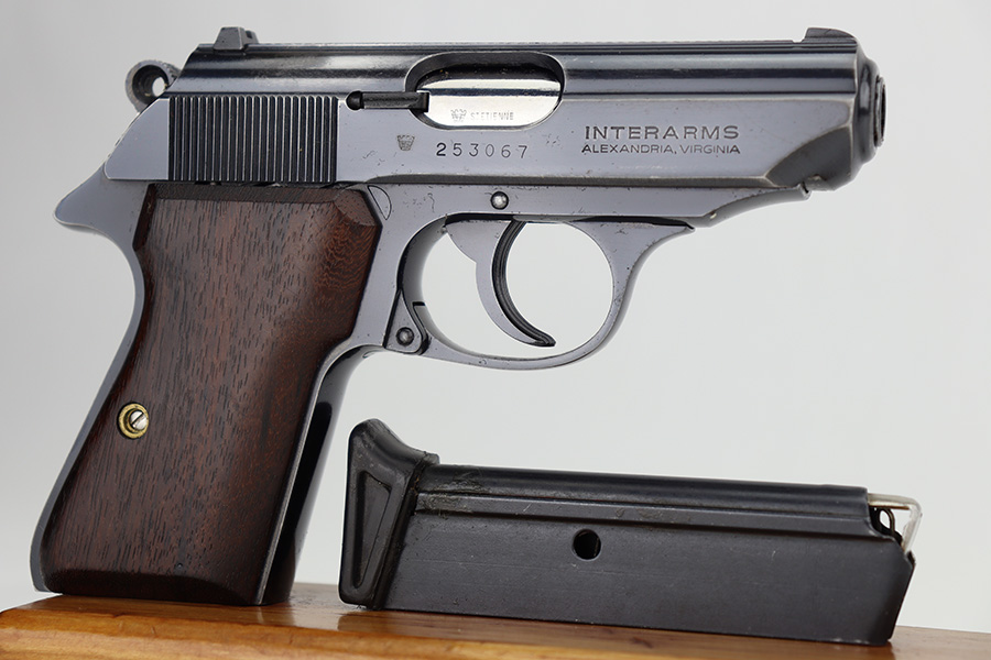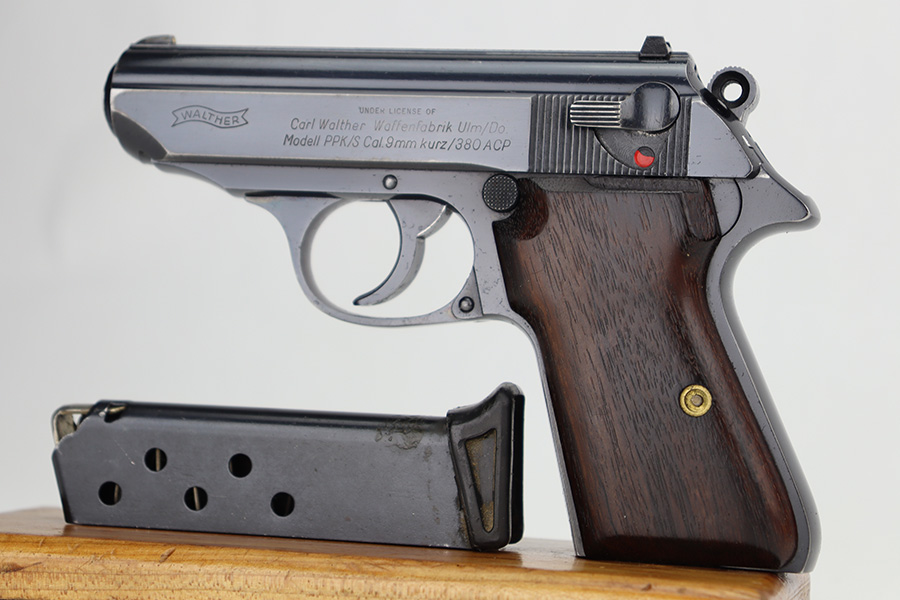 12/27/23 – This is a very nice example of a Walther PPK/S, chambered in 9mm kurz or .380 ACP. The slide and barrel are St. Etienne-proofed, and the slide is Interarms marked. The finish rates about 94% with very minor muzzle wear and an area of thinning on the right side of the slide. Fitted with very nice wood grips and comes with a black finger extension magazine. Mint bore. The hold-open does not work properly with this magazine.