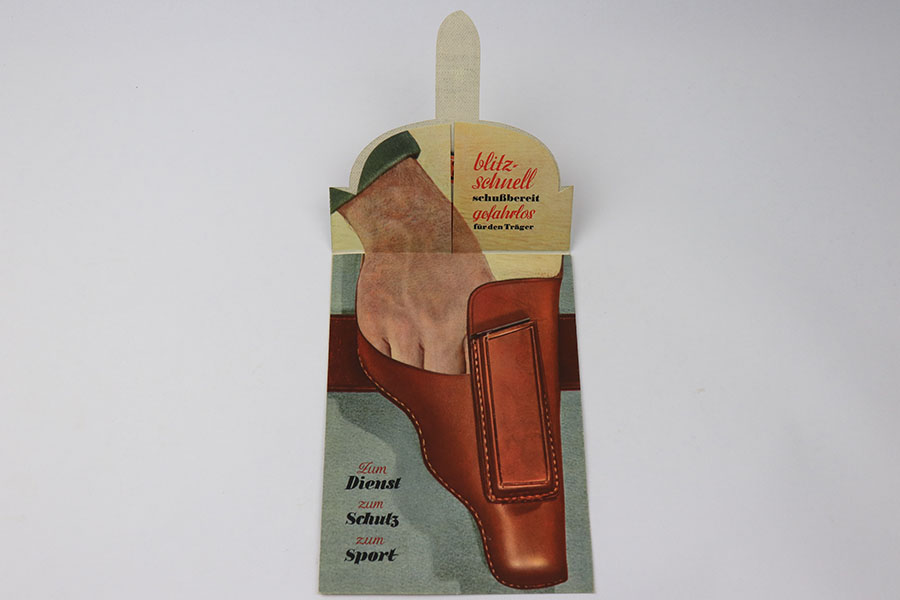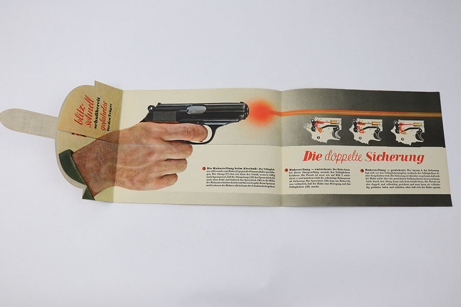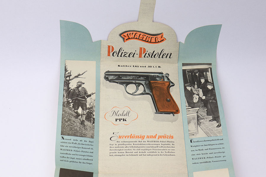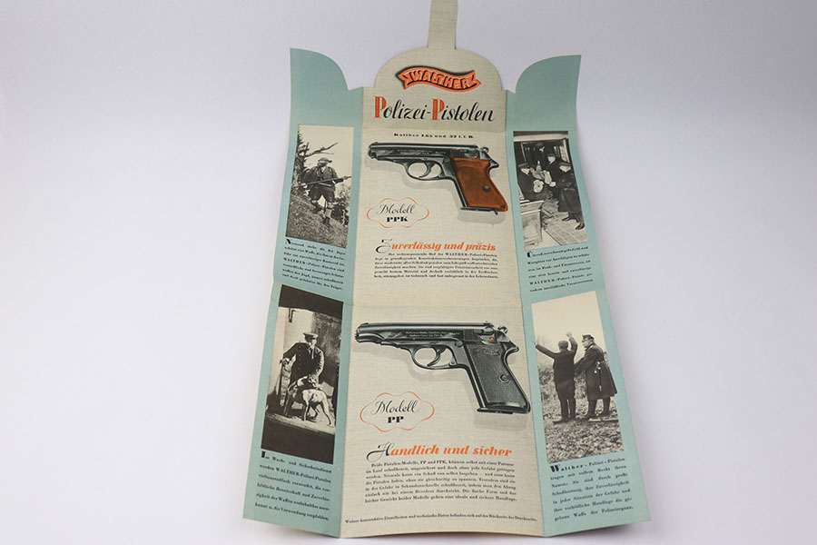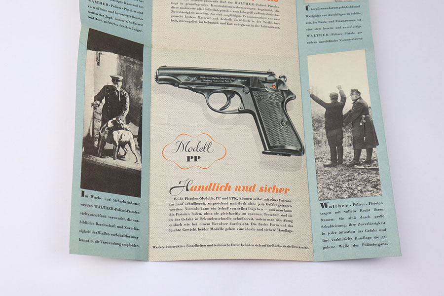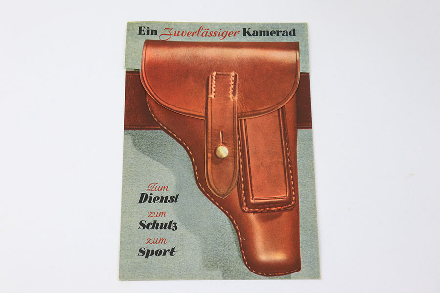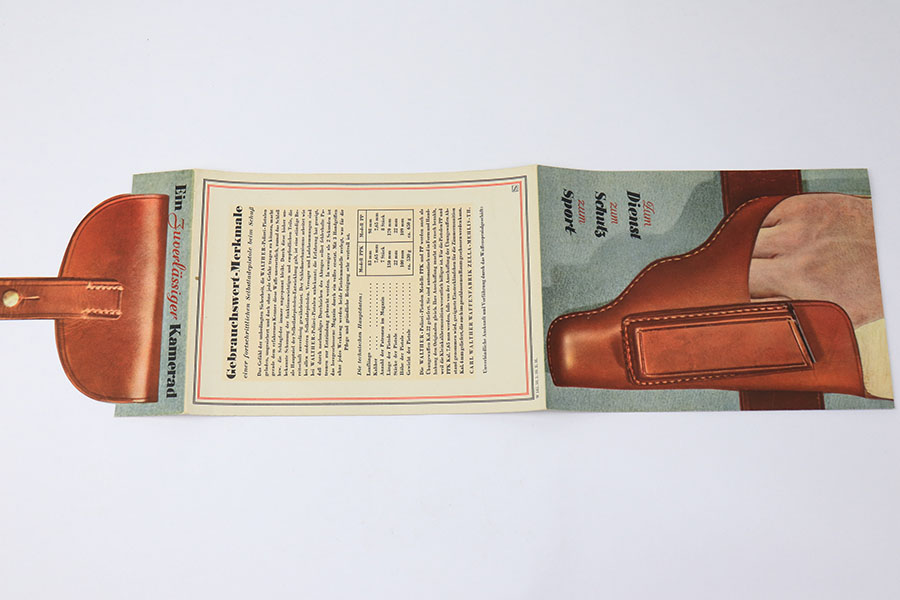6/1/21 – This is a cool 1939 dated Walther PPK Salesman’s Brochure. The pamphlet unfolds and shows a semi picture-story of how the gun holsters and operates. Excellent color printing with mild signs of aging and pages all intact with no excess damage or wear. The back of the pamphlet shows the 1939 date. A very cool piece of WW2 history.