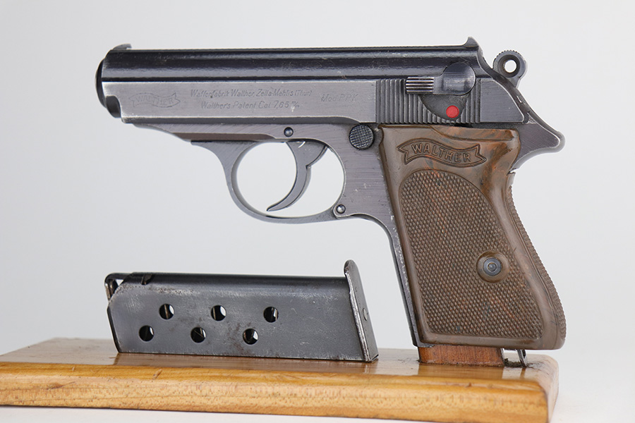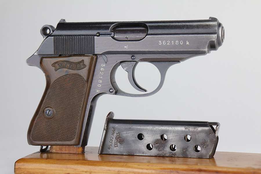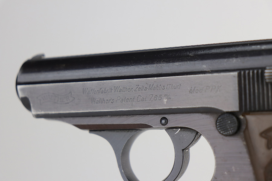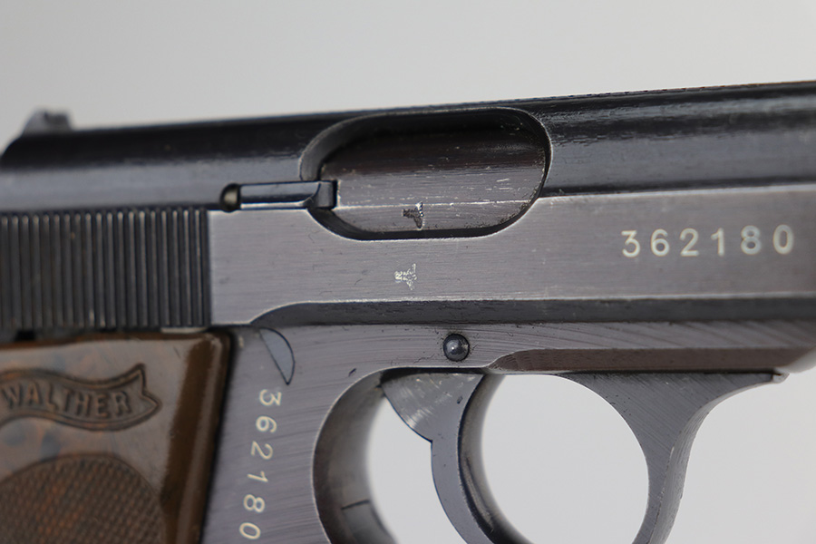 11/2/21 – This is a very nice example of a Walther PPK manufactured in 1942. It it is in the correct serial range for a gun delivered to the SS. It also comes with a near-matching bottom-numbered magazine. So it is very possible this gun was issued to the SS. It is all matching and has the proper “Eagle N” proofs. It has retained about 90% of its military finish. The bluing has a slight plumb color to it. Most of the wear is on the right side of the slide, near the muzzle. There is also minor wear along all of the high edges and some scratchy wear on the round edges of the slide. There is minor pitting on the front strap and an area of minor pin-pricking on the left side of the slide. Comes with an excellent chocolate-colored grip – just a hairline crack in the spine. The bore is shiny with strong rifling and some minor frosting in the grooves.