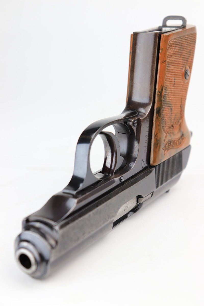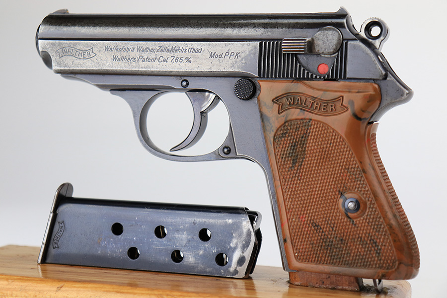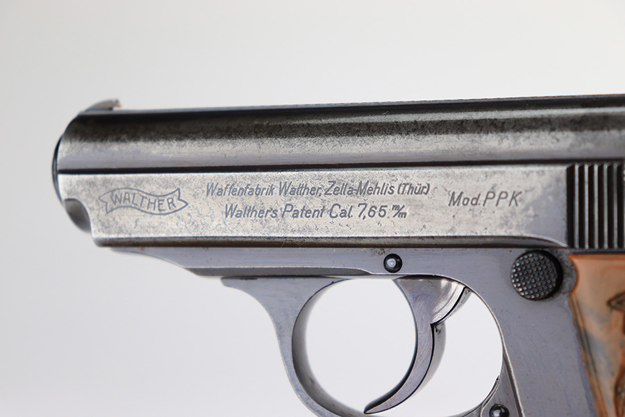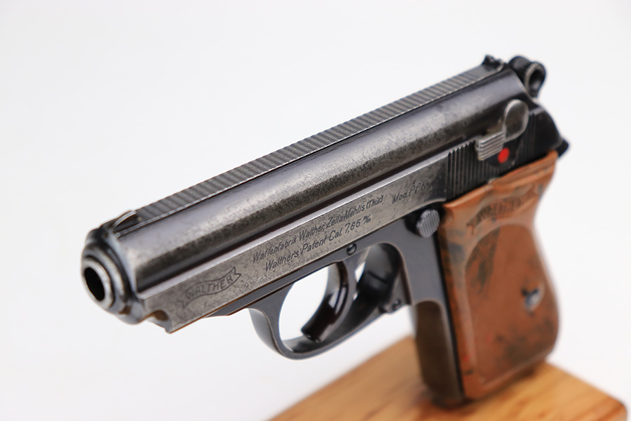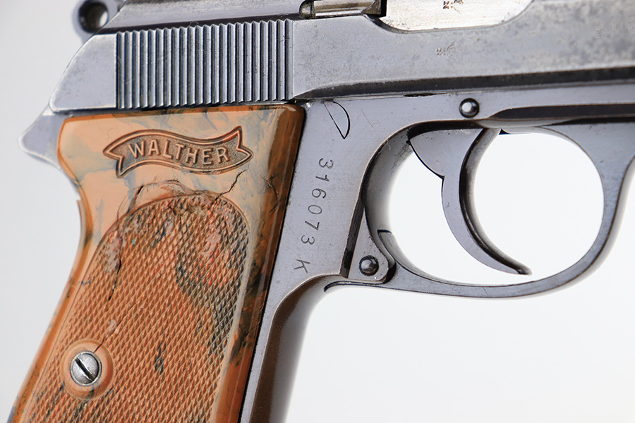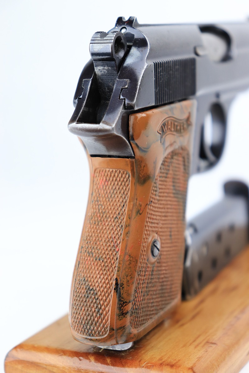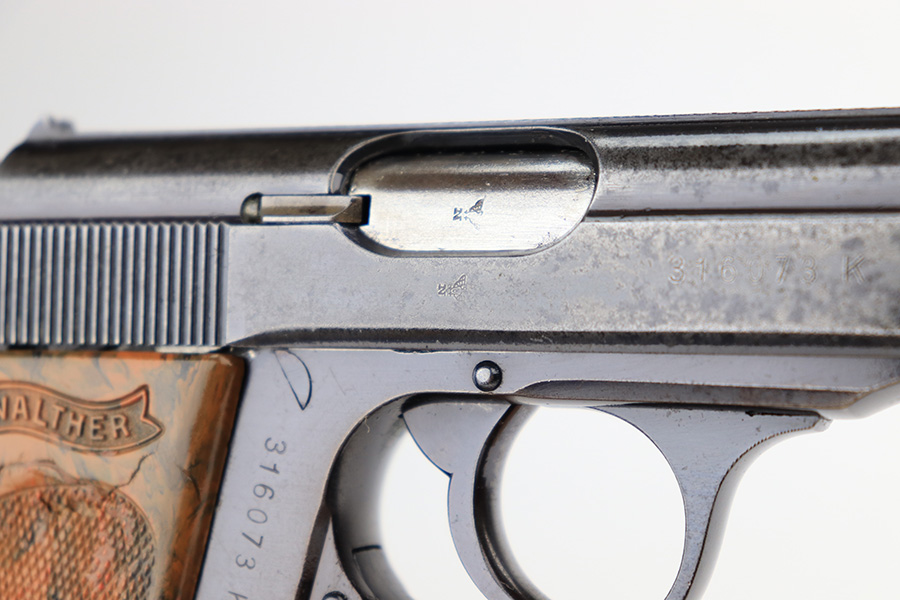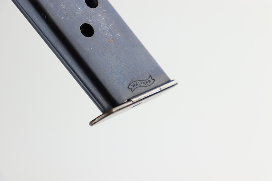 3/29/22 – This is a nice example of a Walther PPK issued to the SS in 1941. The gun is all matching and has the proper “Eagle N” proofs. This gun does not come with a matching magazine, but it is in the proper range for an SS-contract pistol. We know the owner of the matching-numbered magazine in Austria. We have reached out to him with no answer. We will provide this info to the purchaser of this gun. It has retained roughly half of its original finish. The majority of the finish loss is on the slide, where there is also pin-pricking and tiny dots of oxidation. Minor thinning on the front strap. Comes with a brown grip – there is some noticeable cracking on the right side. Also comes with one Walther banner-only magazine. Note: the slide does not lock back with this magazine unless applying pressure to the mag bottom. Mint bore.
