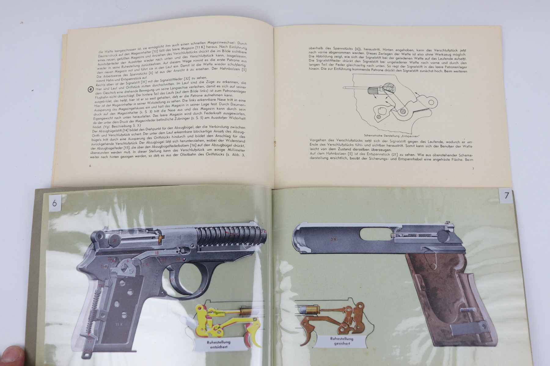 7/30/20 – This is a rare, desirable trans-art style Walther PPK manual. The pamphlet is believed th be dated 1935- due to the ’35’ on the back. These pamphlets are extremely rare and desirable because of the unique trans-art pictures that slowly cut away the interior of a Walther PPk. The trans art is 8 pages in color and the pages open horizontally. After the 8 pages of transart the rest of the pamphlet opens up vertically. This is a very unique design, and a genius idea for the time. The pamphlet has some minor wear and signs of use throughout, but overall is in excellent condition and completely in tact with no binding or page issues. The part of the pamphlet that opens vertically is attached to the rest of the pamphlet. Everything is guaranteed original and authentic.