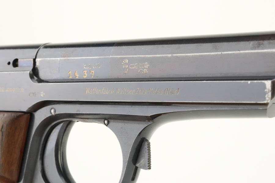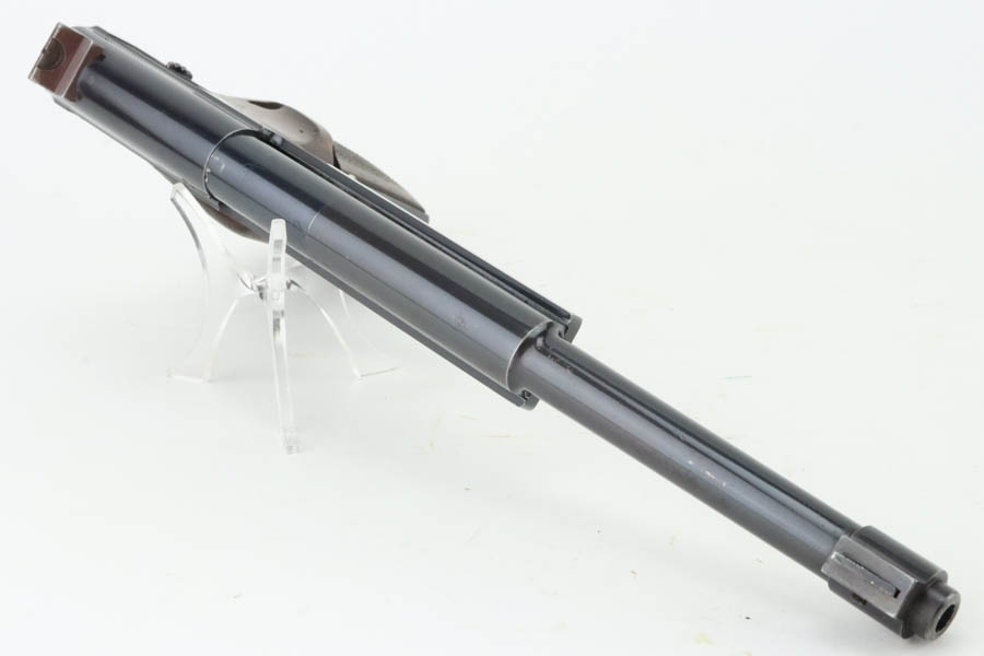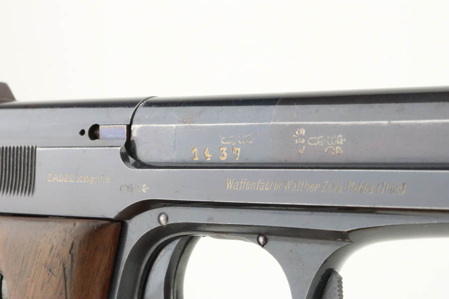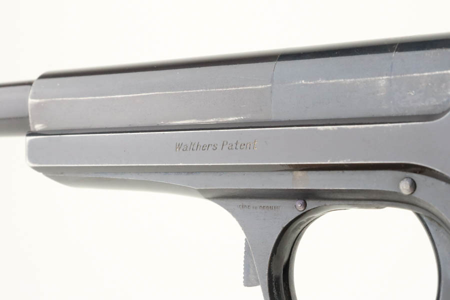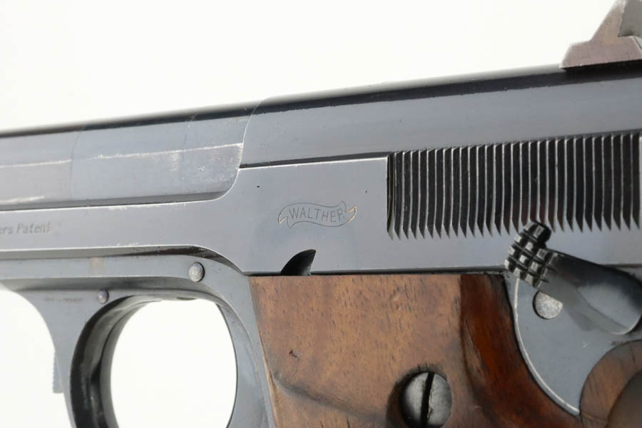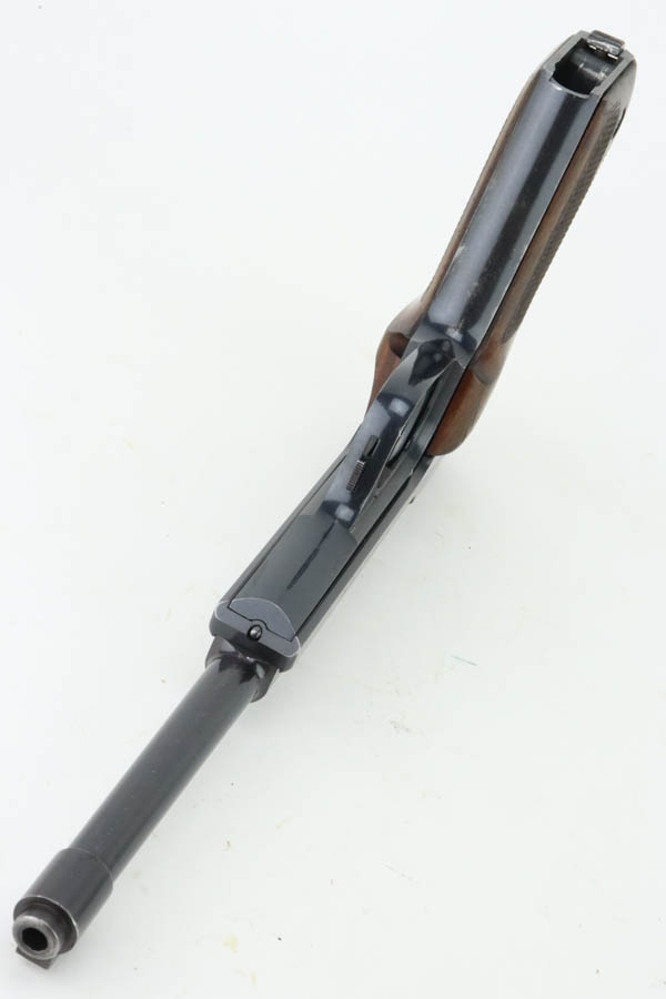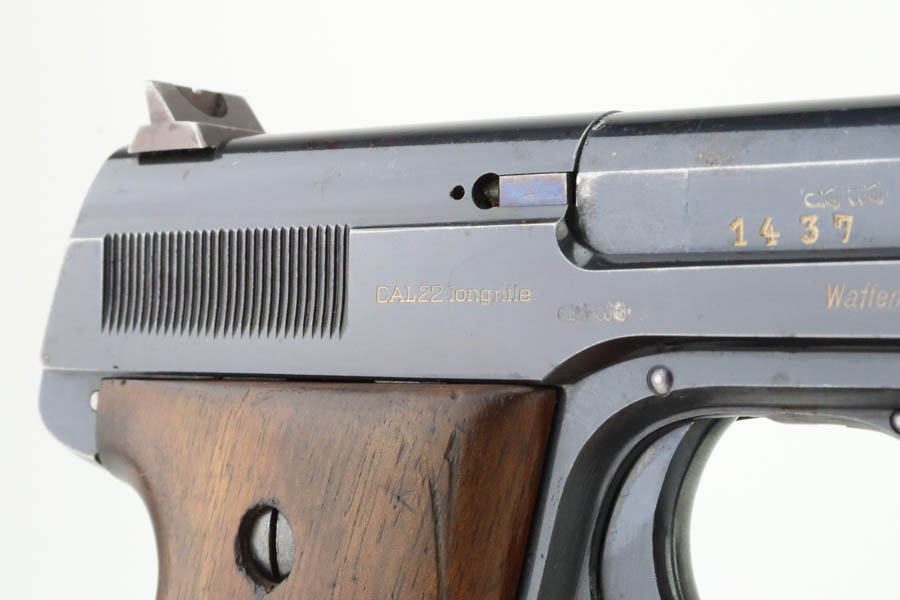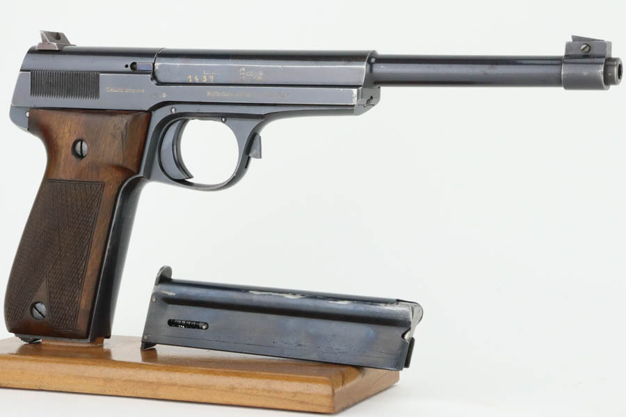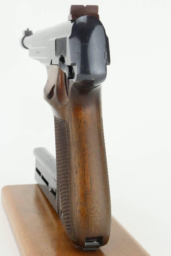 6/14/24 – This is a very nice example of a Walther Sport Model 1926 Olympia semi auto target pistol, manufactured in the 1930’s and chambered in .22 LR. All matching with the proper “Crown BUG” proofs. This pistol features a second slide notch for single action operation. This style pistol was used in the 1932 Olympics, under the designation as the Walther Olympia Rapid Fire Model. This style gun is also commonly referred to as the “1932 Olympia”. Its original high polish finish rates about 90% with general minor high edge wear, minor muzzle wear, and some wear on the front strap. Fitted with a checkered one-piece wood grip and comes with one proper magazine. Mint bore.
