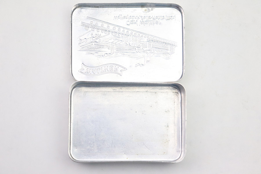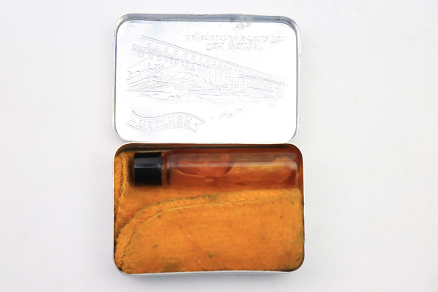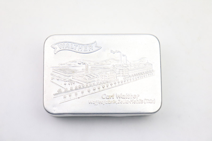 10/25/22 – This is a great example of an original Walther tin from WW2. The tin is in great overall condition with minimal wear throughout and no major dents in the metal. Included is a WW2 style oiler and a yellow oil cloth. The oiler still contains residual oil, of an unknown age, that has lost its viscosity. The yellow cloth shows use but has no structural issues or major fraying/tearing to note.