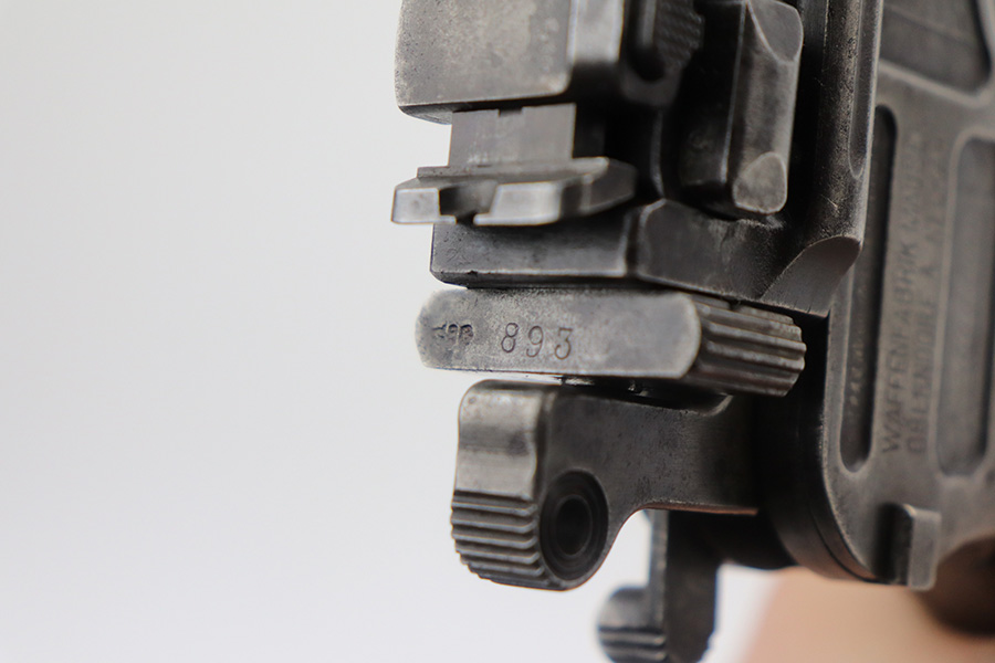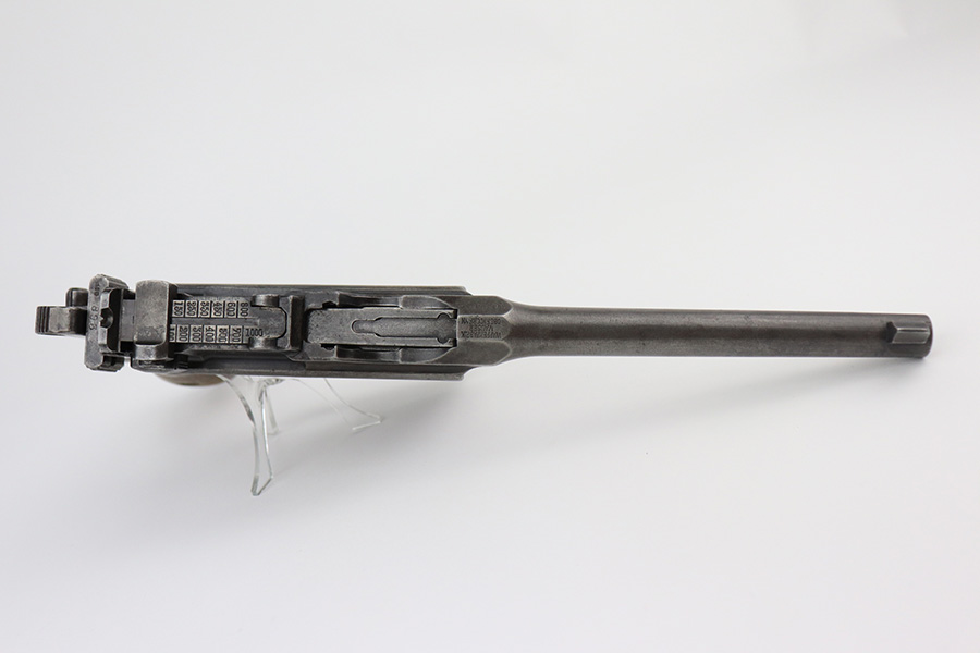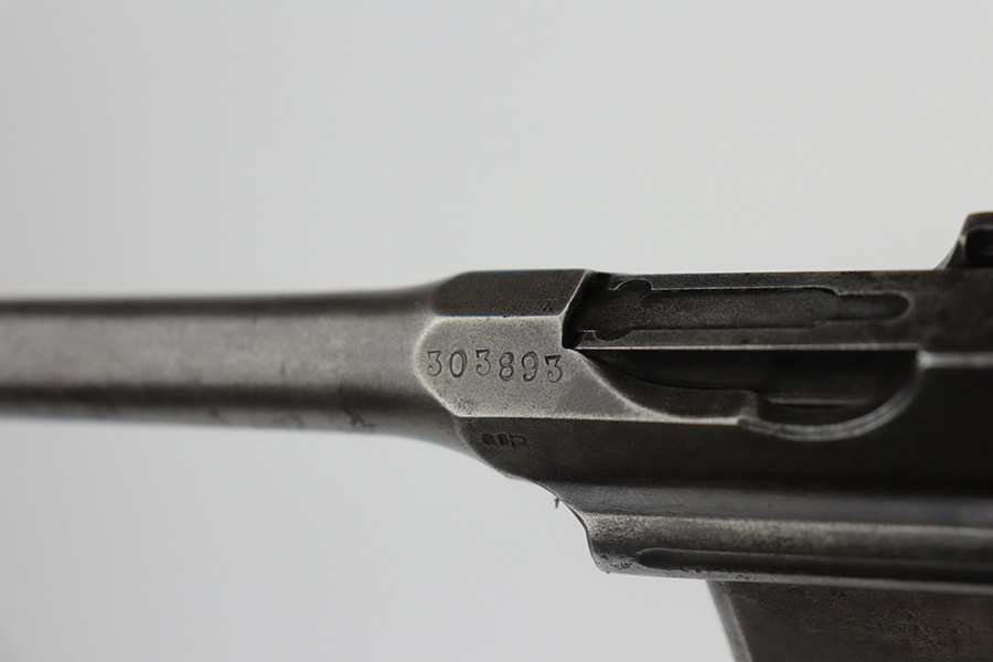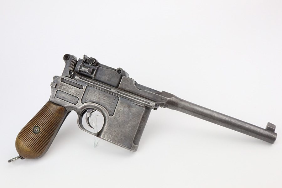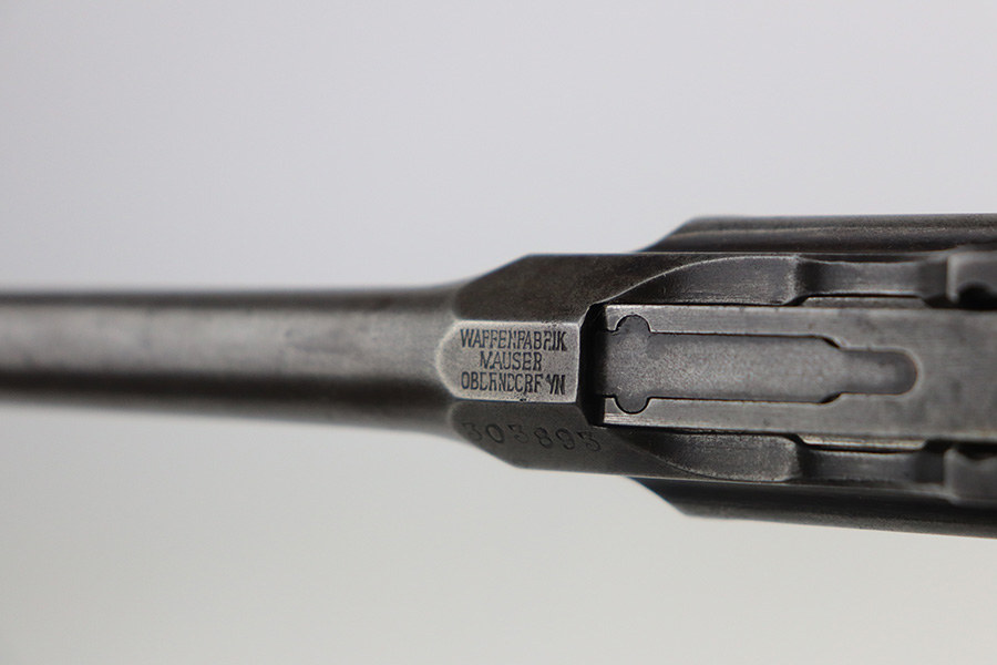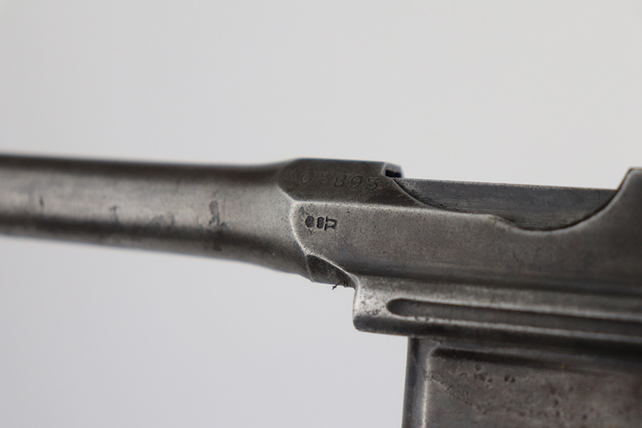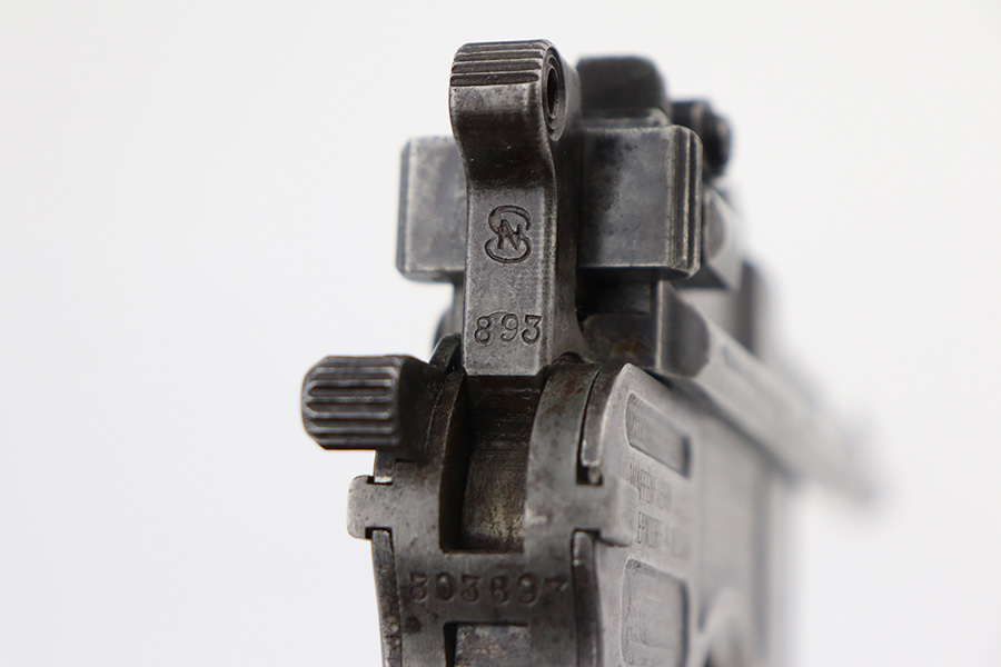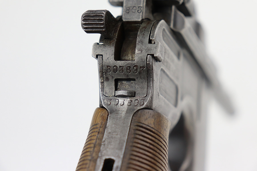 6/29/21 – This is a nice example of a wartime commercial Mauser C96, chambered in 7.63mm. This is all matching, has the proper “Double Crown U” proofs, and has an Imperial acceptance proof on the right side of the slide. It has lost almost all of its original finish with minor patina and spotty oxidation throughout. Areas of minor pin-pricking throughout. Comes with nice original matching grips. The rifling in the bore is just slightly worn with minor pin-pricking throughout.