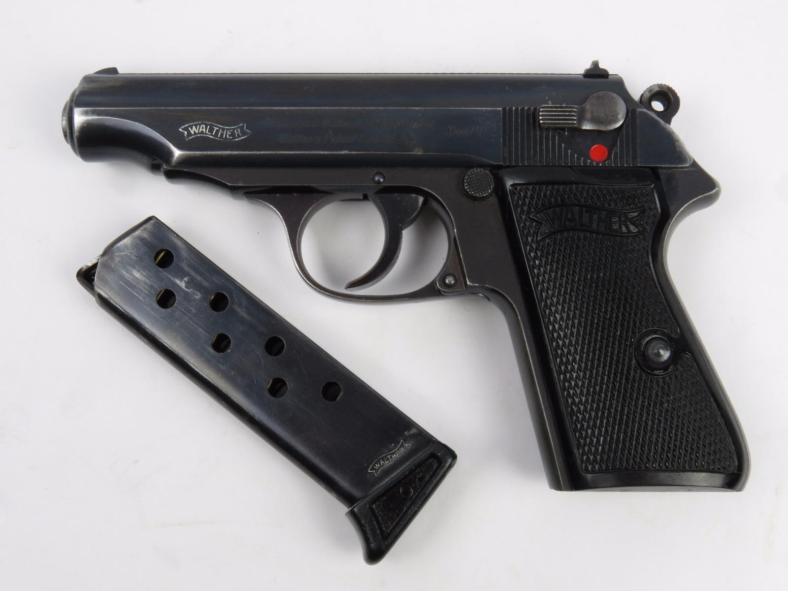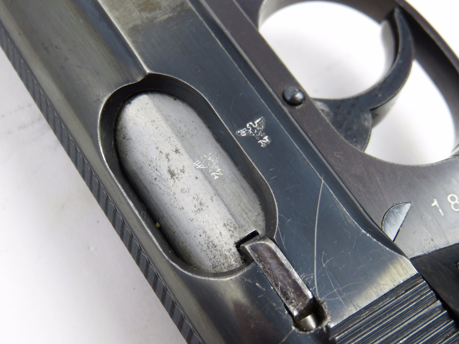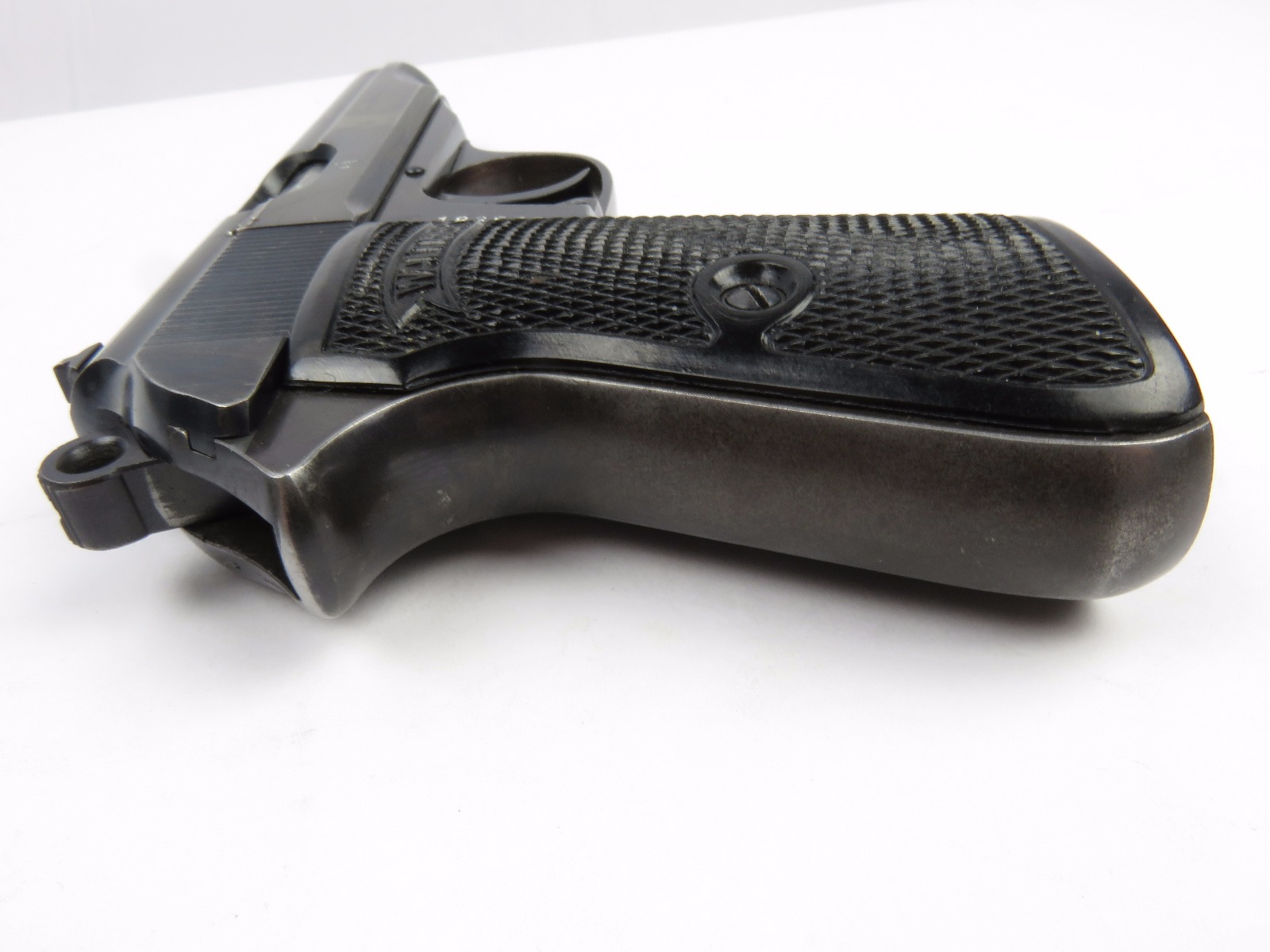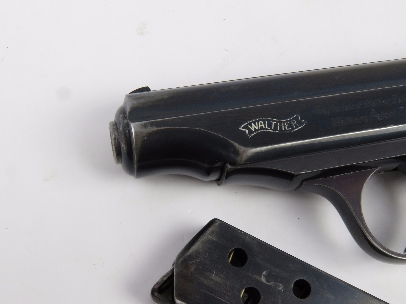11/17/17 – This is an wartime production Commercial Walther PP pistol. The pistol has some early features like a Walther banner stamped finger extension magazine and a high polish finish. The finish has honest wear throughout, and obviously saw some use. The front and back straps are missing most of the finish, giving way to some light brown patina. The right side of the slide has an area of bluing loss as well – as shown in photos. Additionally, there’s some light muzzle/edge wear and some light scratches on the slide. This wear is all accurately shown through the photos. The bore has nice rifling but there is some light patina. Guaranteed all original and authentic.