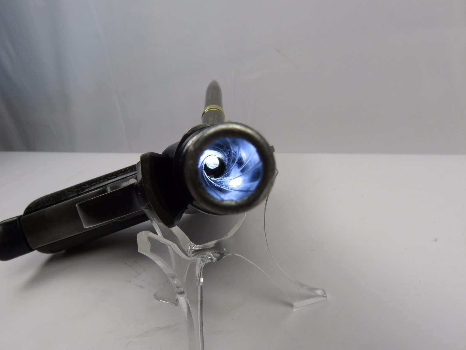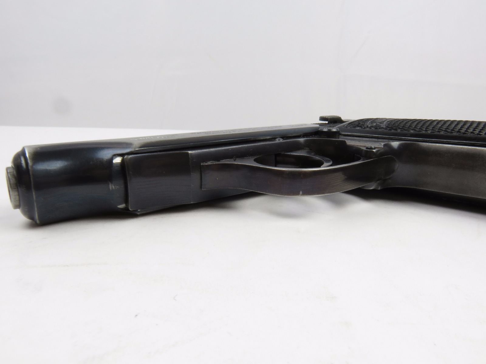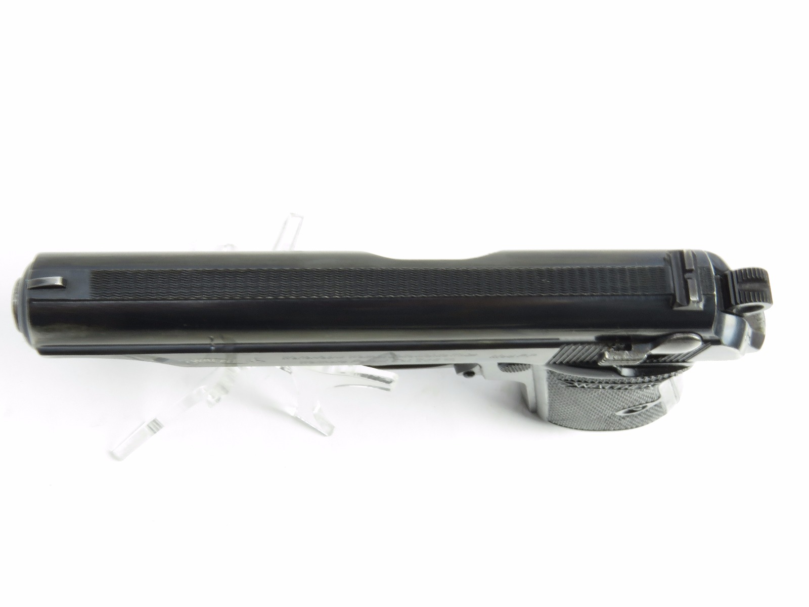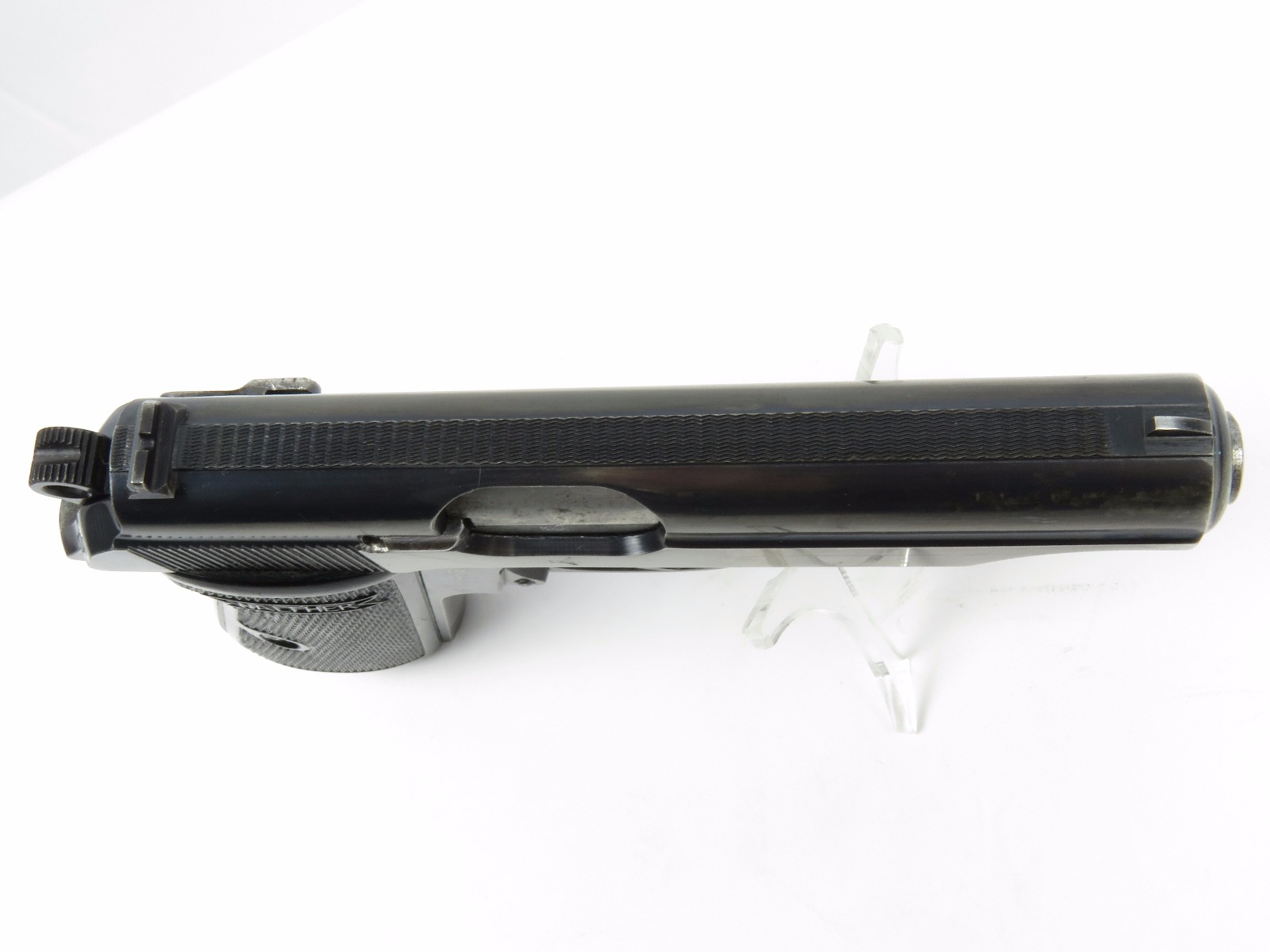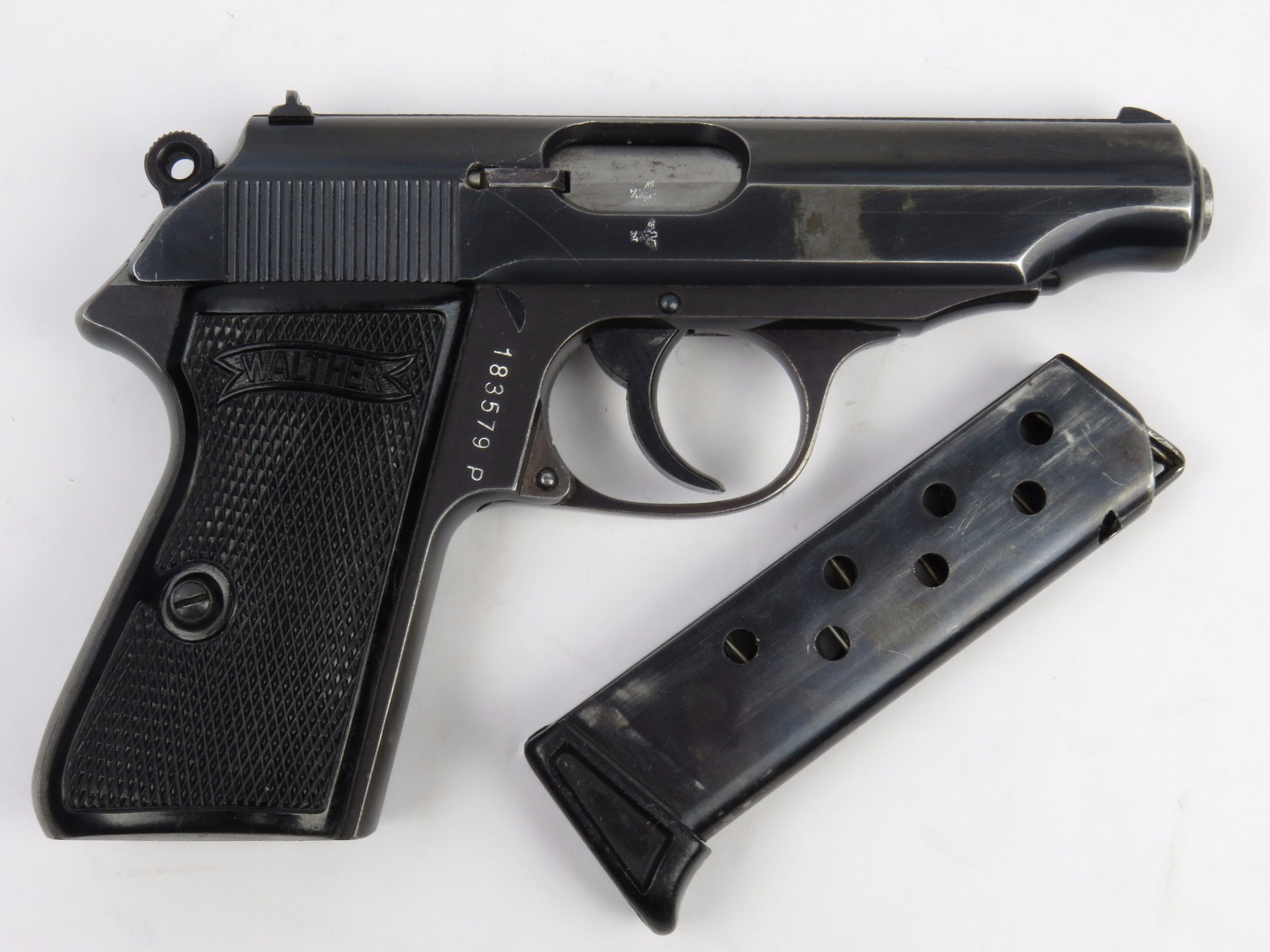 11/17/17 – This is an wartime production Commercial Walther PP pistol. The pistol has some early features like a Walther banner stamped finger extension magazine and a high polish finish. The finish has honest wear throughout, and obviously saw some use. The front and back straps are missing most of the finish, giving way to some light brown patina. The right side of the slide has an area of bluing loss as well – as shown in photos. Additionally, there’s some light muzzle/edge wear and some light scratches on the slide. This wear is all accurately shown through the photos. The bore has nice rifling but there is some light patina. Guaranteed all original and authentic.