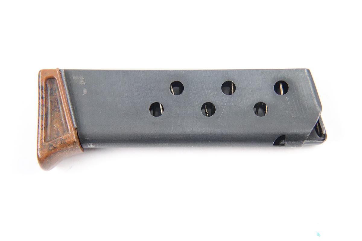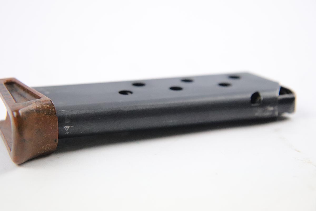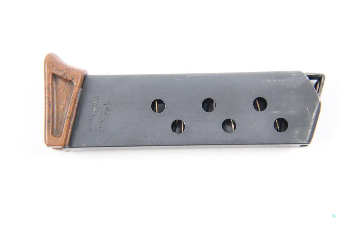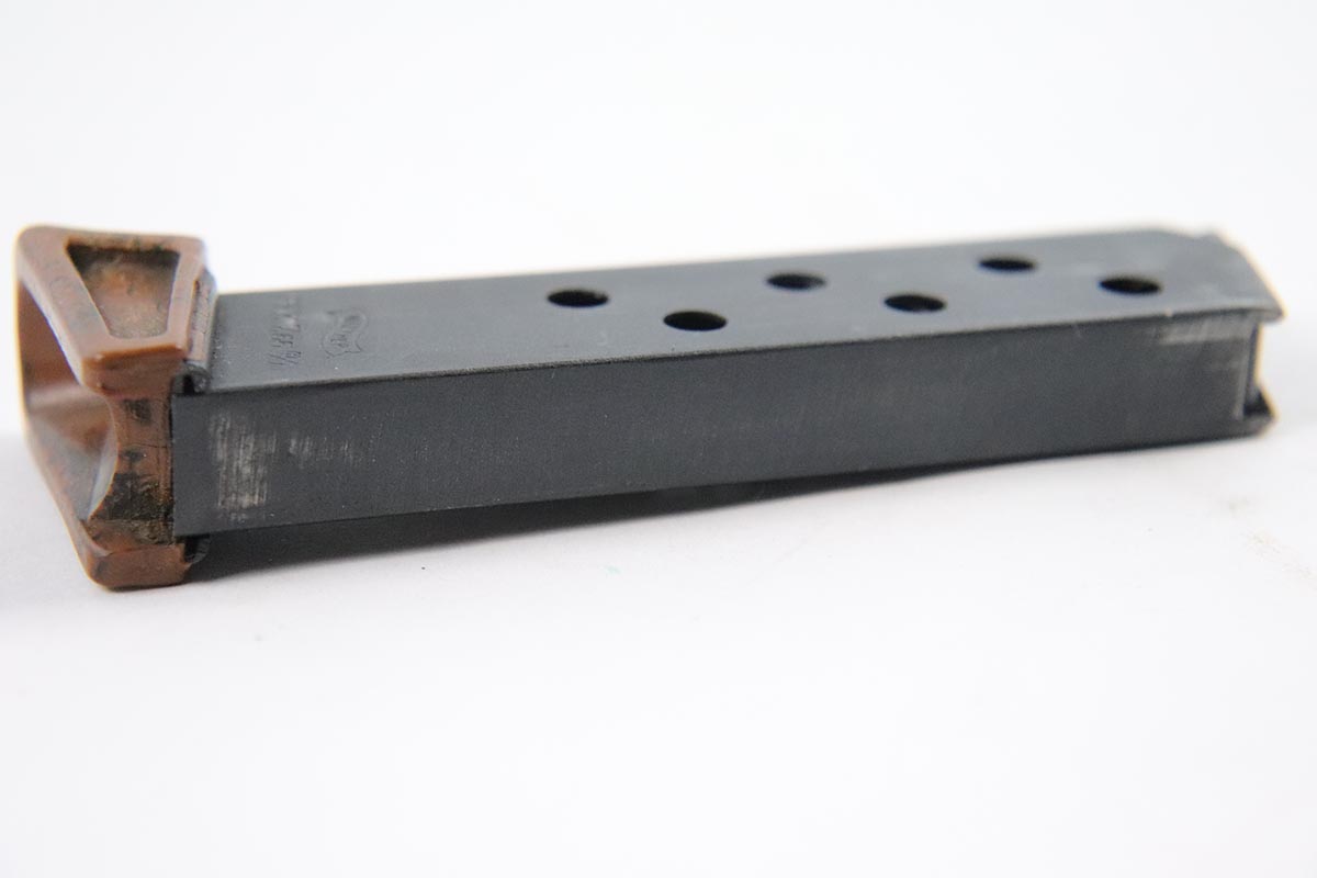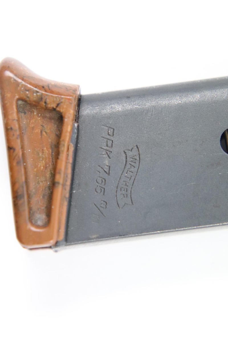 5/17/18 – This is an original WW2 wartime PPK magazine. The magazine has an excellent bakelite finger extension with thick-lip (correct for wartime). The magazine has a dull blued finish in excellent condition. Guaranteed original and functional.
