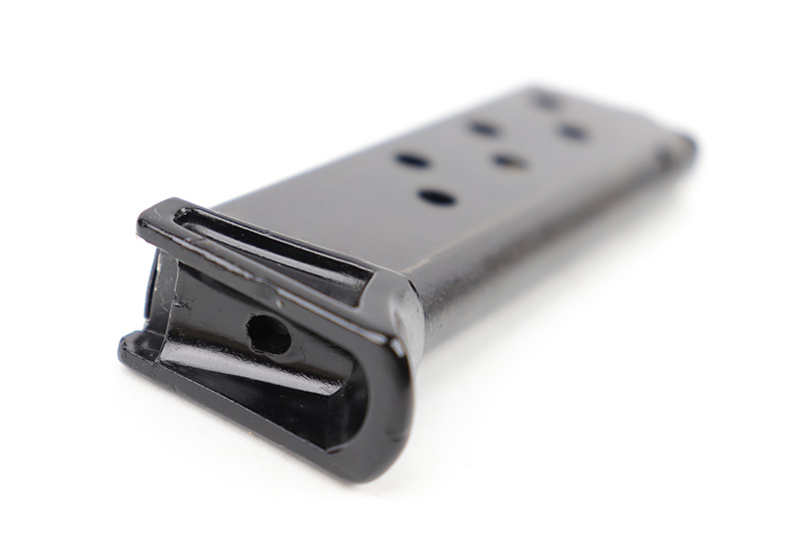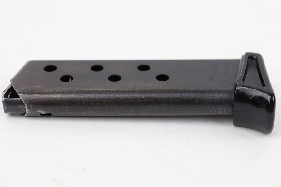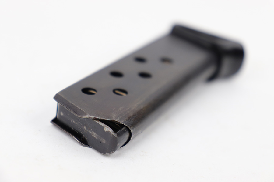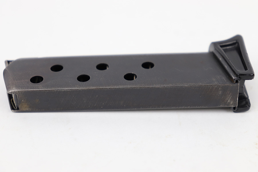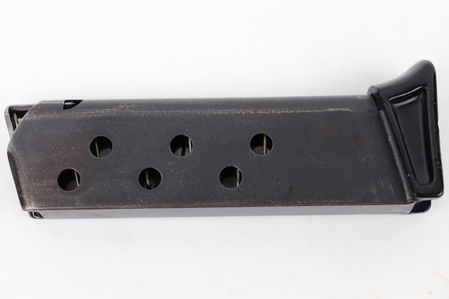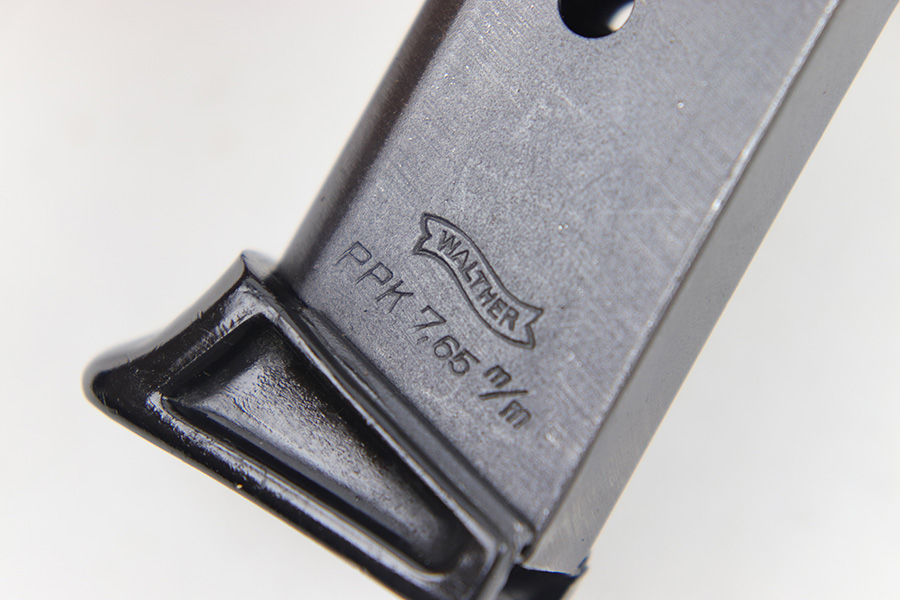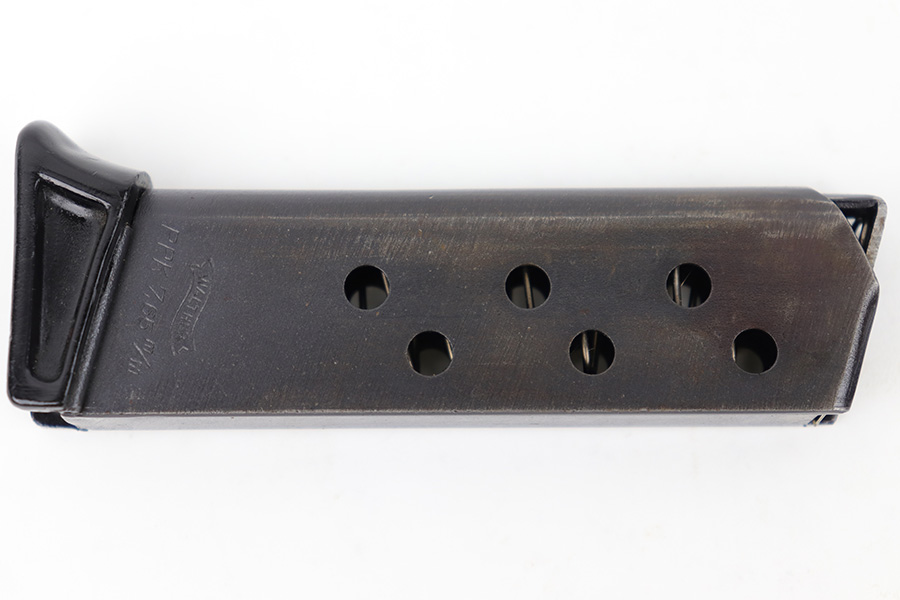 4/18/23 – This is an excellent condition WW2 wartime production Walther PPK magazine. The magazine has a black finger extension base with a later-variation “thick lip”. The wartime finish on the magazine tube is in great shape with some mild thinning but no notable flaws. Strong, smooth functioning spring.