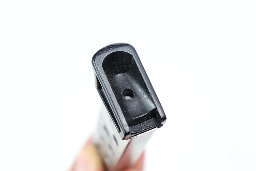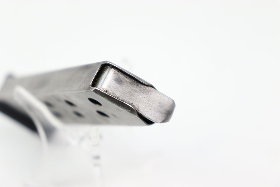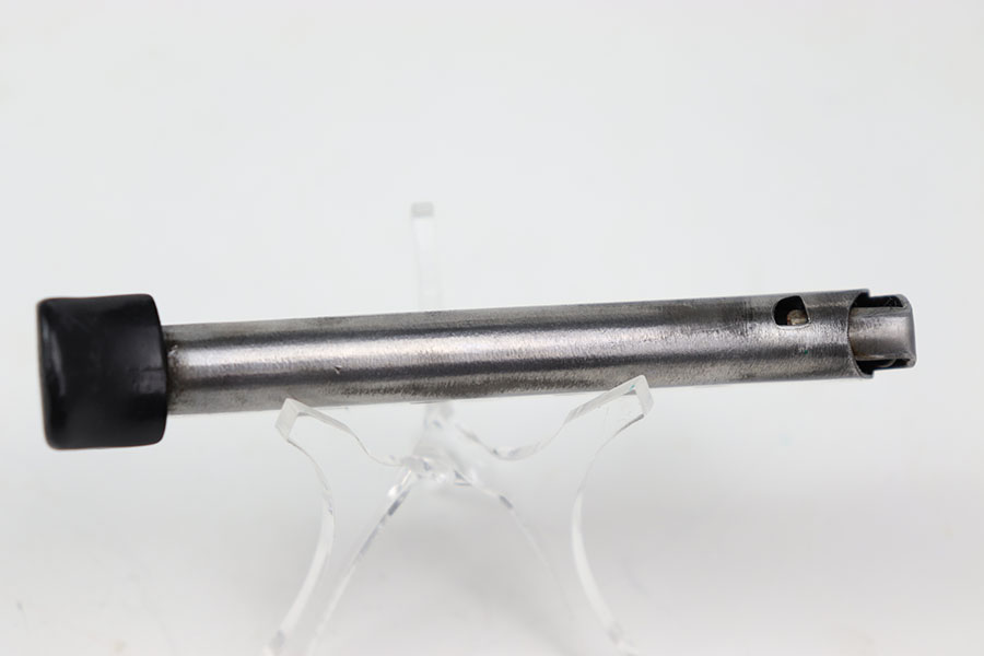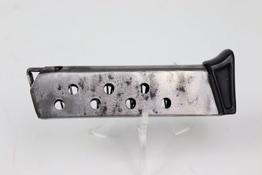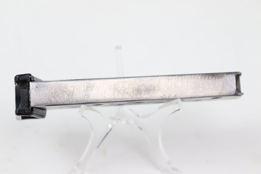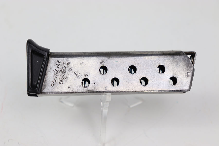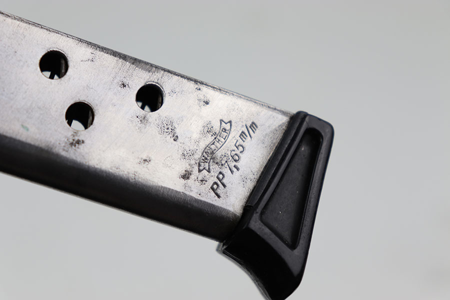 6/27/24 – This is a WW2 era Walther PP magazine with a black bakelite thick lip finger extension. This magazine has all of its original bluing removed and has some honest amounts of oxidation throughout the tube. The black finger extension is in good condition with only one hairline crack on the backside. Marked with the Walther banner and PP 7,65 m/m on the left side of the tube. Spring is fully functional.