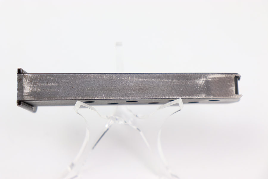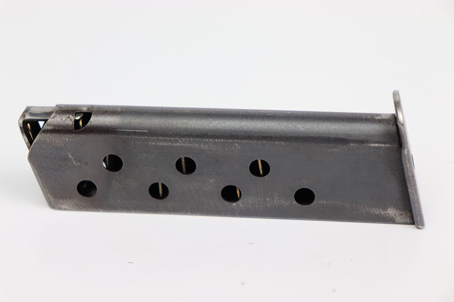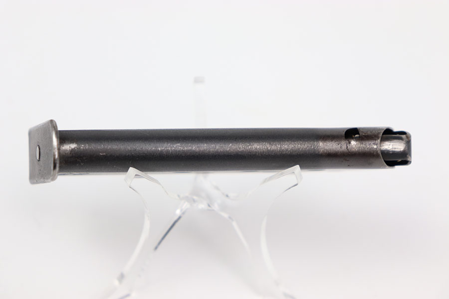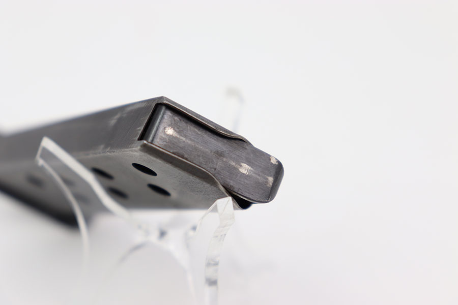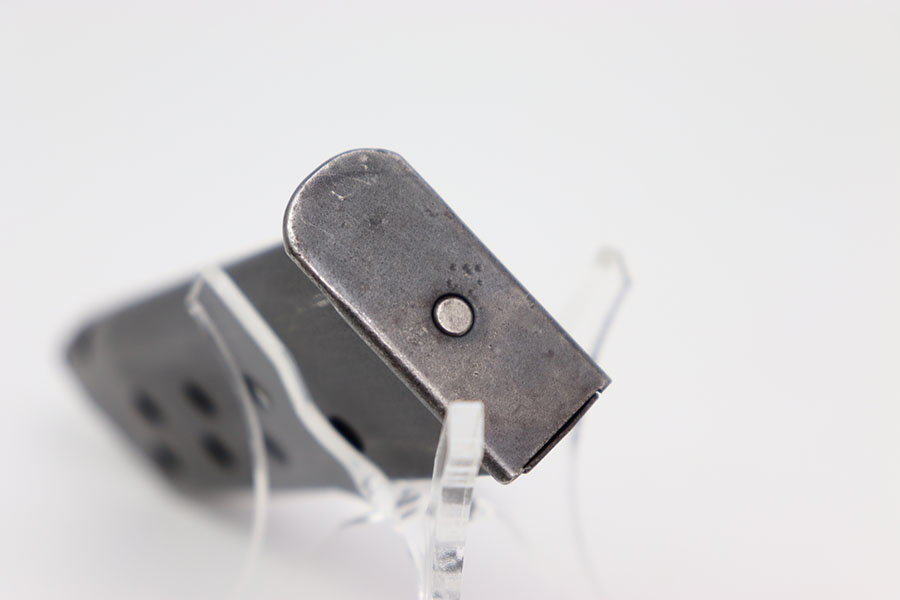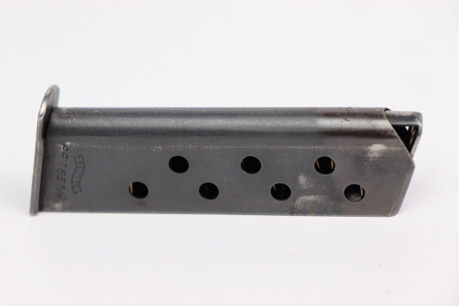 2/22/24 – This is an original WW2 wartime pp magazine. This magazine is in excellent condition with most of its original dull bluing. There is some light wear focused around the edges near the top third of the magazine tube. The left side of the magazine is stamped with the Walther banner and below with “PP 7,65m/m.” The base of the magazine is in great condition. The spring is strong and fully functional.