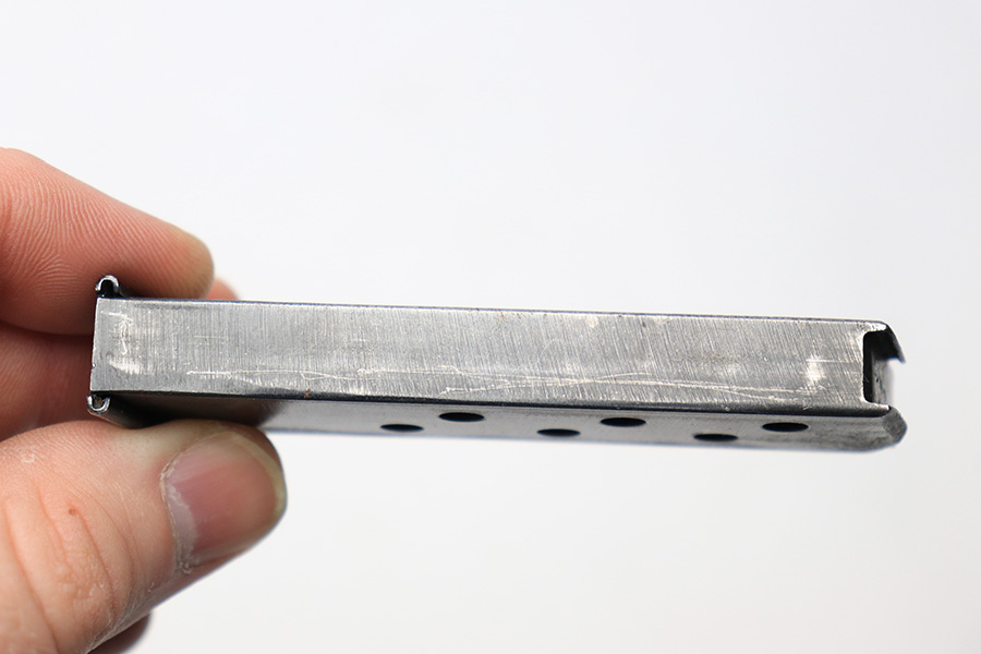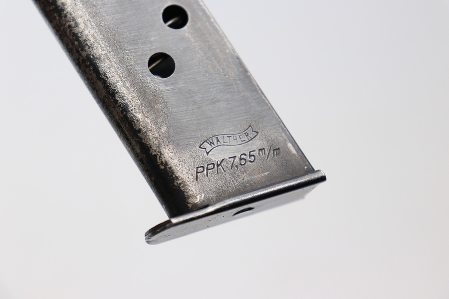 4/22/22 – This is an original wartime Walther PPK magazine. The magazine has a Walther banner with model and caliber information underneath. The tube has some finish loss throughout, but mostly on the front spine. There is some surface patina on the right side of the magazine, towards the top of the magazine but this is mild and doesn’t have texture. The spring is strong and functional.