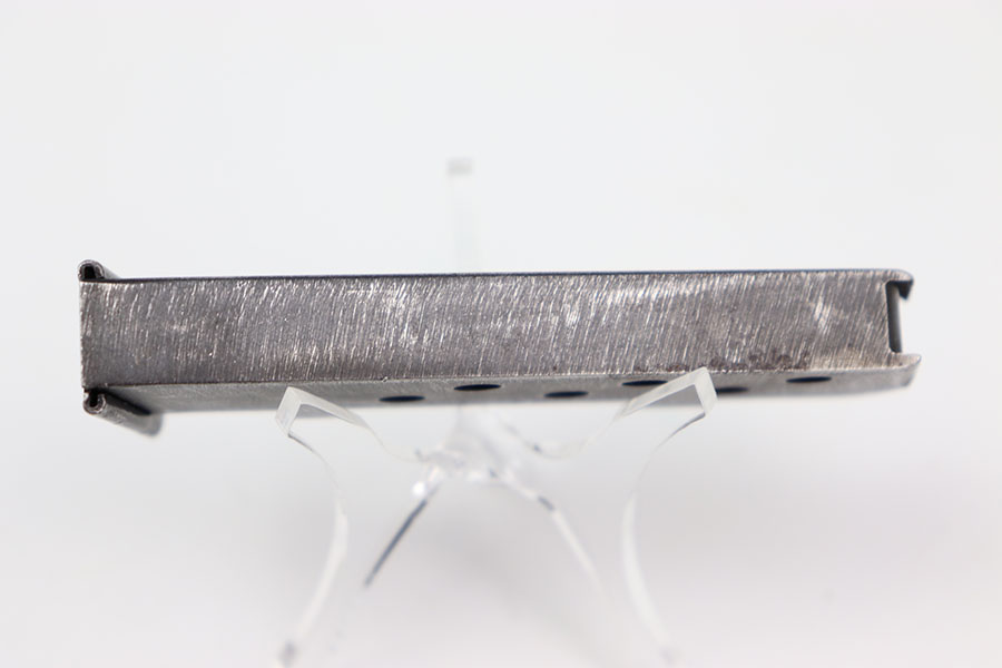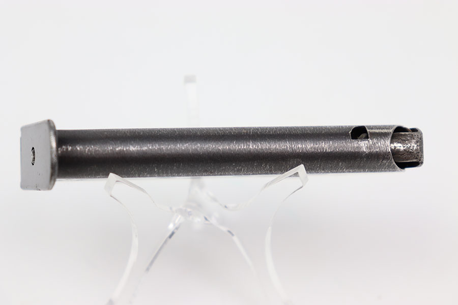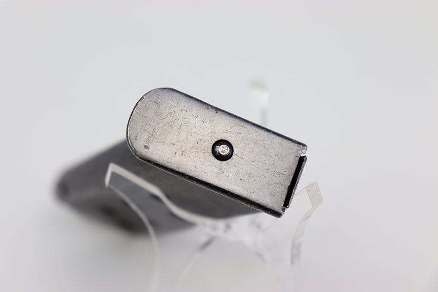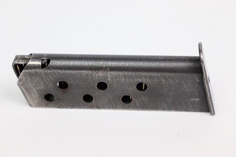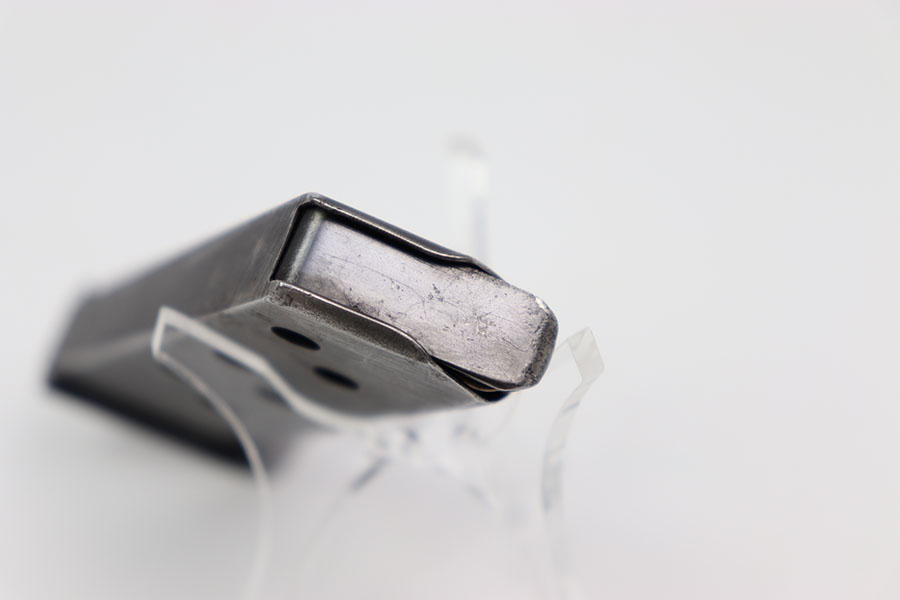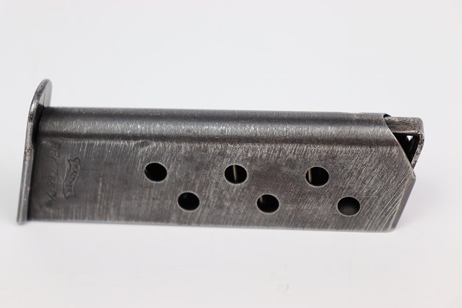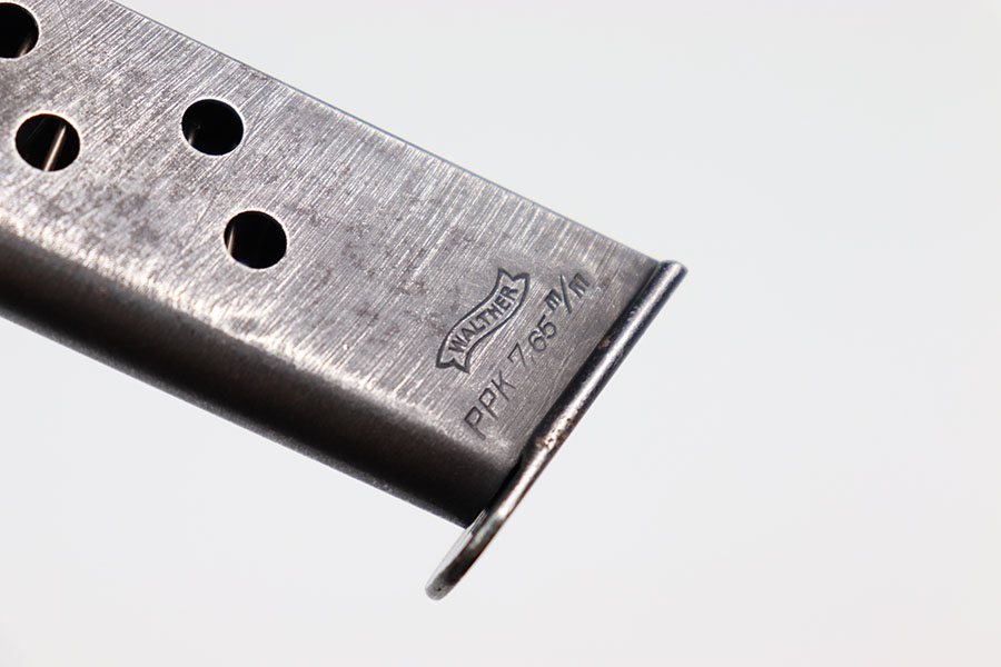 2/22/24 – This is an original wartime Walther PPK Magazine. This magazine has a blued finish that is around 55% remaining due to some light filing throughout. Other than the finish loss, this magazine has no rusting or pitting. The left side of the magazine is stamped with the Walther banner and below stamped the model and caliber, “PPK 7,65 m/m.” The base of the magazine is in excellent+ condition. The spring is strong and functional.