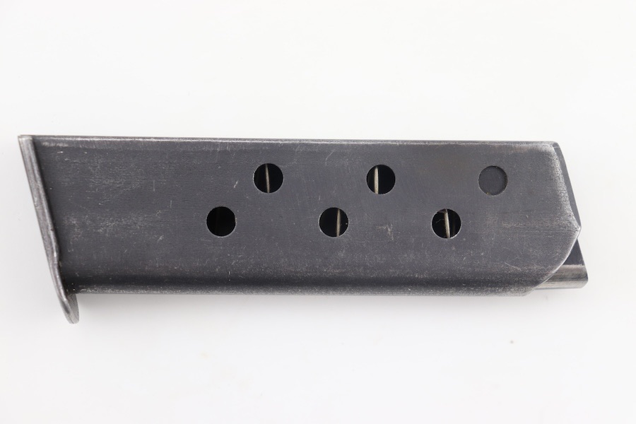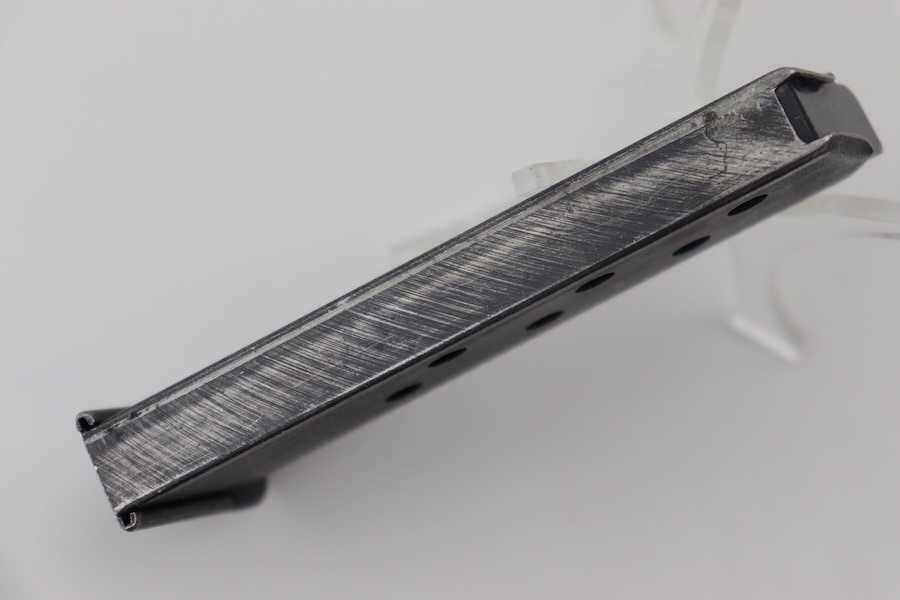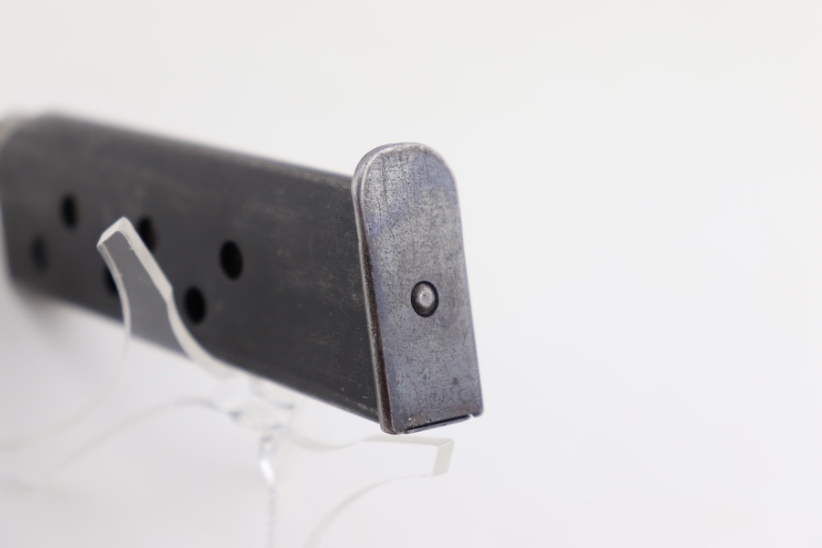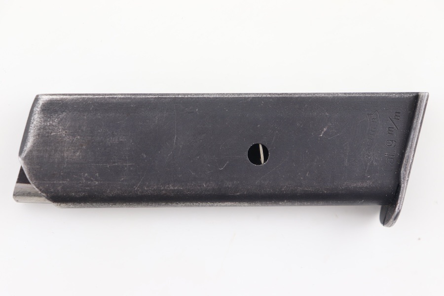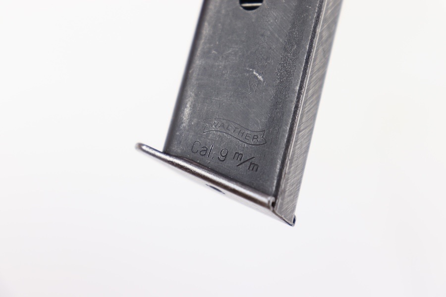 2/27/24 – This is a great condition example of a Walther PP 9mm/(.380) magazine. This is a wartime example, as indicated by the m/m. The body of the magazine has some finish wear, with the majority of bluing loss located on the spine. The left side of the tube is marked with the Walther banner and “CAL. 9m/m” underneath. The spring is strong and fully functional.