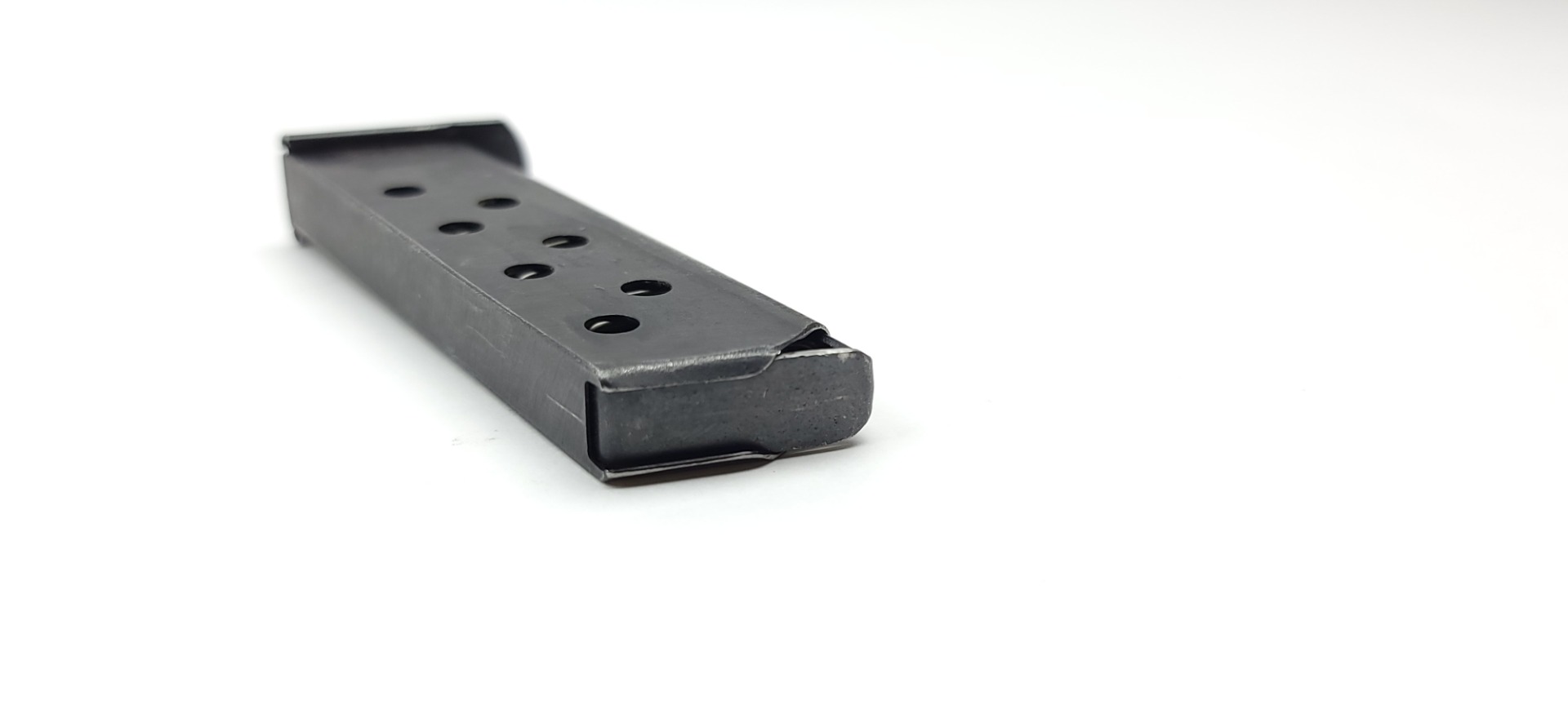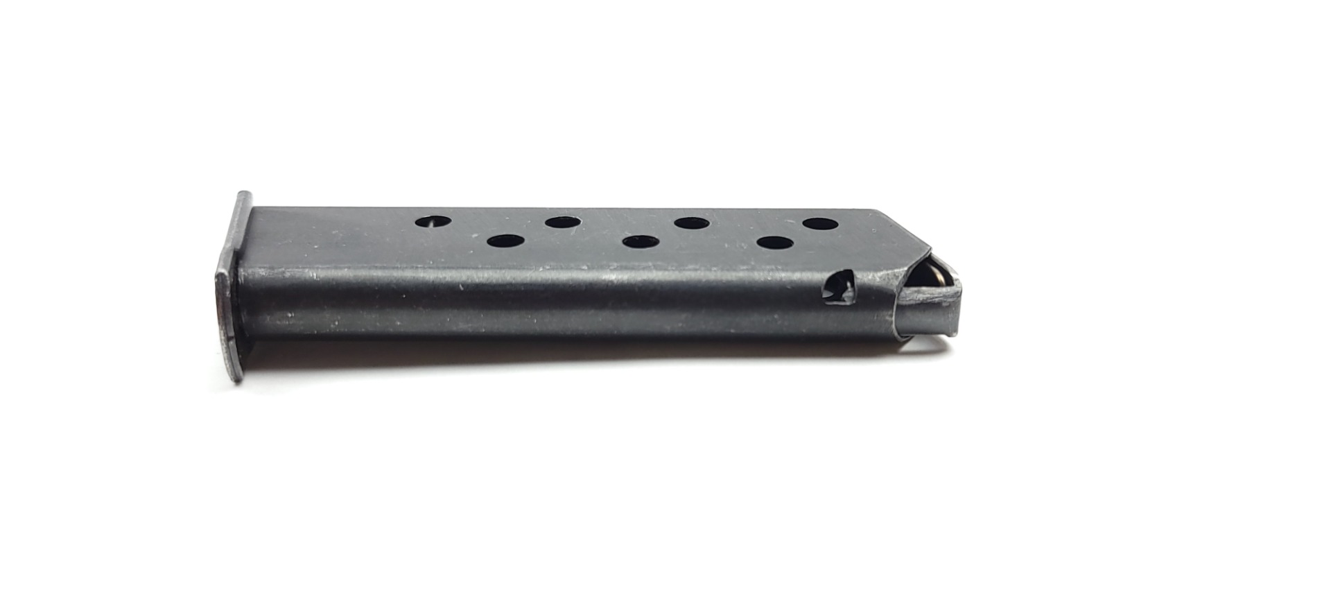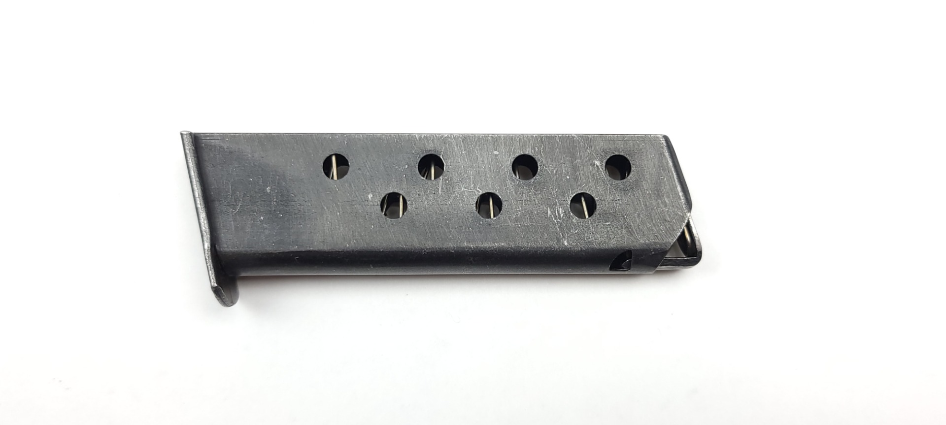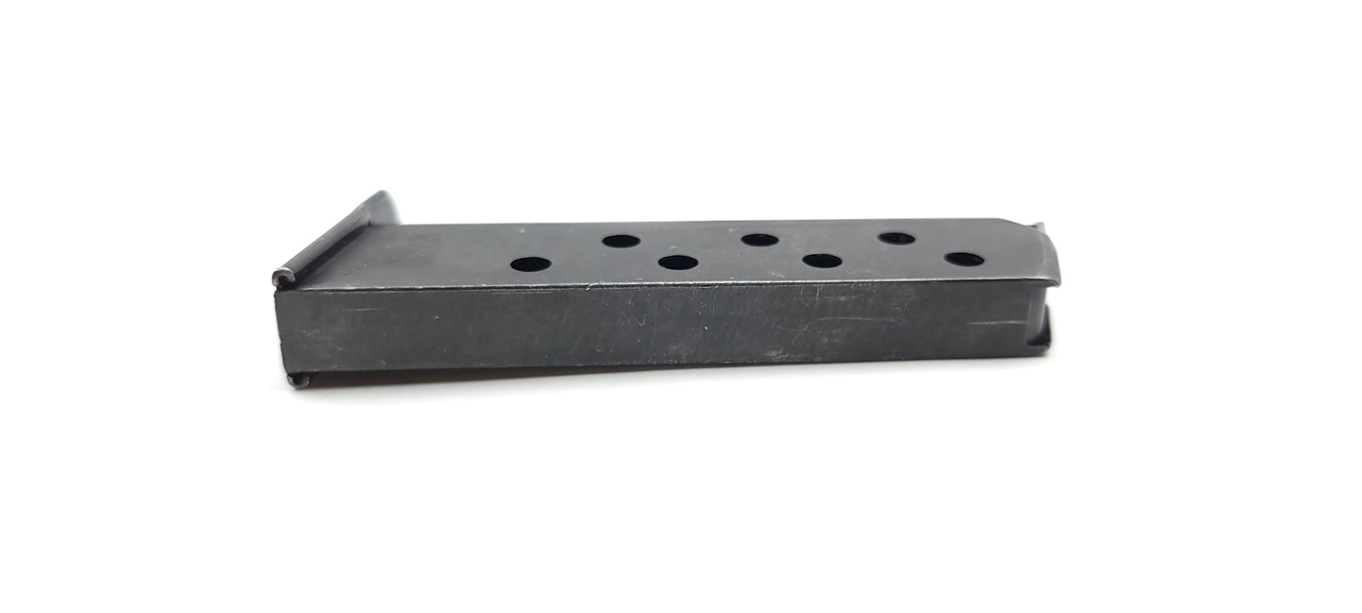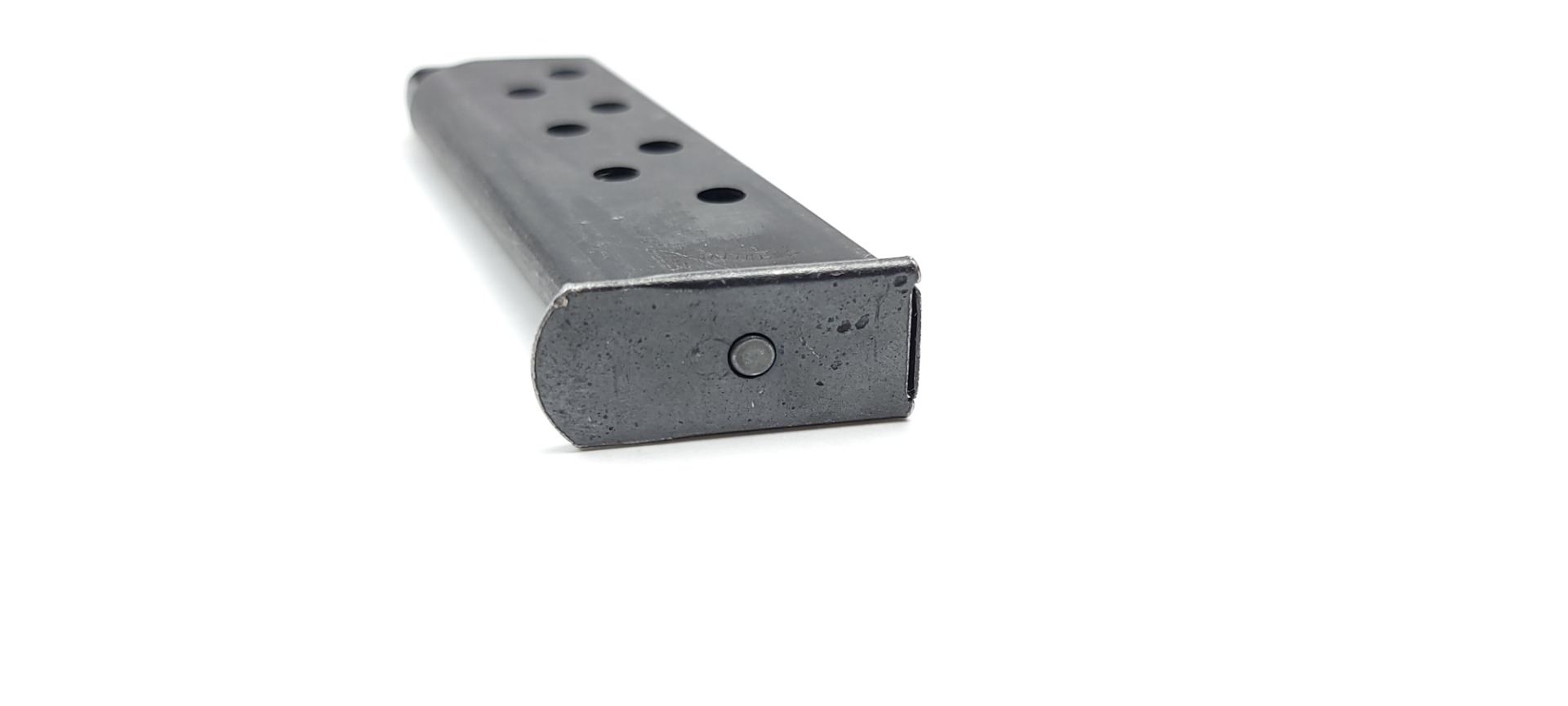 3/9/22 – This is an original WW2 production Walther PP magazine. The magazine has a wartime blued finish with model and caliber information stamped under the Walther banner on one side of the frame. The spring is strong and fully functional. No rust or pitting.