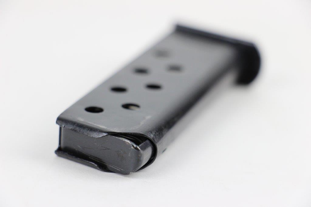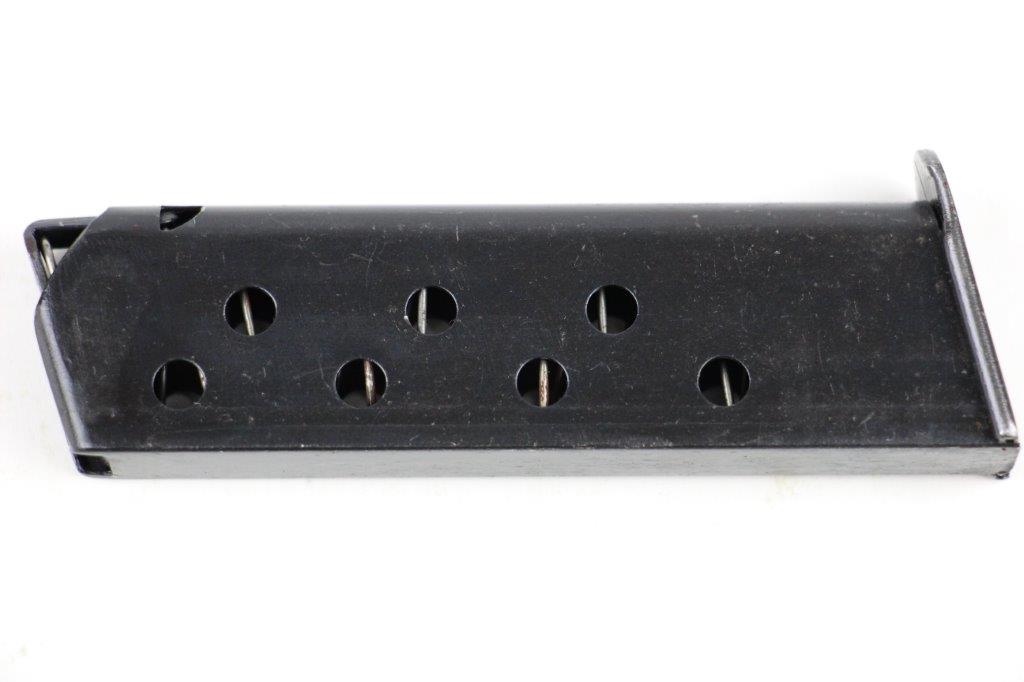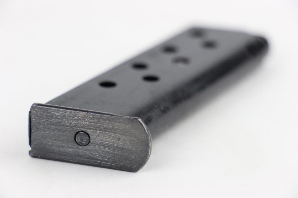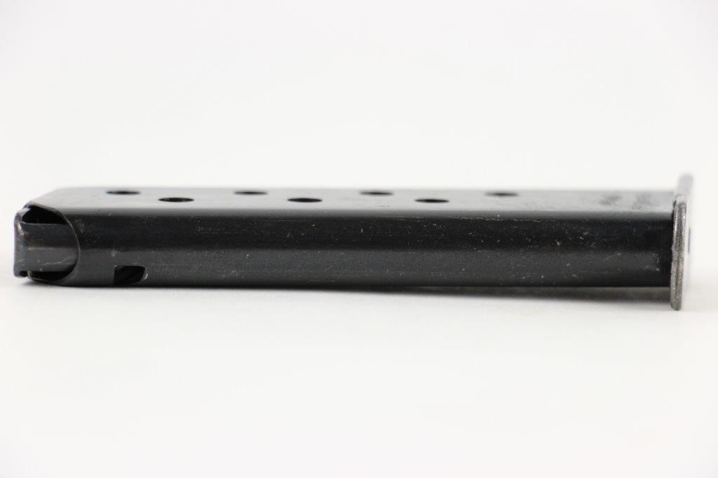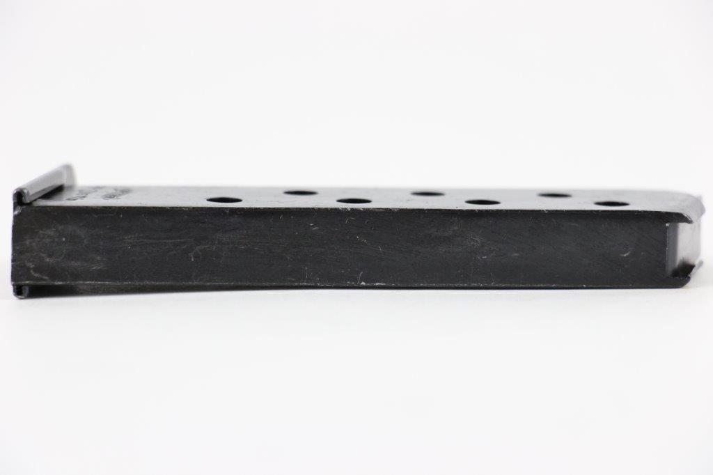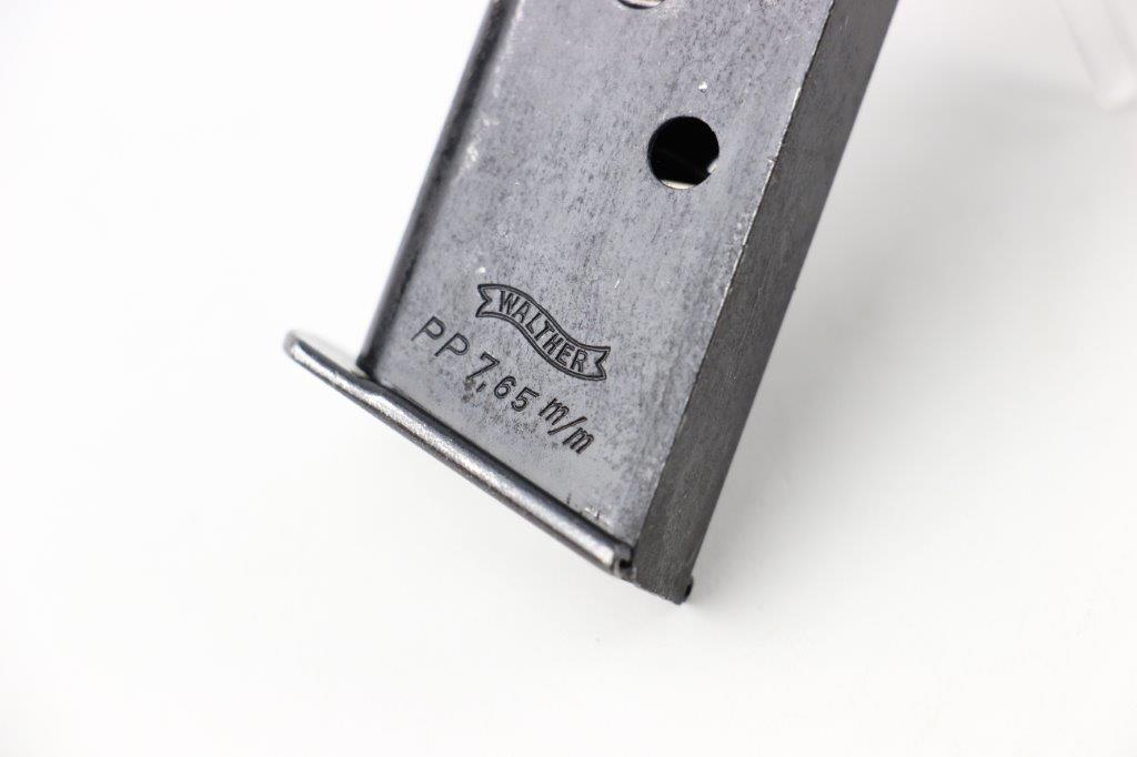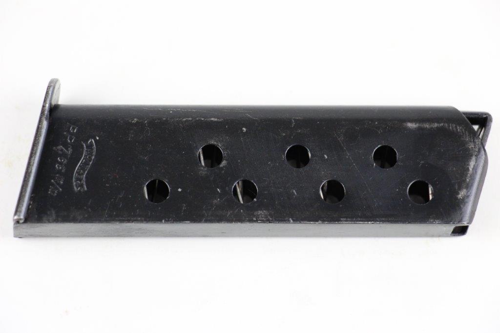 7/5/24 – This is an original WW2 wartime production Walther PP magazine. The magazine is an excellent wartime example with a dull blued finish throughout the tube. The left side is stamped with a Walther banner and model / caliber information underneath. The only setback on this example is the light scratches / buff marks on the baseplate. We’re not sure why these are present, but they’re worth noting and the price is slightly reduced accordingly. The spring is strong and fully functional, and overall this is a very nice example.