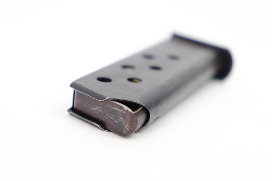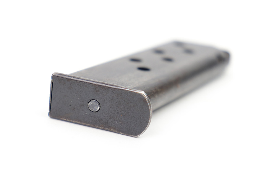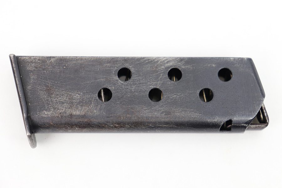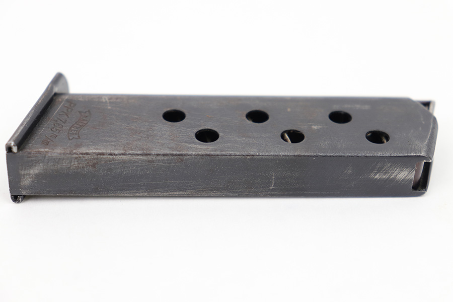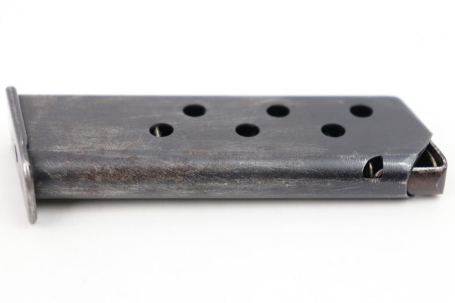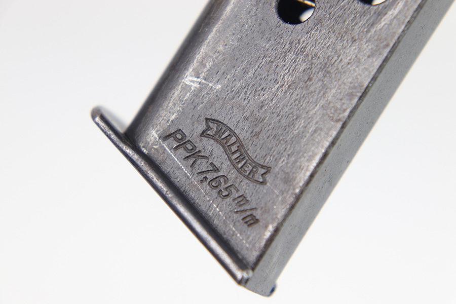 1/20/23 – This is an original WW2 production Walther PPK magazine. The magazine has a dull blued finish with some mild finish loss and surface patina throughout the tube and base. Most of the original finish is intact however, and there’s no rust or pitting. Strong, functional spring.