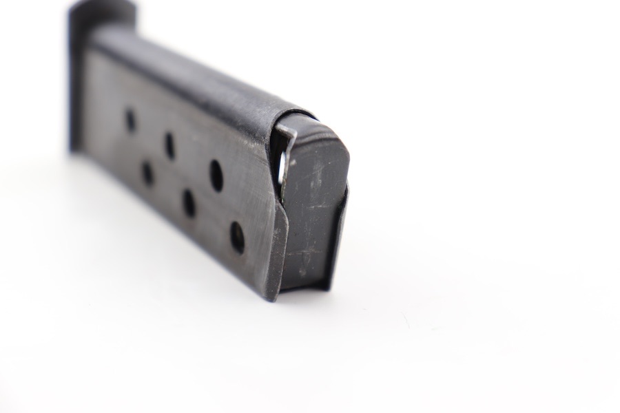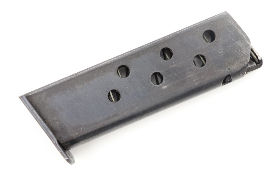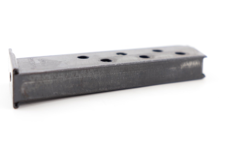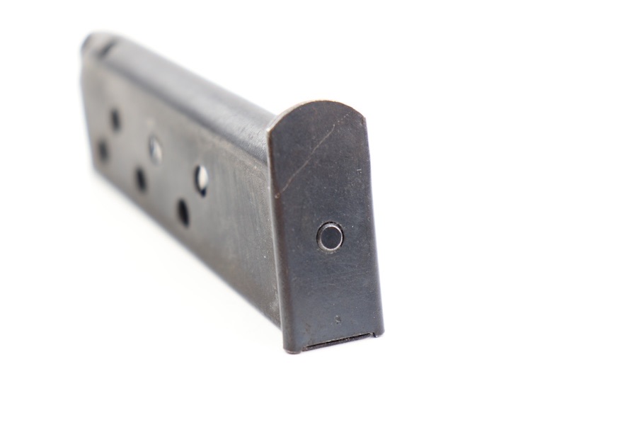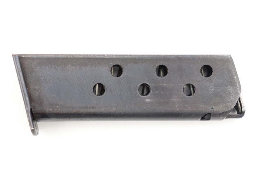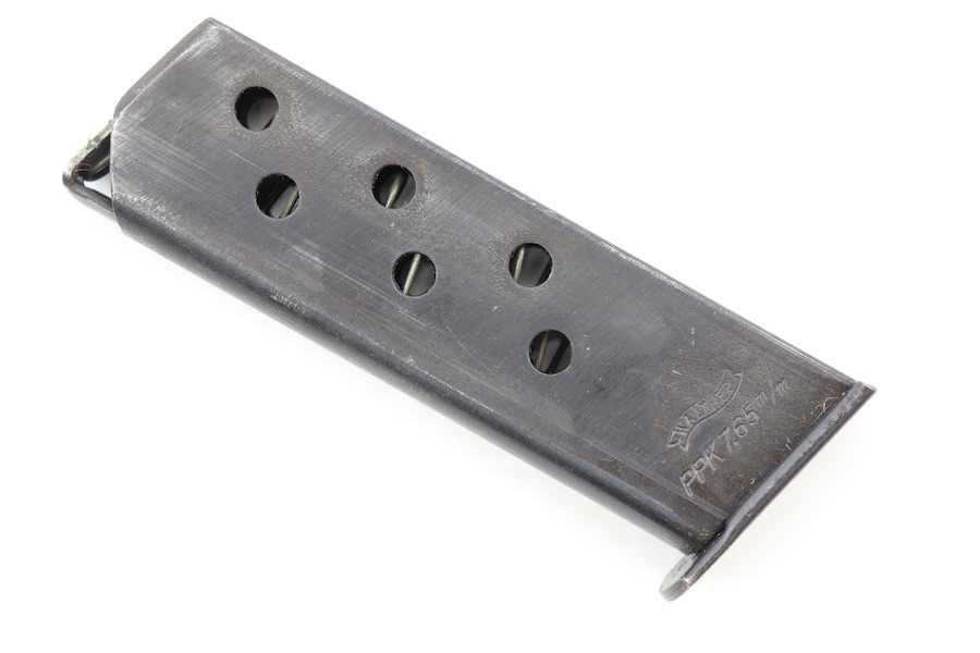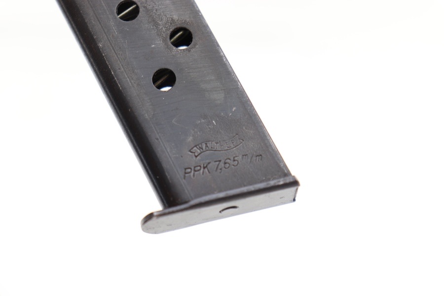 1/30/24 – This is a great condition wartime Walther PPK magazine. There is a light patina and pinpricking on both sides of the body, but the magazine retains most of its bluing finish. Spring is strong and functional. There is no deep pitting or surface rust. The Walther banner and PPK 7.65m/m are on the bottom left side.
