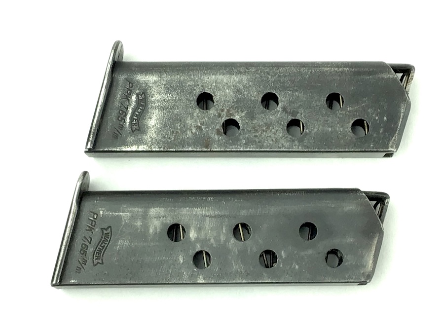 12/31/20 – Set of 2! These are original WW2 era Walther PPK magazines. The left side of the magazines are stamped with the Walther banner and PPK 7,65m/m underneath. There are no other markings. The frames are in great condition with some surface discoloration. The springs are strong and fully functional.