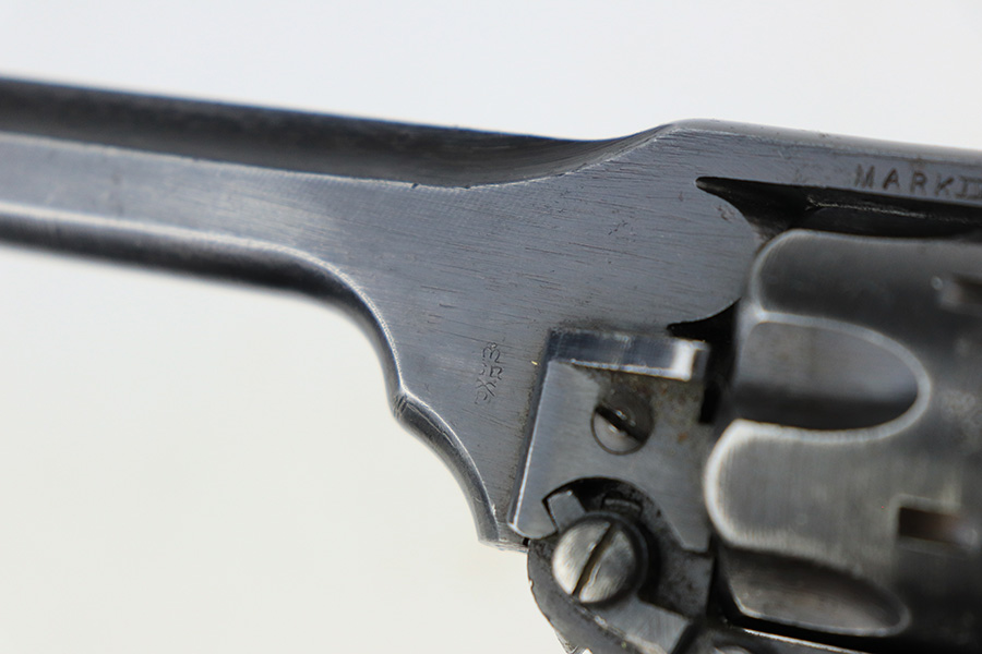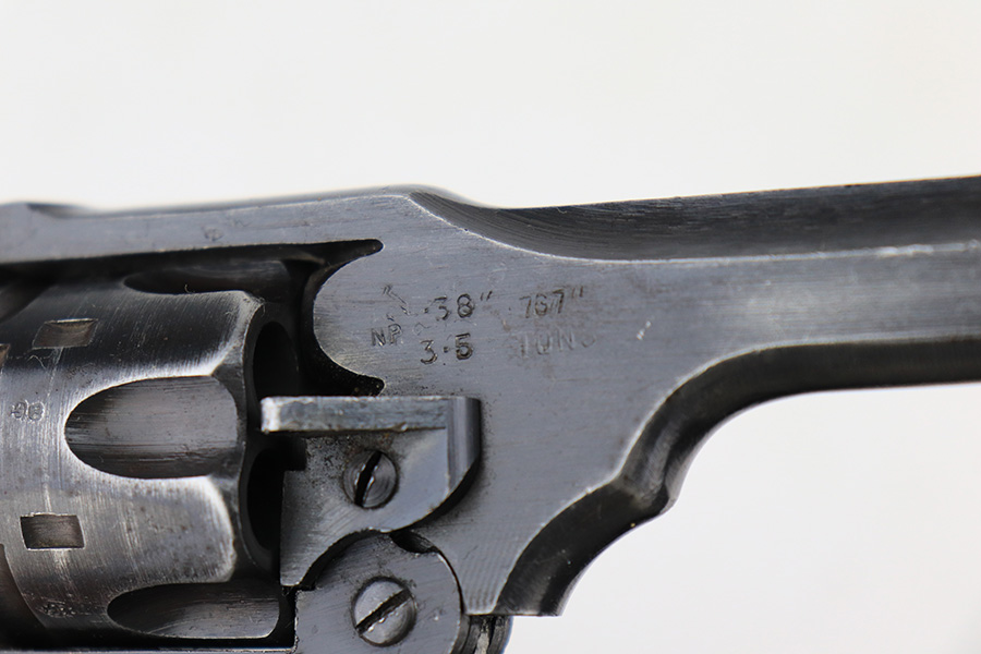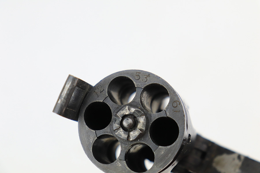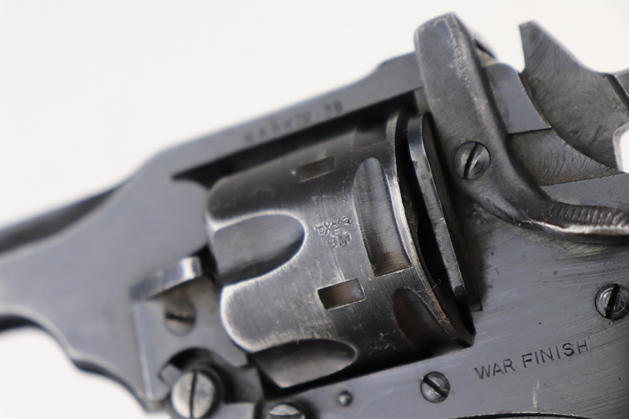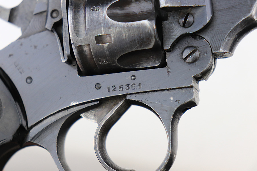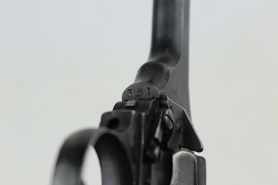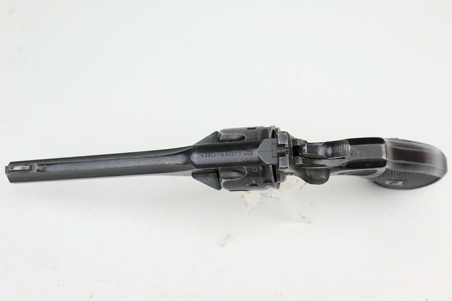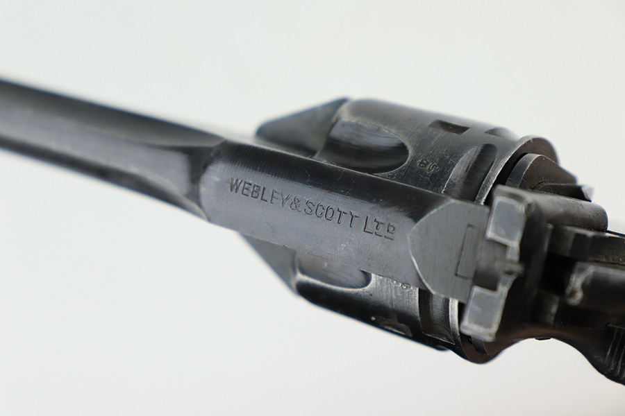 4/21/22 – This is a nice example of a WW2 Webley & Scott Mark IV revolver with matching numbers throughout. Excellent profile view with some wear on the cylinder and around the muzzle, and some general thinning on the grip straps. Minty bore. Grips show standard handling wear but no cracks or chips. No import marks. Good, smooth mechanics. Lanyard ring was removed from the bottom of the frame.