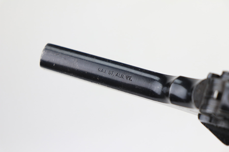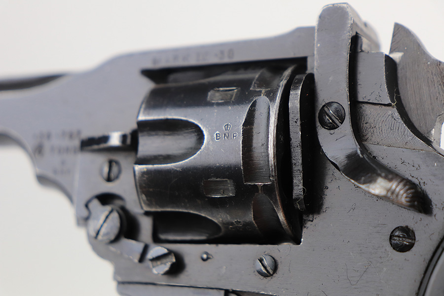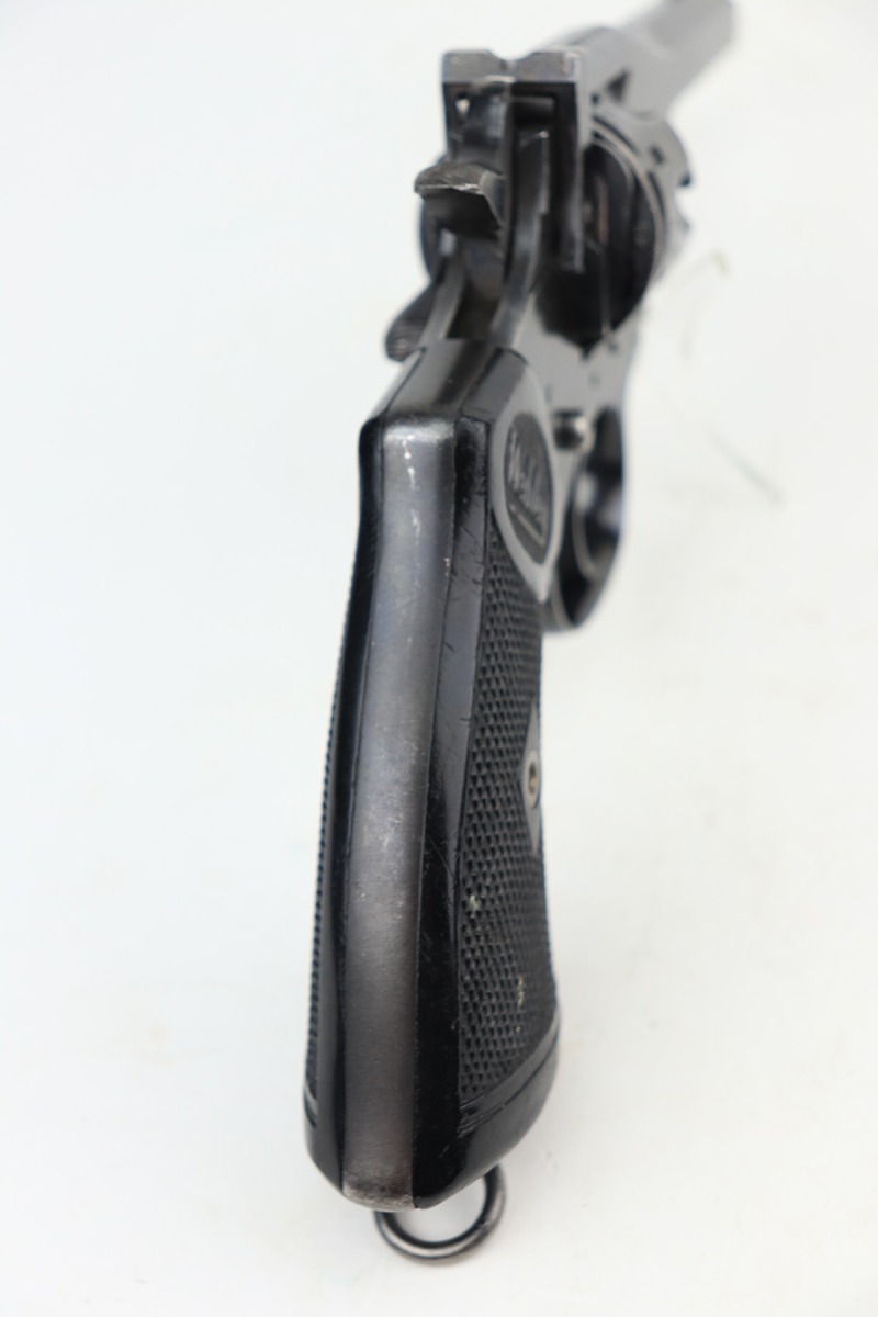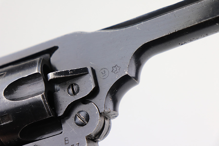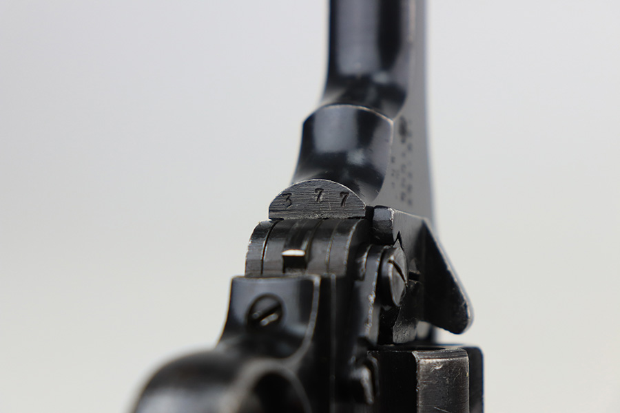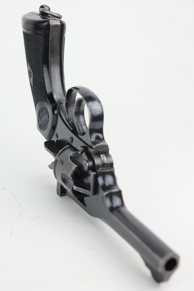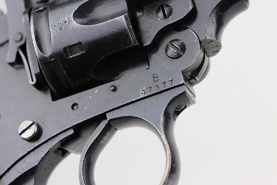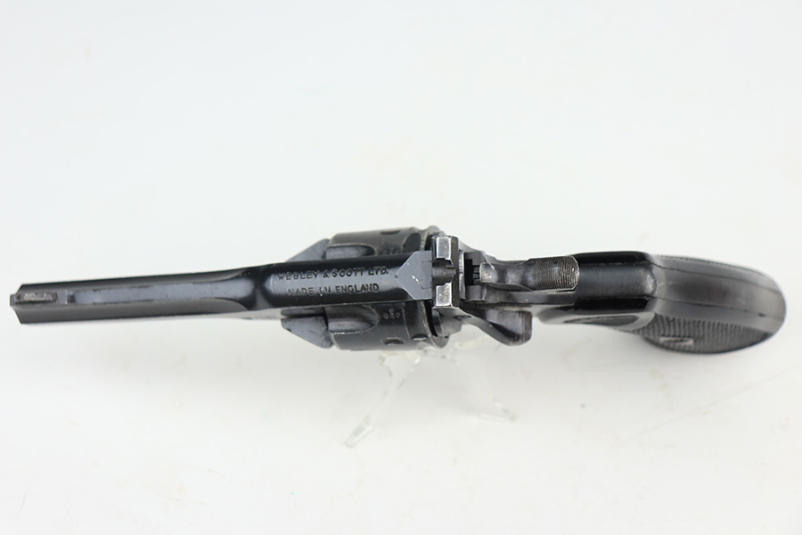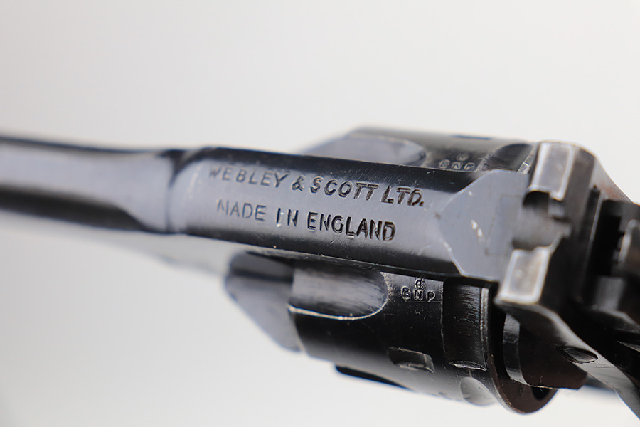 2/3/22 – This is a nice example of a mid-1960s Webley & Scott Mark IV revolver with matching numbers throughout. Excellent profile view with some wear on the cylinder and around the muzzle, but most of the wear is on the grip straps. Minty bore. Grips show standard handling wear but no cracks or chips. Import mark on underside of barrel.