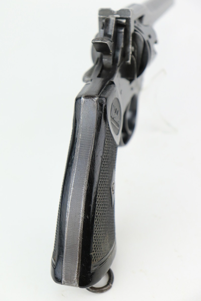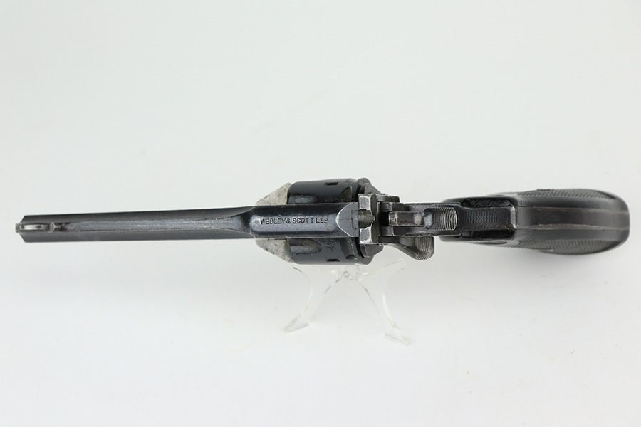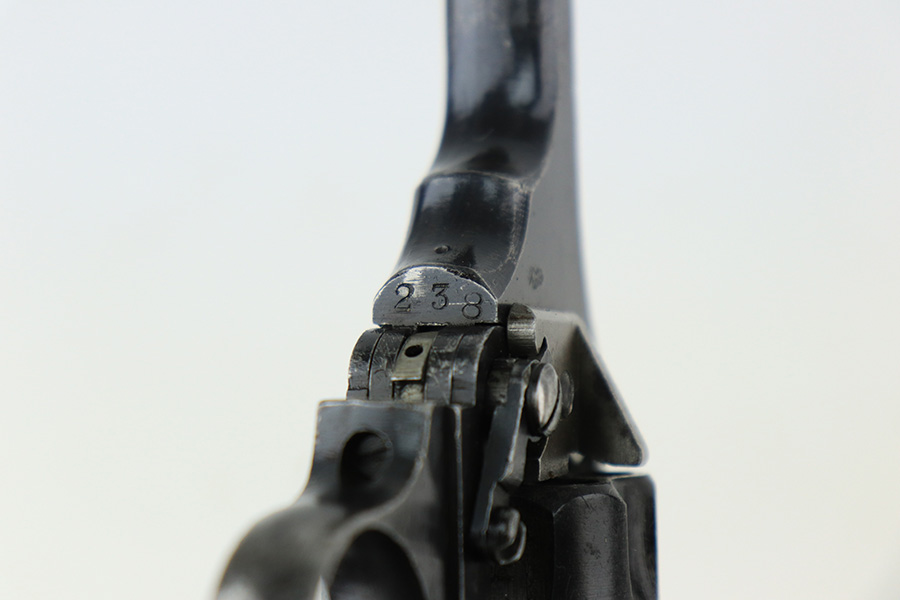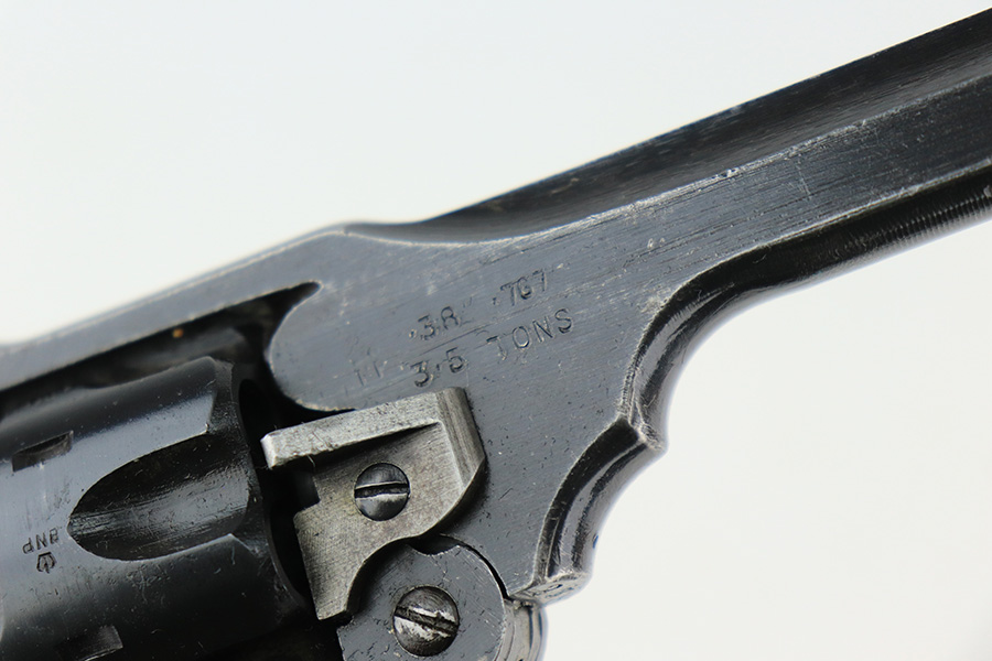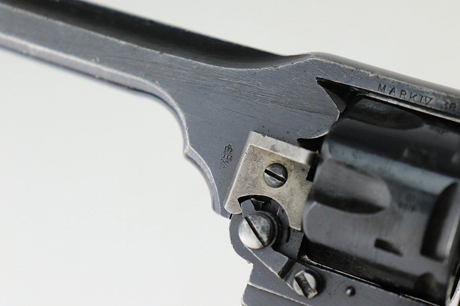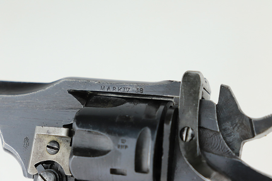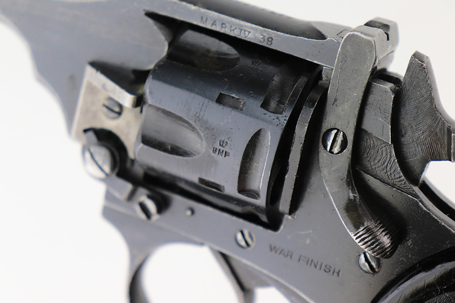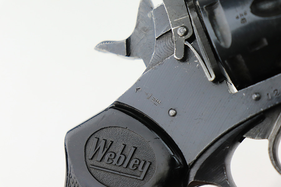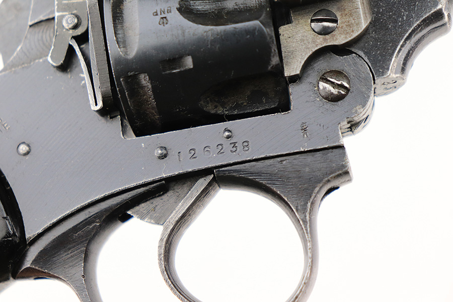 5/18/22 – This is an excellent example of a Webley Mark IV revolver issued to the British military during WW2. The cylinder is mismatched, but it has the proper British military proofs throughout. It has retained about 95-96% of its original wartime finish. There is just minor wear around the muzzle and around the high edges in general. Tiny handling marks here and there. Comes with nice period-correct black bakelite grips – there are minor scuffs throughout and a tiny hairline crack on the left side. Mint bore.