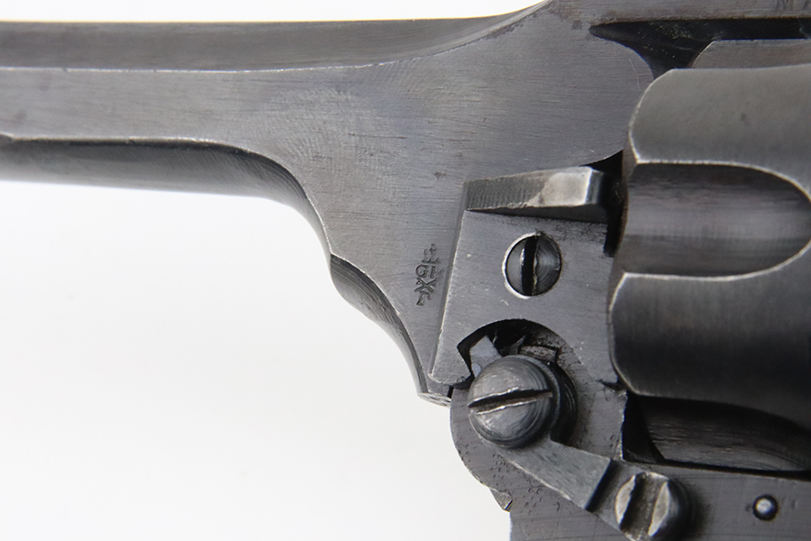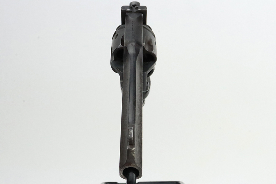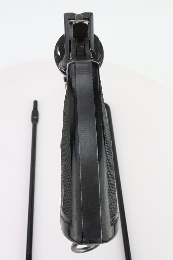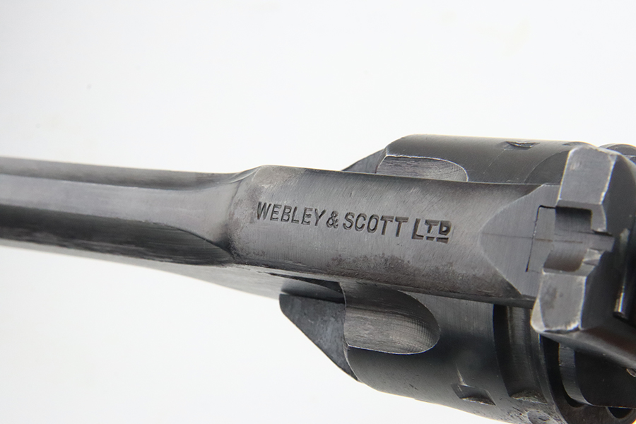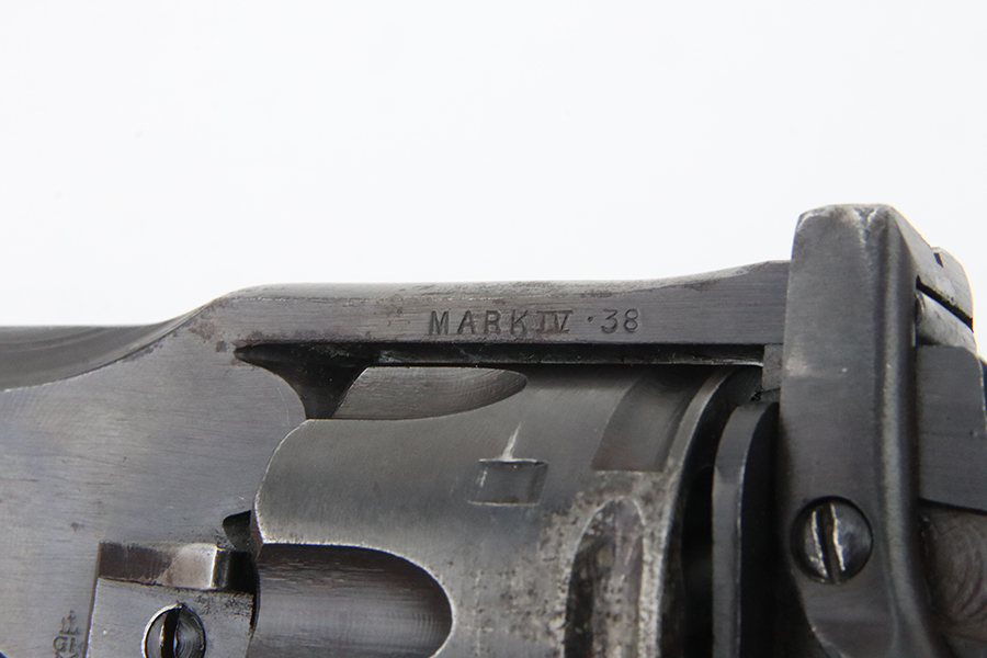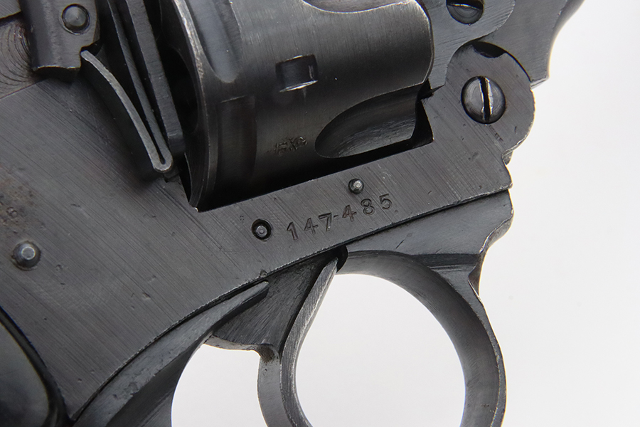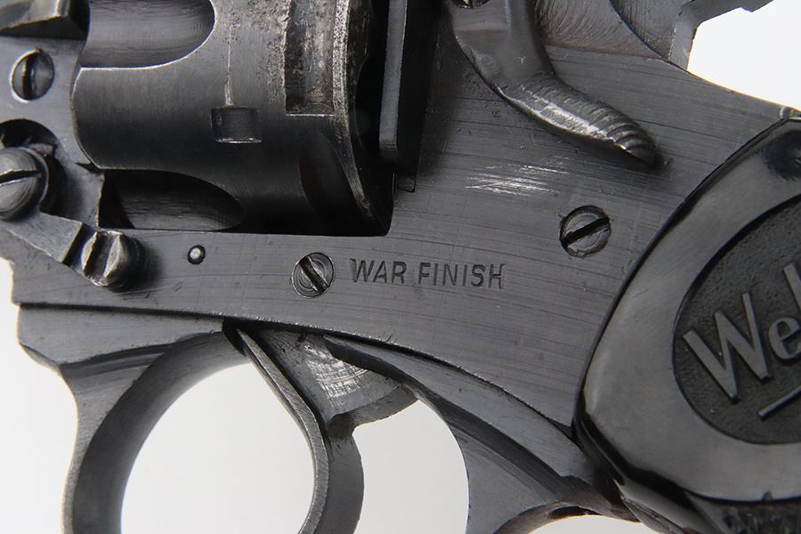 2/28/24 – This is an excellent example of a Webley Mark IV issued to the British military during WW2. All matching with the proper British proofs throughout. Its original finish rates about 96% with general minor high edge wear and a spot of discoloration and pin-pricking on the cylinder. One small ding on the left side of the barrel. Fitted with period-correct black bakelite grips – two blemishes on the left side. Mint bore.