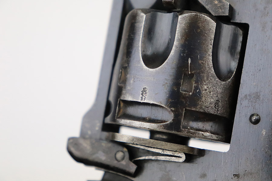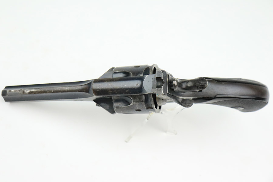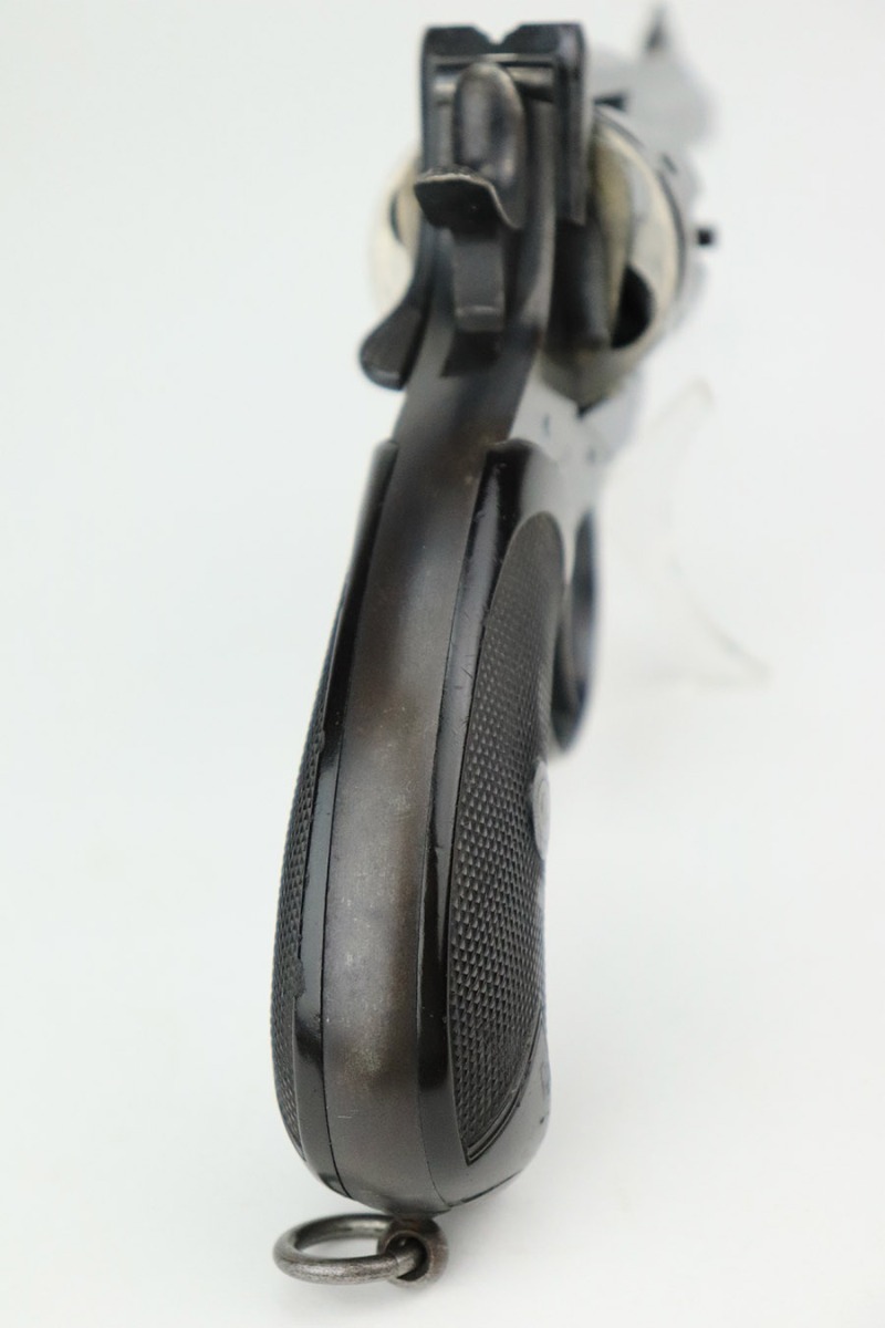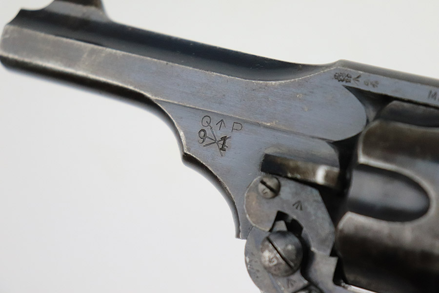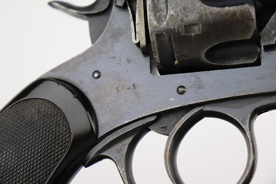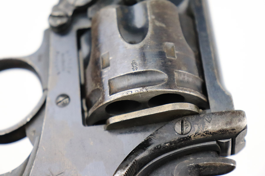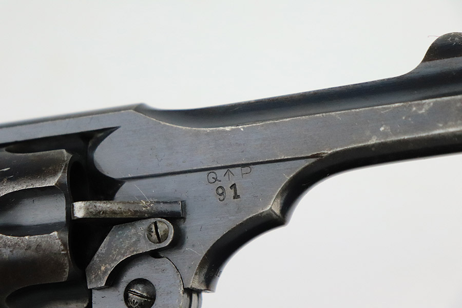 11/30/22 – This is a nice example of a Webley Mark IV revolver that was issued to the British military during WW1. It is all matching and has the proper British military “broad arrow” proofs throughout. Following the war, it was officially removed from British military service, as evidenced by the “opposing arrow” proofs. The gun is also marked “Q^P 91”. This is a police unit marking, indicating that it was then issued to the Queensland Police Department. The cylinder appears to have been shaved to accommodate .45 ACP. The gun has retained roughly 85% of its original bluing. There is muzzle wear and minor wear around the high edges in general and on the cylinder. Minor thinning on the underside of the barrel. Some spotty wear on the underside of the trigger guard. While there isn’t a ton of actual finish loss, there are areas of noticeable discoloration on both sides of the frame. Brown patina on the grip straps. Comes with nice brown bakelite grips – tiny chips on both sides. Minty bore.