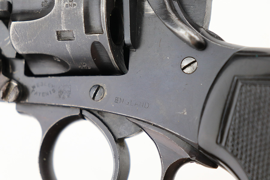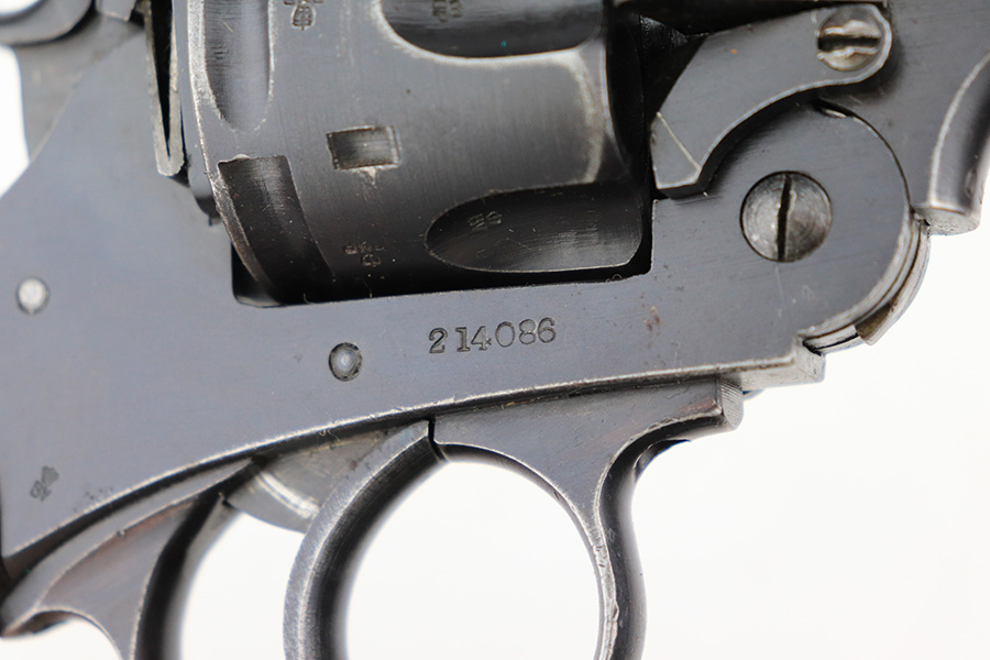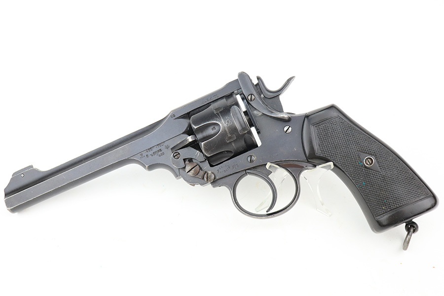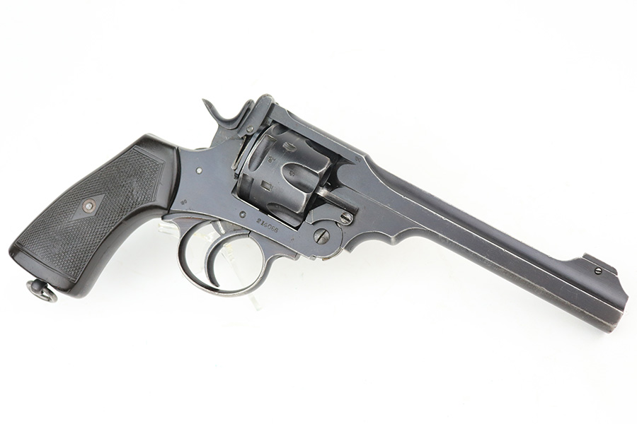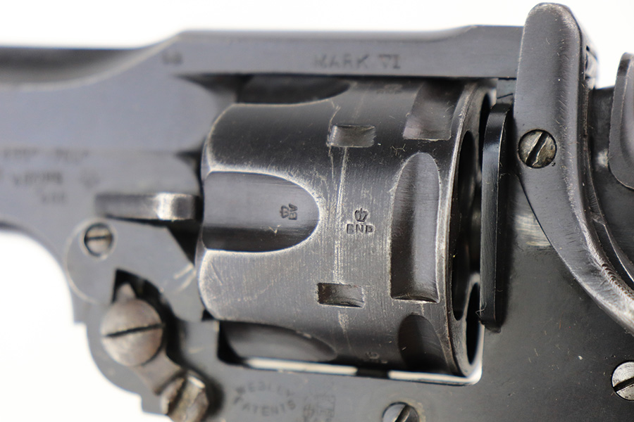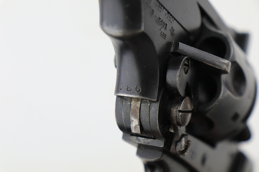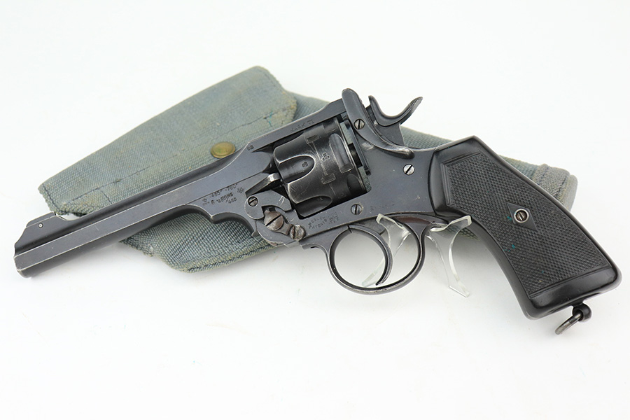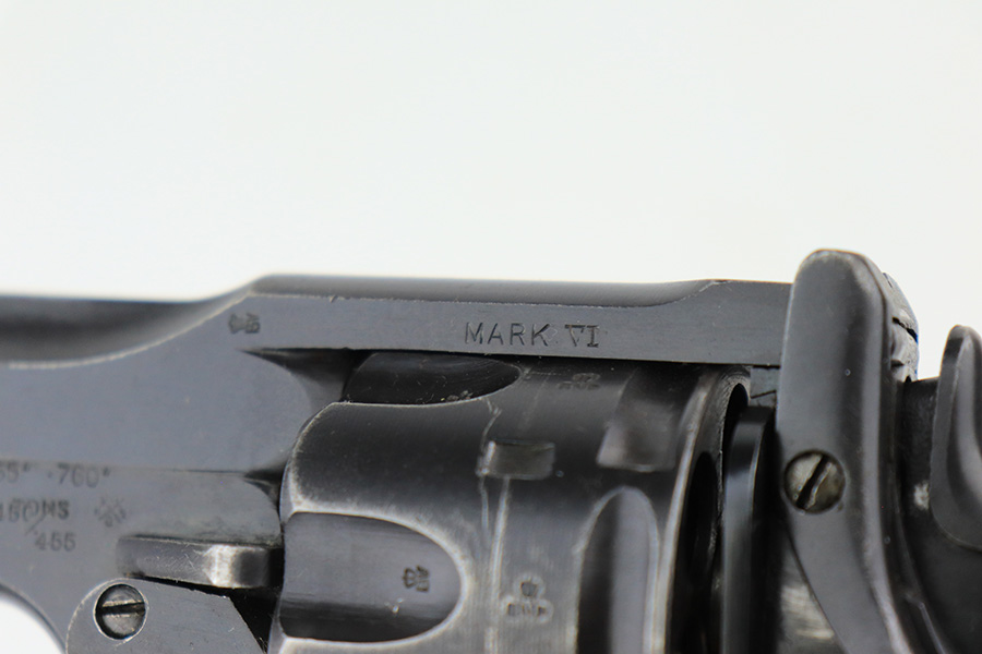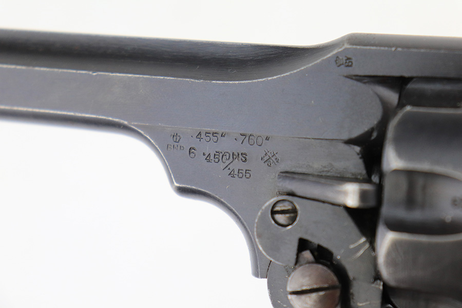 5/20/22 – This is a nice example of a Webley Mark VI revolver issued to the British military during WW1. It is all matching and has the proper British proofs throughout. It comes as a rig with a nice 1951-dated canvas holster. The gun has retained about 91-92% of its bluing. Most of the wear is on the underside of the trigger guard, but there is minor thinning on the grip straps and areas of minor wear around the muzzle and high edges in general. Light roll marks on the cylinder. Comes with bakelite grips that have noticeable gouges on the bottom edges. The bore has decent rifling, but there is frosting throughout. The cylinder has been shaved to accept .45 ACP cartridges with moon clips, not the original .455 Webley.