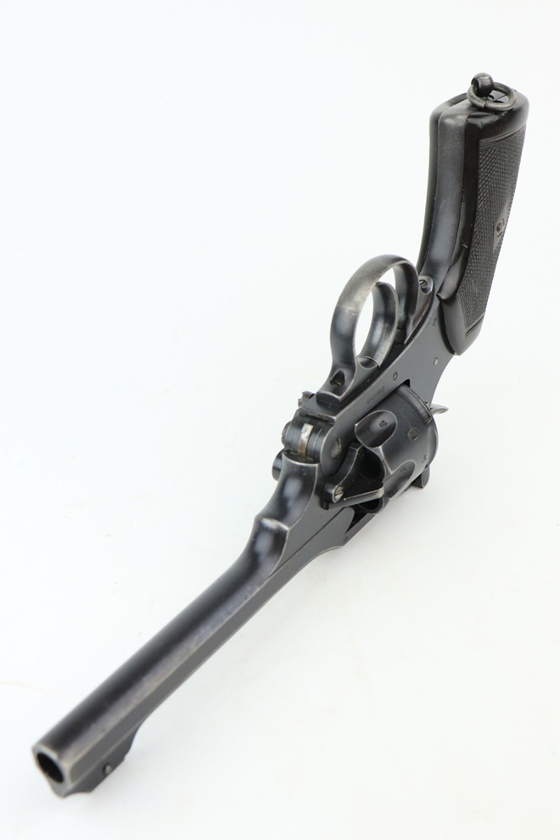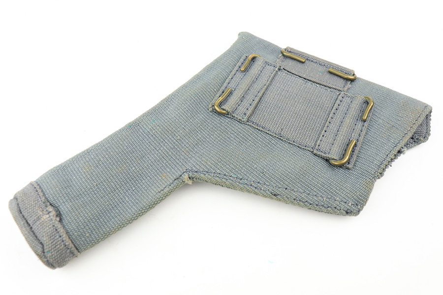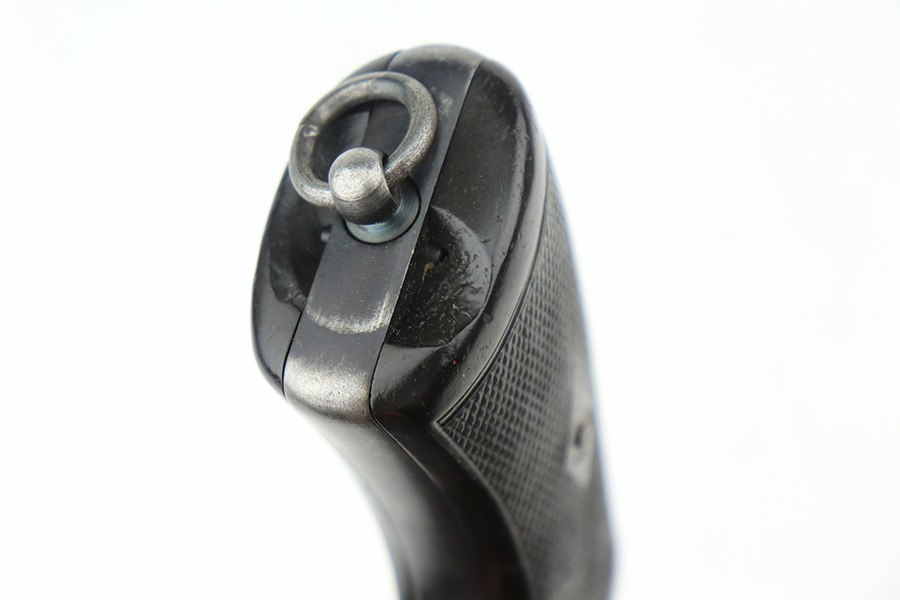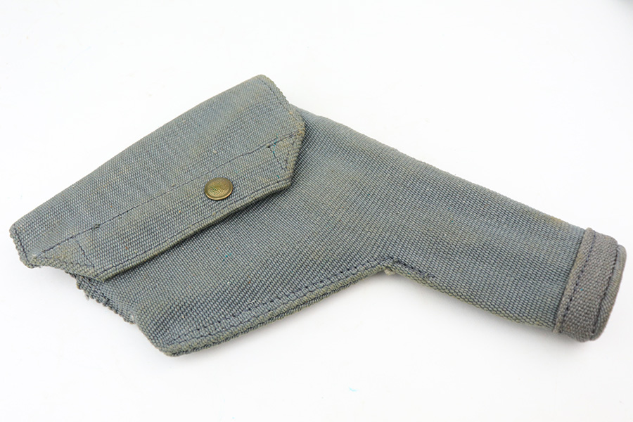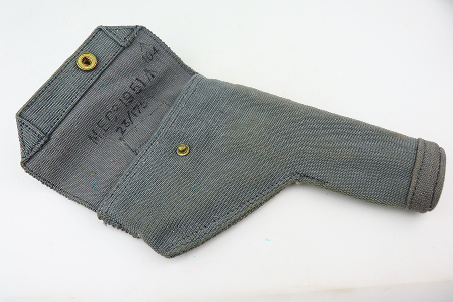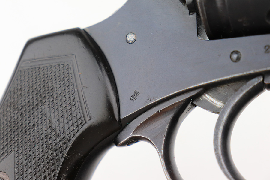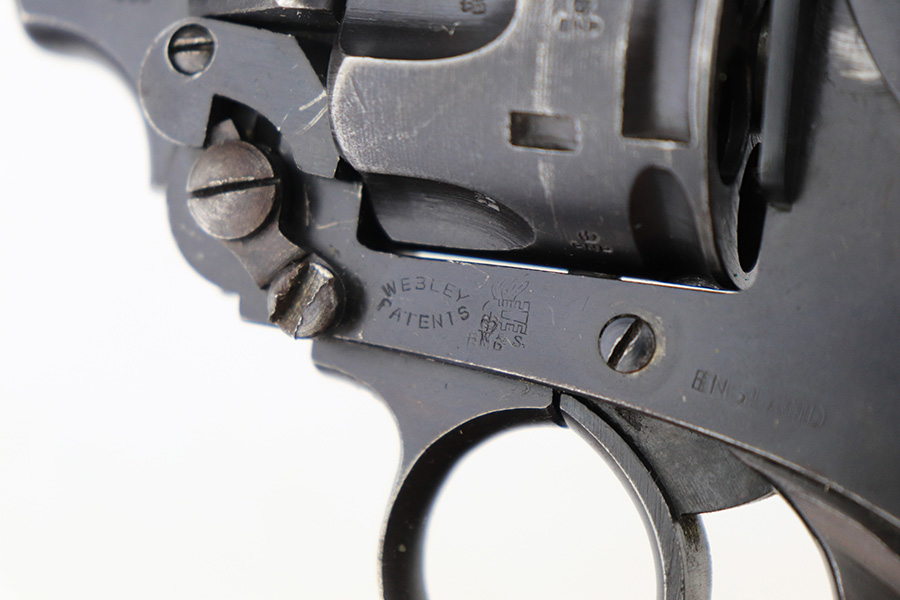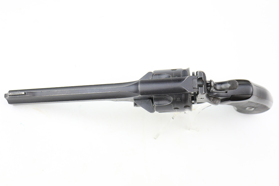 5/20/22 – This is a nice example of a Webley Mark VI revolver issued to the British military during WW1. It is all matching and has the proper British proofs throughout. It comes as a rig with a nice 1951-dated canvas holster. The gun has retained about 91-92% of its bluing. Most of the wear is on the underside of the trigger guard, but there is minor thinning on the grip straps and areas of minor wear around the muzzle and high edges in general. Light roll marks on the cylinder. Comes with bakelite grips that have noticeable gouges on the bottom edges. The bore has decent rifling, but there is frosting throughout. The cylinder has been shaved to accept .45 ACP cartridges with moon clips, not the original .455 Webley.