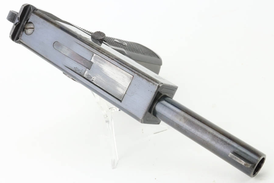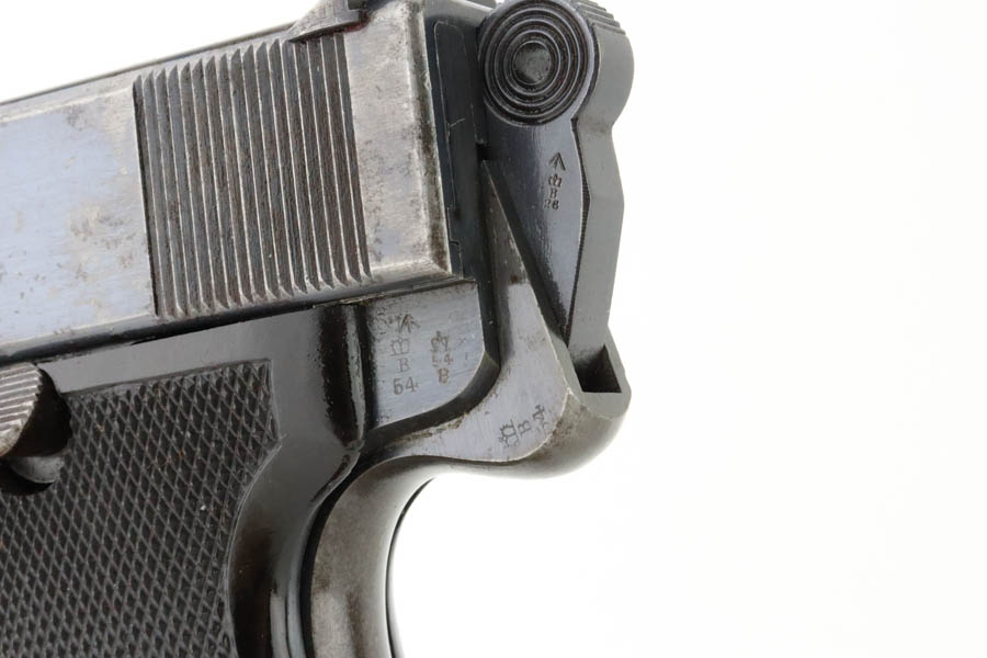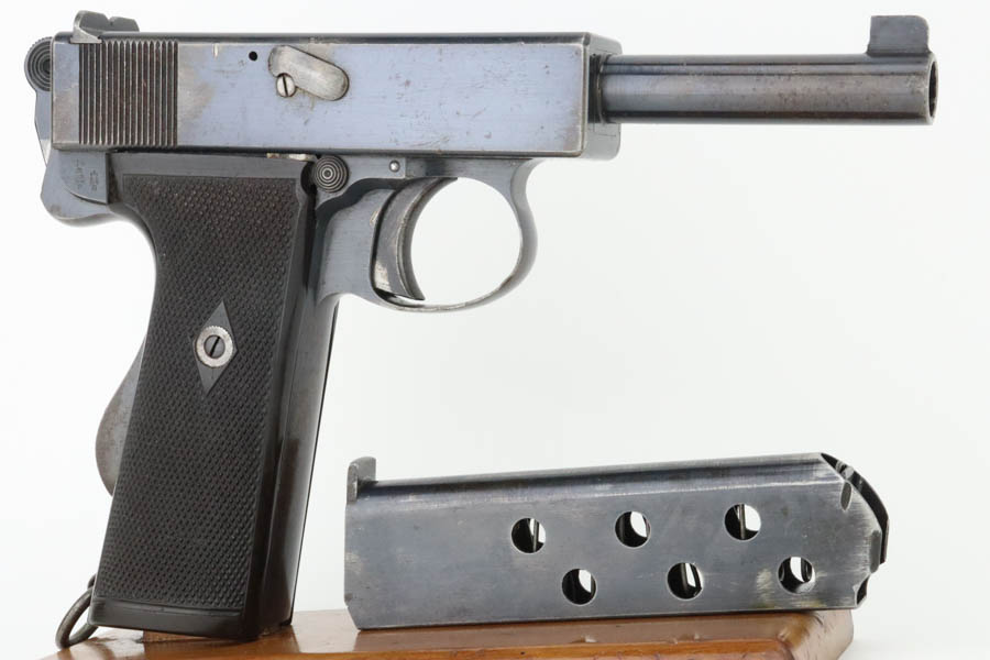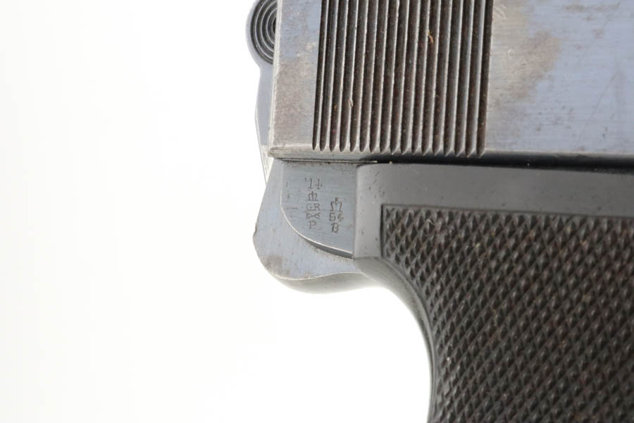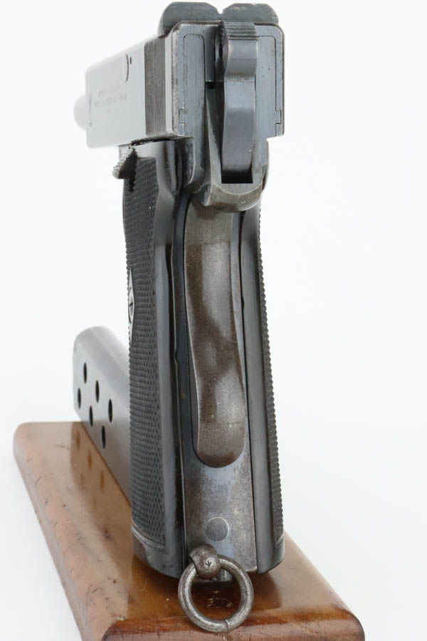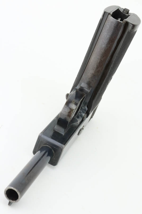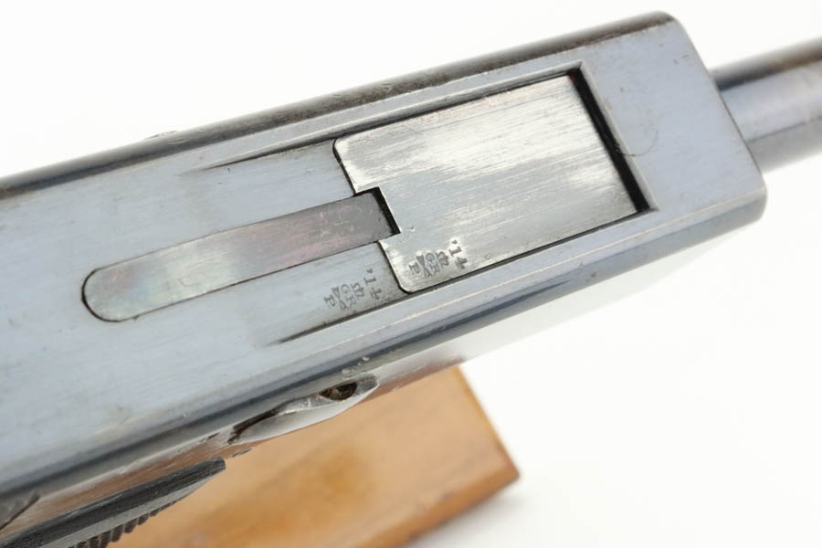 6/17/24 – This is an all original, matching and correct WWI example of Webley semi-auto pistol in .455 caliber. It is one of the Royal Navy contract guns, marked with an “N” for Navy on the left side of the slide. The pistol is also 1913 dated (date of manufacture). It has the proper proofs throughout. It’s original high polish finish rates roughly 85%. There is general high edge wear, wear along the barrel, and wear on the grip straps. Areas of light spotty oxidation throughout. Fitted with period-correct black bakelite grips and comes with one proper magazine. Excellent bore.